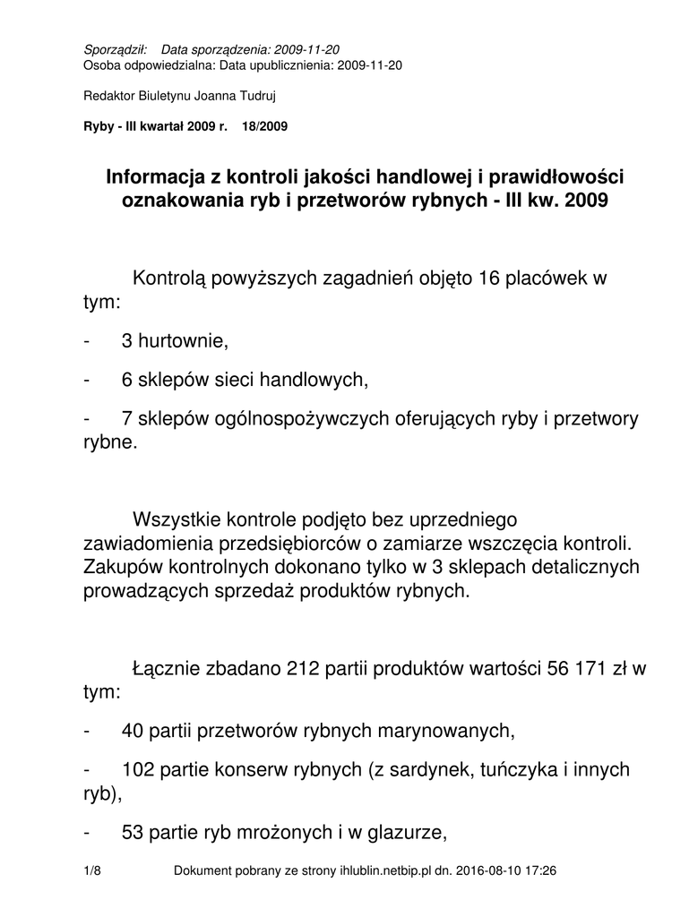 Sporządził: Data sporządzenia: 2009-11-20 Osoba odpowiedzialna: Data upublicznienia: 2009-11-20 Redaktor Biuletynu Joanna Tudruj Ryby - III kwartał 2009 r. 18/2009 Informacja z kontroli jakości handlowej i prawidłowości oznakowania ryb i przetworów rybnych - III kw. 2009 Kontrolą powyższych zagadnień objęto 16 placówek w tym: - 3 hurtownie, - 6 sklepów sieci handlowych, 7 sklepów ogólnospożywczych oferujących ryby i przetwory rybne. Wszystkie kontrole podjęto bez uprzedniego zawiadomienia przedsiębiorców o zamiarze wszczęcia kontroli. Zakupów kontrolnych dokonano tylko w 3 sklepach detalicznych prowadzących sprzedaż produktów rybnych. Łącznie zbadano 212 partii produktów wartości 56 171 zł w tym: - 40 partii przetworów rybnych marynowanych, 102 partie konserw rybnych (z sardynek, tuńczyka i innych ryb), 1/8 53 partie ryb mrożonych i w glazurze, Dokument pobrany ze strony ihlublin.netbip.pl dn. 2016-08-10 17:26 - 8 partii ryb wędzonych, - 9 partii innych produktów rybnych. I. Jakość produktów rybnych W czasie kontroli do badań laboratoryjnych pobrano próby łącznie z 35 partii artykułów rybnych wartości 4739 zł. Przeprowadzone badania wykazały, że wymaganiom zawartym w deklaracjach producentów i oznakowaniu produktu nie odpowiadały 2 partie przetworów rybnych wartości 203 zł tj.: • „Filet z makreli w oleju” 175g ze względu na zaniżoną masę ryby w 1 próbce (86g ± 2g zamiast 105g). Ponadto stwierdzono zaniżoną zawartość soli w 2 próbkach (0,8% ± 0,1%, 0,8% ± 0,1% zamiast 1-2,5%) co nie obniża jakości badanego produktu; • „Filety śledziowe po giżycku” 220g ze względu na zaniżona masę ryby w 1 próbce (114g ± 2g zamiast 120g). Ponadto zakwestionowano jakość handlową 2 partii przetworów rybnych wartości 134 zł z uwagi na cechy jakościowe niezgodne ze specyfikacjami producentów tj.: 2/8 Dokument pobrany ze strony ihlublin.netbip.pl dn. 2016-08-10 17:26 • „Płaty śledziowe w zalewie estragonowej” 400g z uwagi na zawyżoną kwasowość ogólną w przeliczeniu na kwas octowy w jednej próbce (1,37% ± 0,3% zamiast 0,8% ± 0,4%); • „Śledź w sosie pomidorowym VASCO” 170g wyprodukowany dla sieci „BIEDRONKA” z uwagi na niewłaściwe cechy organoleptyczne (1 próbka) tj. nietypowy smak, z lekko metalicznym posmakiem oraz niewłaściwy wygląd (widoczne znaczne uszkodzenia skóry i popękanie brzuszków, sos o niejednolitej barwie z dużą ilością rozproszonych cząstek skóry z ryb); Niezależnie od powyższego próbki konserwy rybnej „Śledź w sosie pomidorowym” 180g/90g wykazały zawyżoną masę składników stałych (130g, 133g, 120 zamiast 90g) i zawyżoną zawartość sosu w stosunku do masy netto deklarowanej (58%, 58%, 60% zamiast 25-50%). Stwierdzone odchylenia nie obniżają jakości badanego produktu. Ponadto pobrane do badań próby ryb i przetworów rybnych poddano ocenie laboratoryjnej w zakresie zgodności ilości rzeczywistej z deklarowaną na etykietach przez producentów. Badaniem objęto 117 sztuk opakowań jednostkowych produktów rybnych i uwag nie wniesiono. II. Prawidłowość oznakowania produktów rybnych 3/8 Dokument pobrany ze strony ihlublin.netbip.pl dn. 2016-08-10 17:26 Sprawdzono prawidłowość oznakowania przez producentów 212 partii ryb i przetworów rybnych wartości 56171 zł. Zakwestionowano 23 partie wartości 1927 zł ze względu na: • Całkowity brak oznaczeń handlowych na 14 partiach ryb i przetworów rybnych oferowanych luzem (w tym 12 partiach ryb mrożonych i 2 asortymentach marynat) w sklepach rybnych w Kraśniku oraz w Łęcznej. W postępowaniu wyjaśniającym ustalono, że oznaczenia handlowe znajdowały się na opakowaniach zbiorczych, które usunięto ze sklepu po umieszczeniu produktów rybnych w urządzeniach chłodniczych. Powyższe towary wycofano z obrotu. • Brak informacji dotyczącej ilościowej zawartości glazury lub ryby w miejscu ekspozycji 9 partii ryb mrożonych glazurowanych oferowanych luzem (filet z soli, tilapii, ogony z łososia, płaty śledziowe, nototenia tusza, steki z łososia, kostka z mintaja, sola płaty, halibut tusza). Powyższe nieprawidłowości stwierdzono w 2 placówkach detalicznych tj.w sklepie rybnym w Świdniku i sklepie rybnym w Łęcznej. W czasie kontroli uwidoczniono brakujące informacje przy oferowanych rybach mrożonych glazurowanych. III. 4/8 Przestrzeganie okresów ważności. Dokument pobrany ze strony ihlublin.netbip.pl dn. 2016-08-10 17:26 Aktualność terminów ważności sprawdzano we wszystkich kontrolowanych placówkach obejmując badaniem 198 partii artykułów rybnych wartości 55 343 zł. Nieprawidłowości stwierdzono w hurtowni w Kraśniku, gdzie w obrocie zastano 1 partię przeterminowanej konserwy „Śledź w sosie pomidorowym” 180g/90g wartości 12 zł. Zakwestionowany produkt został wycofany z obrotu i zniszczony. III. Warunki i sposób przechowywania Sposób i warunki przechowywania ryb i przetworów rybnych zgodne były z deklaracjami producentów zamieszczonymi na etykietach opakowań jednostkowych oraz przepisami rozporządzenia Parlamentu Europejskiego i Rady (WE) nr 852/2004 z dnia 29.04.2004r w sprawie higieny środków spożywczych (Dz. U. L. 139 z 30.04.2004 ze zm.). IV. Orzeczenia lekarskie do celów sanitarno-epidemiologicznych W sklepie spożywczym w Chełmie jedna osoba zatrudniona przy obrocie produktami spożywczymi posiadała nieaktualną książeczkę zdrowia do celów sanitarno-epidemiologicznych. 5/8 Dokument pobrany ze strony ihlublin.netbip.pl dn. 2016-08-10 17:26 V. Identyfikacja kontrolowanego przedsiębiorcy Wszyscy przedsiębiorcy posiadali aktualne decyzje dotyczące rejestracji i zatwierdzania zakładów przez organy nadzoru sanitarnego, a określony w nich zakres i rodzaj działalności zgodny był ze stanem faktycznym i z wpisem do ewidencji lub rejestru sądowego. VI. Inne zagadnienia W 3 sklepach dokonano zakupów kontrolnych przetwor