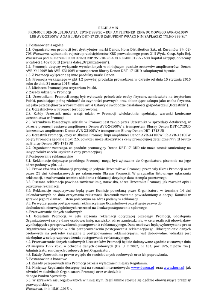 REGULAMIN PROMOCJI DENON „BLURAY ZA JEDYNE 999 ZŁ – KUP AMPLITUNER KINA DOMOWEGO AVR-‐X4100W LUB AVR-‐X3100W, A ZA BLURAY DBT-‐1713UD ZAKUPIONY WRAZ Z NIM ZAPŁACISZ TYLKO 999 ZŁ” 1. Postanowienia ogólne 1.1. Organizatorem promocji jest dystrybutor marki Denon, Horn Distribution S.A., ul. Kurantów 34, 02-‐ 703 Warszawa, wpisana do rejestru przedsiębiorców KRS prowadzonego przez XIII Wydz. Gosp. Sądu Rej. Warszawa pod numerem 0000109020, NIP 951-‐18-‐28-‐408, REGON 012977688, kapitał akcyjny, opłacony w całości 1 452 000 zł (zwana dalej „Organizatorem”). 1.2. Promocja dotyczy wyłącznie wymienionych w niniejszym punkcie zestawów amplitunerów: Denon AVR-‐X4100W lub AVR-‐X3100W z transportem Bluray Denon DBT-‐1713UD zakupionymi łącznie. 1.3. Z Promocji wyłączone są inne produkty marki Denon. 1.4. Promocja wskazanego w pkt 1.2 powyżej produktu prowadzona w okresie od dnia 15 stycznia 2015 roku do dnia 31 marca 2015 roku. 1.5. Miejscem Promocji jest terytorium Polski. 2. Zasady udziału w Promocji 2.1. Uczestnikami Promocji mogą być wyłącznie pełnoletnie osoby fizyczne, zamieszkałe na terytorium Polski, posiadające pełną zdolność do czynności prawnych oraz dokonujące zakupu jako osoba fizyczna, nie jako przedsiębiorca w rozumieniu art. 4 Ustawy o swobodzie działalności gospodarczej („Uczestnik”). 2.2. Uczestnictwo w Promocji jest dobrowolne. 2.3. Każdy Uczestnik może wziąć udział w Promocji wielokrotnie, spełniając warunki konieczne uczestnictwa w Promocji. 2.5. Warunkiem koniecznym udziału w Promocji jest zakup przez Uczestnika w sprzedaży detalicznej, w okresie promocji zestawu amplitunera Denon AVR-‐X4100W z transportem Bluray Denon DBT-‐1713UD lub zestawu amplitunera Denon AVR-‐X3100W z transportem Bluray Denon DBT-‐1713UD 2.6. Uczestnik Promocji, który w Okresie Promocji kupi amplituner Denon AVR-‐X4100W lub AVR-‐X3100W objęty Promocją zgodnie z pkt. 2.5. powyżej, może skorzystać z ceny promocyjnej detalicznej 999 zł brutto na Bluray Denon DBT-‐1713UD 2.7. Organizator zastrzega, że produkt promocyjny Denon DBT-‐1713UD nie może zostać zamieniony na inny produkt w celu uzyskania ceny promocyjnej. 3. Postępowanie reklamacyjne 3.1. Reklamacje dotyczące przebiegu Promocji mogą być zgłaszane do Organizatora pisemnie na jego adres podany w pkt. 1.1. 3.2. Prawo złożenia reklamacji przysługuje jedynie Uczestnikowi Promocji przez cały Okres Promocji oraz przez 21 dni kalendarzowych po zakończeniu Okresu Promocji. W przypadku listownego zgłaszania reklamacji, o zachowaniu terminu składania reklamacji decyduje data stempla pocztowego. 3.3. Pisemna reklamacja powinna zawierać imię, nazwisko, adres Uczestnika Promocji jak również opis i przyczynę reklamacji. 3.4. Reklamacje rozpatrywane będą przez Komisję powołaną przez Organizatora w terminie 14 dni kalendarzowych od dnia otrzymania reklamacji. Uczestnik zostanie powiadomiony o decyzji Komisji w sprawie jego reklamacji listem poleconym na adres podany w reklamacji. 3.5. Po wyczerpaniu postępowania reklamacyjnego Uczestnikowi przysługuje prawo do dochodzenia nieuwzględnionych roszczeń na drodze postępowania sądowego. 4. Przetwarzanie danych osobowych 4.1. Uczestnik Promocji, w celu złożenia reklamacji dotyczącej przebiegu Promocji, udostępnia Organizatorowi swoje dane osobowe: imię, nazwisko, adres zamieszkania, w celu realizacji obowiązków wynikających z przeprowadzenia postępowania reklamacyjnego. Dane osobowe będą wykorzystane przez Organizatora wyłącznie w celu przeprowadzenia postępowania reklamacyjnego. Udostępnienie danych osobowych na potrzeby związane z postępowaniem reklamacyjnym, jest dobrowolne, jednakże jest niezbędne w celu przeprowadzenia postępowania reklamacyjnego. 4.2. Przetwarzanie danych osobowych Uczestników Promocji będzie dokonywane zgodnie z ustawą z dnia 29 sierpnia 1997 roku o ochronie danych osobowych (Dz. U. z 2002, nr 101, poz. 926, z późn. zm.). Administratorem danych osobowych jest Organizator. 4.3. Każdy Uczestnik ma prawo wglądu do swoich danych osobowych oraz ich poprawiania. 5. Postanowienia końcowe 5.1. Zasady przeprowadzania Promocji określa wyłącznie niniejszy Regulamin. 5.2. Niniejszy Regulamin dostępny jest na stronach internetowych: www.denon.pl oraz www.horn.pl jak również w siedzibach Organizatora Promocji oraz w siedzibie danego Punktu Sprzedaży. 5.3. W sprawach nieuregulowanych w niniejszym Regulaminie stosuje się ogólnie obowiązujące przepisy prawa polskiego. Warszawa, dnia 15.01.2015 r.