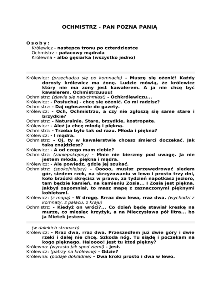 OCHMISTRZ - PAN POZNA PANIĄ Osoby: Królewicz - następca tronu po czterdziestce Ochmistrz - pałacowy mądrala Królewna - albo gęsiarka (wszystko jedno) Królewicz: (przechadza się po komnacie) - Muszę się ożenić! Każdy dorosły królewicz ma żonę. Ludzie mówią, że królewicz który nie ma żony jest kawalerem. A ja nie chcę być kawalerem. Ochmistrzuuuu! Ochmistrz: (zjawia się natychmiast) - Ochkrólewiczu... Królewicz: - Posłuchaj - chcę się ożenić. Co mi radzisz? Ochmistrz: - Daj ogłoszenie do gazety. Królewicz: - Och, Ochmistrzu, a czy nie zgłoszą się same stare i brzydkie? Ochmistrz: - Naturalnie. Stare, brzydkie, kostropate. Królewicz: - Ależ ja chcę młodą i piękną. Ochmistrz: - Trzeba było tak od razu. Młoda i piękna? Królewicz: - I mądra. Ochmistrz: - Oj, ty w kawalerstwie chcesz śmierci doczekać. Jak taką znajdziesz? Królewicz: - A od czego mam ciebie? Ochmistrz: (zaniepokojony) - Mnie nie bierzmy pod uwagę. Ja nie jestem młoda, piękna i mądra. Królewicz: - Ale powiedz, gdzie jej szukać. Ochmistrz: (spokojniejszy) - Ooooo, musisz przewędrować siedem gór, siedem rzek, na skrzyżowaniu w lewo i prosto trzy dni, koło brzózki skręcisz w prawo, za tydzień napotkasz jezioro, tam będzie kamień, na kamieniu Zosia... I Zosia jest piękna. Jakbyś zapomniał, to masz mapę z zaznaczonymi pięknymi kobietami. Królewicz: (z mapą) - W drogę. Rrraz dwa lewa, rraz dwa. (wychodzi z komnaty, z pałacu, z kraju) Ochmistrz: - Kiedyż on wróci?... Co dzień będę stawiał kreskę na murze, co miesiąc krzyżyk, a na Mieczysława pół litra... bo ja Mietek jestem. (w dalekich stronach) Królewicz: - Rraz dwa, rraz dwa. Przeszedłem już dwie góry i dwie rzeki i dalej nie chcę. Szkoda nóg. Tu siądę i poczekam na kogo pięknego. Haloooo! Jest tu ktoś piękny? Królewna: (wyrasta jak spod ziemi) - Jest. Królewicz: (patrzy na królewnę) - Gdzie? Królewna: (podaje dokładnie) - Dwa kroki prosto i dwa w lewo. Królewicz: (liczy kroki) - Raz dwa, raz... odsuń sie!... (odsuwa królewnę) dwa. (w wyznaczonym miejscu zastaje siebie) A JA! Królewna: - Czego szukasz w tych stronach? Królewicz: - Żony. Królewna: - Uciekła? Królewicz: - Jeszcze nie. Królewna: (ze znawstwem) - To ucieknie. Królewicz: - Na razie szukam kandydatki. Królewna: (ożywiona) - To interesujące. Bo ja szukam męża. Gdyby się okazało, że twoja żona i mój mąż to my, sprawa się upraszcza. Królewicz: - (patrzy) To nie my! Królewna: - Wiem! Ja też jestem brzydka... prawie jak ty. TYM BARDZIEJ APELUJĘ: WEŹMY ŚLUB! To nieludzkie mieszać w to jeszcze dwie osoby! Królewicz: (macha ręką) - A dobra. Ty jesteś młoda, ja inteligentny. Coś pięknego po drodze się kupi. Chodźmy! Mieszkam za dwiema górami i dwiema rzekami. (idą za dwie góry i dwie rzeki) Ochmistrz: - Tymczasem w pałacu... NUDA! Łał... Królewicz i Królewna: (śpiewają z daleka i coraz bliżej) - Spoza gór i rzek, wyszliśmy na brzeg... JESTEŚMY! (i faktycznie są) Ochmistrz: (szczerze zdziwiony) - Już? Królewicz: - Wzięliśmy ślub przed chwilą. Ksiądz trochę wybrzydzał, że dwoje takich brzydkich naraz to niepoważne, ale się zgodził. Ochmistrz: (przyglądając się królewnie, odciąga królewicza na bok) Królewiczu, co to za chałtura... gdzież twoje ideały... Królewicz: - Ochmistrzu, ideały - piękna rzecz, ale ta 7 góra i 7 rzeka cholernie daleko! KONIEC (przyziemny) Autorrrr: Władek Sikorrrra