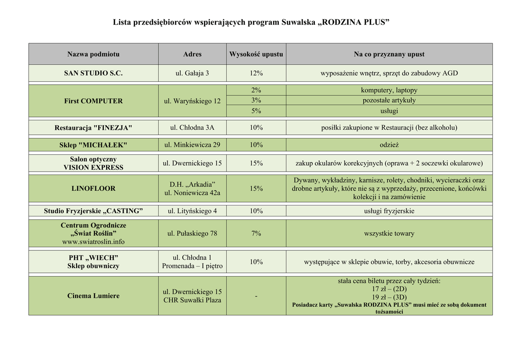Lista przedsiębiorców wspierających program Suwalska „RODZINA PLUS” Nazwa podmiotu Adres Wysokość upustu Na co przyznany upust SAN STUDIO S.C. ul. Gałaja 3 12% wyposażenie wnętrz, sprzęt do zabudowy AGD First COMPUTER ul. Waryńskiego 12 2% 3% 5% komputery, laptopy pozostałe artykuły usługi Restauracja "FINEZJA" ul. Chłodna 3A 10% posiłki zakupione w Restauracji (bez alkoholu) Sklep "MICHAŁEK" ul. Minkiewicza 29 10% odzież Salon optyczny VISION EXPRESS ul. Dwernickiego 15 15% zakup okularów korekcyjnych (oprawa + 2 soczewki okularowe) LINOFLOOR D.H. „Arkadia” ul. Noniewicza 42a 15% Dywany, wykładziny, karnisze, rolety, chodniki, wycieraczki oraz drobne artykuły, które nie są z wyprzedaży, przecenione, końcówki kolekcji i na zamówienie Studio Fryzjerskie „CASTING” ul. Lityńskiego 4 10% usługi fryzjerskie Centrum Ogrodnicze „Świat Roślin” www.swiatroslin.info ul. Pułaskiego 78 7% wszystkie towary PHT „WIECH” Sklep obuwniczy ul. Chłodna 1 Promenada – I piętro 10% występujące w sklepie obuwie, torby, akcesoria obuwnicze - stała cena biletu przez cały tydzień: 17 zł – (2D) 19 zł – (3D) Cinema Lumiere ul. Dwernickiego 15 CHR Suwałki Plaza Posiadacz karty „Suwalska RODZINA PLUS” musi mieć ze sobą dokument tożsamości Centrum Edukacji Paroli Junior Anna Tyczkowska ul. Dmowskiego 2 tel. 660-44-33-80 10% kursy językowe (angielski, niemiecki) dla dzieci, młodzieży i dorosłych, zajęcia artystyczne dla dzieci (5-12 lat) MEBLE KIER Paweł Borkowski ul. Noniewicza 42A D.H. „Arkadia” 10% zakup mebli Księgarnia „KRUK” Noniewicza 85 c 5% cały asortyment ODEON Ilona Malinowska Modrzewiowa 3 5% usługi, towary nie objęte promocją, wyprzedażą. Zniżka nie dotyczy towarów marek tj: 4F, Regatta, Dare 2 be, Thorn, Outhorn P.W. KRAM Sp. z o.o. Sejneńska 36 10% na cały asortyment rabat nie dotyczy artykułów objętych promocją - wyprzedażą telefoniczna pomoc prawna AVAILO Sp. z o.o. Visus Optyk www.availo.pl tel.: 22 22 80 800 Jasionka 954 T. Kościuszki 32 /2 Noniewicza 17 Towarzystwo Ubezpieczeń Wzajemnych „TUW” miejsce świadczenia – Biuro Regionalne teren woj. podlaskiego – we wszystkich w Białymstoku placówkach oraz u Filia w Suwałkach 10% zniżka na zakup pakietu Mecenas Direct oraz Mecenas Direct dla Rodziny w ramach których można uzyskać pomoc prawną udzielaną przez adwokatów, radców prawnych i doradców podatkowych 5% zakup kompletnej pary okularów + badanie wzroku gratis zakup soczewek kontaktowych 15% ubezpieczenia komunikacyjne 30% ubezpieczenia majątkowe i rolne 1,5 – 20% opony, części samochodowe, odzież robocza i inne towary oferowane przez sklep 10% współpracujących z nami agentów AUTO LAND POLSKA S.A. Bakałarzewska 19 OIL TRANSFER DEVELOPMENT Sp. z o.o. Pułaskiego 107 PROTERM Renisław Pomichter Bydgoska 5 VESPO Anna Pomichter – Karpińska Bydgoska 5 DELIKATESY CENTRUM 0,05 zł/litr rabaty udzielane są kwotowo, nie procentowo benzyna bezołowiowa Pb 95, olej napędowy ON, gaz LPG w celu skorzystania z rabatu, na podstawie karty „Suwalska RODZINA PLUS” będzie wydawana karta lojalnościowa OIL TRANSFER DEVELOPMENT 10% zniżka na cały asortyment z wyłączeniem produktów promocyjnych i z wyprzedaży 10% wyposażenie łazienek, meble łazienkowe 12% baterie łazienkowe Noniewicza 14 3% zakupy w sklepie z wyłączeniem zakupu alkoholu, wyrobów tytoniowych oraz doładowań telefonicznych Przedszkole Niepubliczne „Omnibusek” Północna 26 20% comiesięczne czesne SOCATOTS Suwałki Iwona Ruszewska Elbląska 16/1 10% zniżka dotyczy zajęć Socatots – „Piłkarskie Maluszki” KARTING PLAZA Ewelina Taraszkiewicz Dwernickiego 15 10% przejazd gokartem Rodzice kupują bilet na mecz w cenie normalnej, natomiast wszystkie dzieci i młodzież do 25 roku życia wchodzą na mecz bezpłatnie MKS ŚLEPSK SUWAŁKI W. Polskiego 17 - Majster Systemy Mocowań Joanna Bernat Bydgoska 27 5% Studio Fitnes F. Chopina 6A, lok. 8 10% Dodatkowo podczas meczy funkcjonuje nieodpłatne przedszkole, w którym znajdują się dmuchańce, basen z kulkami, samochodziki i stoliki z rysowankami. Nad bezpieczeństwem dzieci czuwają opiekunki z przedszkola Zniżka na cały asortyment, serwis i wypożyczalnię sprzętu ćwiczenia na łóżkach „Slender Life” (rehabilitacja i ćwiczenia wymagające usprawnienia - poza kolejnością) Epaka.pl Ogińskiego 5 5% 10% 10% przesyłki do 10 kg* przesyłki powyżej 10 kg* materiały do pakowania * zniżki dotyczą przesyłek nadawanych w punkcie Hippo Przedsiębiorstwo Handlowo - Usługowe Pawia 7, lok 29 25-658 Kielce 10% zniżka na cały asortyment sklepu internetowego z pościelami hippo-sklep.pl [email protected] Sklep „ORYS” Bożena Ostrokołowicz ul. Kowalskiego 17 10% odzież i obuwie dziecięce, damskie i męskie
