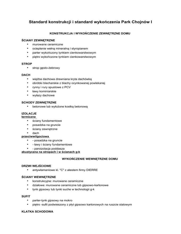 Standard konstrukcji i standard wykończenia Park Chojnów I KONSTRUKCJA I WYKOŃCZENIE ZEWNĘTRZNE DOMU ŚCIANY ZEWNĘTRZNE • murowane ceramiczne • ocieplenie wełną mineralną i styropianem • parter wykończony tynkiem cienkowarstwowym • piętro wykończone tynkiem cienkowarstwowym STROP • strop gęsto-żebrowy DACH • • • • • więźba dachowa drewniana kryta dachówką obróbki blacharskie z blachy ocynkowanej powlekanej rynny i rury spustowe z PCV ławy kominiarskie wyłazy dachowe SCHODY ZEWNĘTRZNE • betonowe lub wyłożone kostką betonową IZOLACJE termiczne • ściany fundamentowe • posadzka na gruncie • ściany zewnętrzne • dach przeciwwilgociowa • - posadzka na gruncie • - ławy i ściany fundamentowe • - paroizolacja poddasza akustyczna na stropach i w ścianach g-k WYKOŃCZENIE WEWNĘTRZNE DOMU DRZWI WEJŚCIOWE • antywłamaniowe kl. "C" z atestem firmy DIERRE ŚCIANY WEWNĘTRZNE • konstrukcyjne: murowane ceramiczne • działowe: murowane ceramiczne lub gipsowo-kartonowe • tynk gipsowy lub tynki suche w technologii g-k SUFIT • • parter-tynk gipsowy na mokro piętro -sufit podwieszony z płyt gipsowo kartonowych na ruszcie stalowym KLATKA SCHODOWA • • biegi żelbetowe wylewane na mokro ściany i sufity - tynki gipsowe na mokro lub tynki suche w technologii g-k PODŁOGI W POKOJACH I HOLU • posadzki-szlichta cementowa PARAPETY • konglomerat OKNA • PCV ,szklone zestawem termoizolacyjnym, rozwieralne lub rozwieralno - uchylne DRZWI WEWNĘTRZNE • otwory przygotowane do montażu ościeżnic i drzwi KUCHNIE, POKOJE, ŁAZIENKI • ściany i sufity tynk gipsowy na mokro lub tynki suche w technologii g-k • posadzki - szlichta cementowa PODDASZA • ściany tynk gipsowy na mokro lub tynki suche w technologii g-k • sufity -płyty g-k ,ocieplone wełną mineralną GARAŻ • ściany murowane • posadzki-szlichta cementowa • brama garażowa segmentowa z możliwością zainstalowania napędu elektrycznego • • • • sterowanego pilotem instalacja elektryczna z osprzętem bez opraw instalacja wodociągowa - opomiarowana instalacja co.-grzejnik płytowy KOTŁOWNIA • posadzka -szlichta cementowa • instalacja elektryczna z osprzętem • instalacja wod.-kan. • instalacja gazowa -do kotła co. • kocioł gazowy jednofunkcyjny z zasobnikiem c.w.u. z zamkniętą komorą spalania INSTALACJE C.O. • grzejniki płytowe • łazienki, grzejnik drabinkowy • instalacja lokalowa pod posadzkowa, rury z tworzywa sztucznego INSTALACJE WODNE • rozprowadzona po domu, zakończona wodomierzem, bez osprzętu i armatury czerpalnej • poziomy i piony z tworzywa sztucznego INSTALACJA KANALIZACYJNA • rozprowadzona po domu, bez białego montażu INSTALACJA GAZOWA • rozprowadzona po domu natynkowo • do kotłowni • opomiarowanie w skrzynce gazowej przy wjeździe na posesję INSTALACJA WENTYLACYJNA I DYMOWA • wentylacja grawitacyjna-kanały z pustaków ceramicznych • kominek-kanał dymowy np. z pustaków betonowych, cegły • kotłownia -wywiew grawitacyjny • nawiew powietrza do kominka INSTALACJA ELEKTRYCZNA • instalacja miedziana z osprzętem produkcji UE z zabezpieczeniem antyporażeniowym • 3-fazowa doprowadzona do kuchni • w kotłowni osprzęt przeciw wybuchowy INNE INSTALACJE • orurowanie rtv - gniazdo w wybranych pokojach • instalacja telefoniczna-gniazdo w wybranych pokojach • orurowanie Internet - gniazdo w wybranych pokojach • instalacja domofonowa TARASY • wylewka betonowa OTOCZENIE • ogrodzenie pomiędzy sąsiadami o wysokości ok. 1 m. • front posesji nie ogrodzony • teren wokół budynku splantowany • droga wewnętrzna, ul. Anyżkowa z kostki betonowej • oświetlenie głównej drogi osiedlowej • cały teren osiedla ogrodzony z główną bramą wjazdową • ogrodzenie osiedla monitorowane