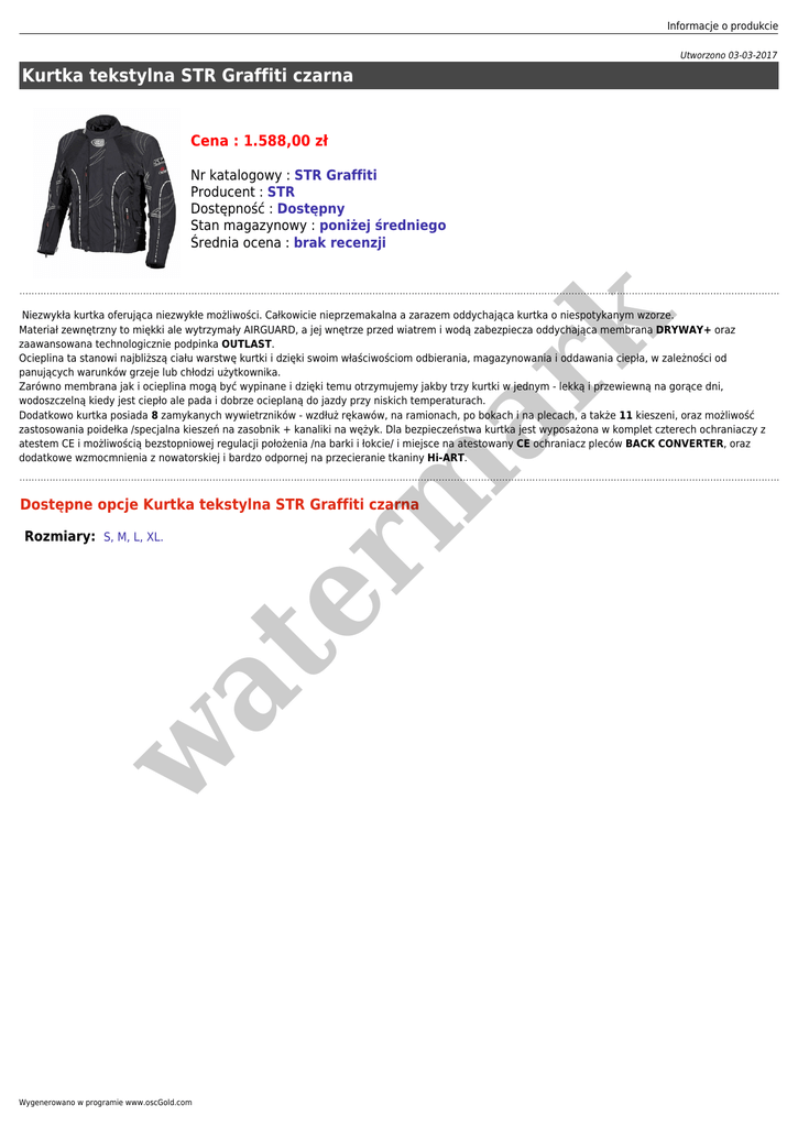 Informacje o produkcie Utworzono 03-03-2017 Kurtka tekstylna STR Graffiti czarna Cena : 1.588,00 zł Nr katalogowy : STR Graffiti Producent : STR Dostępność : Dostępny Stan magazynowy : poniżej średniego Średnia ocena : brak recenzji er m ar k Niezwykła kurtka oferująca niezwykłe możliwości. Całkowicie nieprzemakalna a zarazem oddychająca kurtka o niespotykanym wzorze. Materiał zewnętrzny to miękki ale wytrzymały AIRGUARD, a jej wnętrze przed wiatrem i wodą zabezpiecza oddychająca membrana DRYWAY+ oraz zaawansowana technologicznie podpinka OUTLAST. Ocieplina ta stanowi najbliższą ciału warstwę kurtki i dzięki swoim właściwościom odbierania, magazynowania i oddawania ciepła, w zależności od panujących warunków grzeje lub chłodzi użytkownika. Zarówno membrana jak i ocieplina mogą być wypinane i dzięki temu otrzymujemy jakby trzy kurtki w jednym - lekką i przewiewną na gorące dni, wodoszczelną kiedy jest ciepło ale pada i dobrze ocieplaną do jazdy przy niskich temperaturach. Dodatkowo kurtka posiada 8 zamykanych wywietrzników - wzdłuż rękawów, na ramionach, po bokach i na plecach, a także 11 kieszeni, oraz możliwość zastosowania poidełka /specjalna kieszeń na zasobnik + kanaliki na wężyk. Dla bezpieczeństwa kurtka jest wyposażona w komplet czterech ochraniaczy z atestem CE i możliwością bezstopniowej regulacji położenia /na barki i łokcie/ i miejsce na atestowany CE ochraniacz pleców BACK CONVERTER, oraz dodatkowe wzmocmnienia z nowatorskiej i bardzo odpornej na przecieranie tkaniny Hi-ART. Dostępne opcje Kurtka tekstylna STR Graffiti czarna w at Rozmiary: S, M, L, XL. Wygenerowano w programie www.oscGold.com
