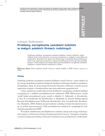 ARTYKUŁY Wszelkie prawa zastrzeżone. Każda reprodukcja lub adaptacja całości bądź części niniejszej publikacji, niezależnie od zastosowanej techniki reprodukcji (drukarskiej, totograficznej, komputerowej i in.), wymaga pisemnej zgody Wydawcy. Łukasz Sułkowski Problemy zarządzania zasobami ludzkimi w małych polskich firmach rodzinnych Analizując problemy zarządzania zasobami ludzkimi w firmie rodzinnej, należy odnieść się do wielu zaburzeń w procesie zarządzania ze względu na specyfikę tych podmiotów. Menedżerowie dążący do efektywnego zarządzania firmą rodzinną powinni znać zagrożenia związane z cechami charakterystycznymi tego typu przedsiębiorstw. Celem artykułu jest analiza kluczowych problemów zarządzania zasobami ludzkimi w małych firmach rodzinnych w Polsce. Kluczowe słowa: firma rodzinna (family business), zasoby ludzkie w MŚP (human resources in SME) Wstęp Analizując problemy zarządzania zasobami ludzkimi w family business, trzeba odnieść się do szeregu dysfunkcji zarządzania będących skutkami rodzinnego charakteru podmiotu. Zarządzający, dążąc do skutecznego kierowania biznesem rodzinnym, powinni poznać zagrożenia związane z charakterystyką tego typu podmiotów gospodarczych. Celem artykułu jest analiza kluczowych problemów zarządzania zasobami ludzkimi występujących w polskich przedsiębiorstwach rodzinnych MŚP. Wykorzystane zostały wyniki badań prowadzonych przez zespół w składzie: Ł. Sułkowski, A. Kowalewska, J. Szut, B. Lewandowska, M. Kwiatkowska, A. Marjański, na zlecenie Polskiej Agencji Rozwoju Przedsiębiorczości [Sułkowski, Kowalewska, Szut, Lewandowska, Kwiatkowska, Marjański, 2009]. Badanie przeprowadzono techniką wywiadu kwestionariuszowego, na próbie reprezentatywnej 1280 przedsiębiorców rodzinnych, zarządzających podmiotami gospodarczymi MŚP. W artykule zdefiniowano przedsiębiorstwa rodzinne, biorąc pod uwagę wieloznaczność pojęcia i zróżnicowane kryteria kategoryzacji family business. Następnie scharakteryzowano funkcję personalną w biznesach rodzinnych oraz przedstawiono wynik badań. HRM(ZZL)_2-2012-Sulkowski-L_9-18 10 Łukasz Sułkowski Wnioski stanowią próbę wskazania kluczowych problemów zarządzania zasobami ludzkimi będących skutkiem rodzinnej struktury przedsiębiorstwa. Definicje biznesów rodzinnych Określenie przedsiębiorstwa rodzinnego nie jest jednoznaczne. Mieszczą się w tej kategorii zarówno małe podmioty rodzinne, jak i duże przedsiębiorstwa kontrolowane przez jedną rodzinę. Właściwie nie ma nawet konsensu co do kryteriów wyróżniania family business, choć najczęściej wskazuje się na: rodzinną strukturę własności podmiotu, sprawowanie kontroli strategicznej przez rodzinę, udział członków rodziny w zarządzaniu oraz zaangażowanie więcej niż jednego pokolenia rodziny w funkcjonowanie firmy [Handler]. M.C. Shanker i J.H. Astrachan zwracają uwagę, że określenia family business mieszczą się na kontinuum. Najszersze definicje przyjmują bardzo ogólne i mgliste określenie przedsiębiorstwa rodzinnego, oparte na kontroli nad decyzjami strategicznymi oraz zamiarze pozostawienia przedsiębiorstwa pod kontrolą rodziny. Nieco węższe określenia family business wskazują, że założyciel lub jego potomkowie prowadzą firmę, która pozostaje pod kontrolą własnościową członków rodziny. Z kolei wąskie definicje wymagają dodatkowo obok wspomnianych kryteriów bezpośredniego zaangażowania rodziny w zarządzanie firmą oraz przedsiębiorstwa wielopokoleniowego. Wśród najważniejszych kryteriów pozwalających na uznanie podmiotu gospodarczego za rodzinny można wymienić: własność, zarząd, zaangażowanie rodziny w biznes oraz sukcesję rodzinną. R.K.Z. Heck i E.S. Trent przeprowadzają zestawienie tych kryteriów w odniesieniu do literatury przedmiotu (tab. 1). Tabela 1. Podsumowanie definicji biznesów rodzinnych bazujące na literaturze przedmiotu. Kryteria definiowania przedsiębiorstwa rodzinnego 1. Własność lub zarządzanie 2. Zaangażowanie rodziny w biznes (współzależność systemów) 3. Sukcesja rodzinna (transfer międzygeneracyjny) 4. Wielokryterialna Źródło: Heck, 2002, s. 610 HRM(ZZL)_2-2012-Sulkowski-L_9-18 Zmienne badane w „National Family Business Survey 1997” Status lub struktura własności, współwłasności, współwłaściciele, podejmowanie kluczowych decyzji lub kontrola, wartość udziałów Liczba członków rodziny pracująca w biznesie rodzinnym, opłacani i nieopłacani krewni nie mieszkający w jednym gospodarstwie domowym Pokolenia w biznesie rodzinnym, planowana zmiana struktury własności biznesu rodzinnego w ciągu przyszłych 5 lat, dążenie do pozostawienia własności w rodzinie w przyszłości Połączenie przynajmniej dwóch kryteriów wymienionych w punktach 1, 2, 3 Problemy zarządzania zasobami ludzkimi w małych polskich firmach... 11 W przypadku Polski trudno oprzeć się na kryterium sukcesji, ponieważ większość podmiotów rodzinnych powstała po 1990 roku oraz jest wciąż zarządzana i w posiadaniu przedstawicieli pierwszego pokolenia. Branie pod uwagę jedynie zamiaru sukcesji byłoby dość subiektywne, a zatem na potrzeby badań przyjęto, że firma rodzinna to każdy podmiot gospodarczy z sektora MŚP, o dowolnej formie prawnej, zarejestrowany i działający w Polsce, w którym: co najmniej dwóch członków rodziny wspólnie pracuje w tym przedsiębiorstwie, co najmniej jeden członek rodziny ma istotny wpływ na zarządzanie, członkowie rodziny posiadają znaczące lub większościowe udziały w przedsiębiorstwie. Dobór, motywowanie i rozwój pracowników firm rodzinnych MŚP W małych przedsiębiorstwach rodzinnych dominuje dobór pracowników oparty na kryterium przynależności do rodziny. Wiąże się to z łatwiejszym dostępem do potencjalnych kandydatów do pracy oraz z wyższym poziomem zaufania, którym są obdarzani krewni. In
