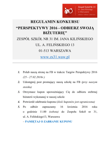 REGULAMIN KONKURSU “PERSPEKTYWY 2016 - ODBIERZ SWOJĄ BIŻUTERIĘ” ZESPÓŁ SZKÓŁ NR 31 IM. JANA KILIŃSKIEGO UL. A. FELIŃSKIEGO 13 01-513 WARSZAWA www.zs31.waw.pl 1. Polub naszą stronę na FB w trakcie Targów Perspektywy 2016 (25 - 27.02.2016r.) 2. Udostępnij post promujący naszą szkołę na FB (przy naszym stoisku) 3. Otrzymasz kupon upoważniający Cię do odbioru srebrnej biżuterii wykonanej w naszej szkole 4. Potwierdź odebranie kuponu (ilość kuponów jest ograniczona) 5. Po odbiór zapraszamy 16 kwietnia 2016 roku o godzinie 11.00 (sobota) do Zespołu Szkół nr 31, ul. A. Felińskiego13, Warszawa – PAMIĘTAJ O ZABRANIU KUPONU