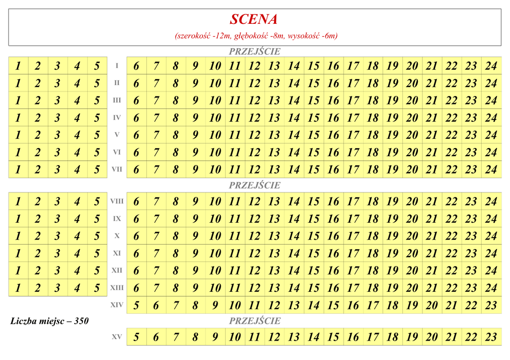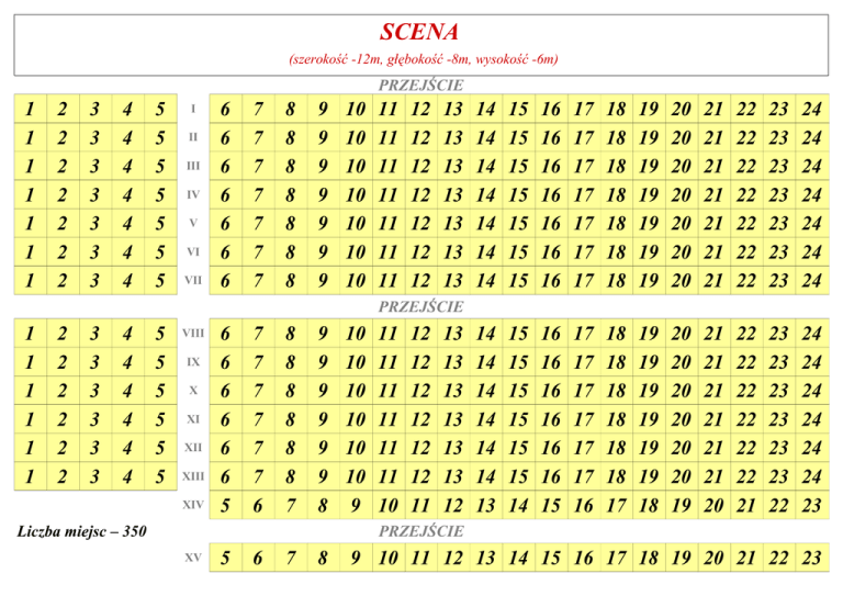 SCENA (szerokość -12m, głębokość -8m, wysokość -6m) PRZEJŚCIE 1 1 1 1 1 1 1 2 2 2 2 2 2 2 3 3 3 3 3 3 3 4 4 4 4 4 4 4 5 5 5 5 5 5 5 I II III IV V VI VII 6 6 6 6 6 6 6 7 7 7 7 7 7 7 8 8 8 8 8 8 8 9 9 9 9 9 9 9 10 10 10 10 10 10 10 11 11 11 11 11 11 11 12 12 12 12 12 12 12 13 13 13 13 13 13 13 14 14 14 14 14 14 14 15 15 15 15 15 15 15 16 16 16 16 16 16 16 17 17 17 17 17 17 17 18 18 18 18 18 18 18 19 19 19 19 19 19 19 20 20 20 20 20 20 20 21 21 21 21 21 21 21 22 22 22 22 22 22 22 23 23 23 23 23 23 23 24 24 24 24 24 24 24 14 14 14 14 14 14 13 15 15 15 15 15 15 14 16 16 16 16 16 16 15 17 17 17 17 17 17 16 18 18 18 18 18 18 17 19 19 19 19 19 19 18 20 20 20 20 20 20 19 21 21 21 21 21 21 20 22 22 22 22 22 22 21 23 23 23 23 23 23 22 24 24 24 24 24 24 23 PRZEJŚCIE 1 1 1 1 1 1 2 2 2 2 2 2 3 3 3 3 3 3 4 4 4 4 4 4 5 5 5 5 5 5 VIII IX X XI XII XIII XIV 6 6 6 6 6 6 5 7 7 7 7 7 7 6 8 8 8 8 8 8 7 9 9 9 9 9 9 8 Liczba miejsc – 350 10 10 10 10 10 10 9 11 11 11 11 11 11 10 12 12 12 12 12 12 11 13 13 13 13 13 13 12 PRZEJŚCIE XV 5 6 7 8 9 10 11 12 13 14 15 16 17 18 19 20 21 22 23