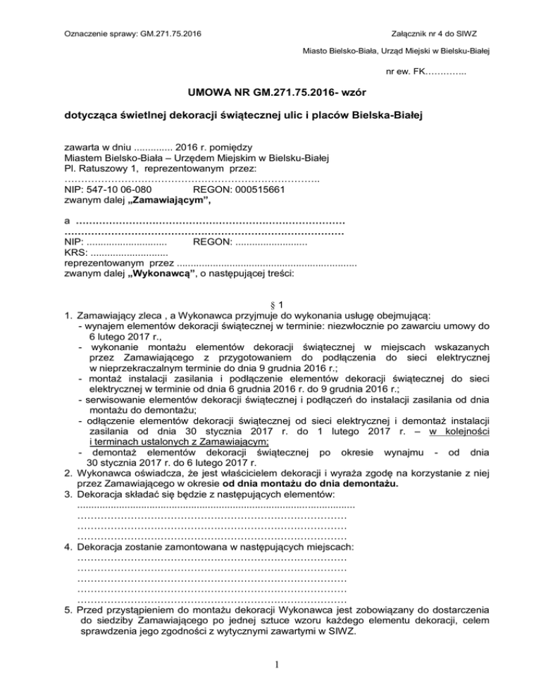 1 UMOWA NR GM.271.75.2016- wzór dotycząca świetlnej dekoracji