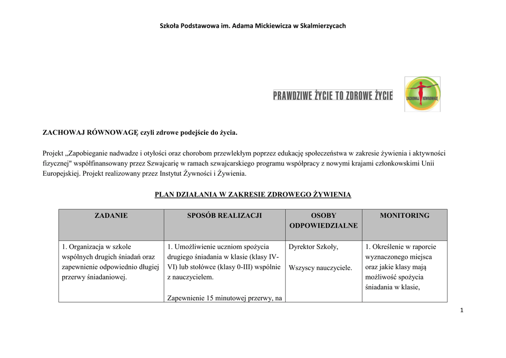 Szkoła Podstawowa im. Adama Mickiewicza w Skalmierzycach ZACHOWAJ RÓWNOWAGĘ czyli zdrowe podejście do życia. Projekt „Zapobieganie nadwadze i otyłości oraz chorobom przewlekłym poprzez edukację społeczeństwa w zakresie żywienia i aktywności fizycznej" współfinansowany przez Szwajcarię w ramach szwajcarskiego programu współpracy z nowymi krajami członkowskimi Unii Europejskiej. Projekt realizowany przez Instytut Żywności i Żywienia. PLAN DZIAŁANIA W ZAKRESIE ZDROWEGO ŻYWIENIA ZADANIE SPOSÓB REALIZACJI 1. Organizacja w szkole wspólnych drugich śniadań oraz zapewnienie odpowiednio długiej przerwy śniadaniowej. 1. Umożliwienie uczniom spożycia drugiego śniadania w klasie (klasy IVVI) lub stołówce (klasy 0-III) wspólnie z nauczycielem. OSOBY ODPOWIEDZIALNE Dyrektor Szkoły, Wszyscy nauczyciele. MONITORING 1. Określenie w raporcie wyznaczonego miejsca oraz jakie klasy mają możliwość spożycia śniadania w klasie, Zapewnienie 15 minutowej przerwy, na 1 Szkoła Podstawowa im. Adama Mickiewicza w Skalmierzycach której uczniowie spożywają śniadanie. 2. Ograniczenie wpływu reklamy żywności i napojów na terenie szkoły 2. Usuwanie reklamy żywności niezalecanej w żywieniu dzieci (np. reklamy słodyczy, słodzonych napojów). stołówce. Marzena Szymańska 2. Raport raz na rok: -informacja czy na terenie szkoły znajduje się reklama żywności niezalecanej w żywieniu dzieci, -informacja dotycząca czy usunięto reklamę. 3. Umieszczanie na terenie szkoły plakatów lub posterów promujących zdrowe żywienie. Organizacja wystawy prac uczniów promującej zdrowe żywienie. 3. Wprowadzanie plakatów, posterów o Wszyscy nauczyciele prawidłowym żywieniu dostępnych dla całej społeczności szkolnej przez cały rok szkolny ( na korytarzach, w klasach) 3.Raport raz na rok: Zorganizowanie wystawy prac uczniów na temat prawidłowego żywienia (trwającej cały rok szkolny). -zdjęcia wystaw promujących zdrowe żywienie z opisem miejsca i czasem ekspozycji. -zdjęcia plakatów, posterów z opisem miejsca i czasem ekspozycji, 2 Szkoła Podstawowa im. Adama Mickiewicza w Skalmierzycach 4. Rozwijanie zdolności i wiedzy kulinarnej uczniów zgodnej z zasadami racjonalnego żywienia (zajęcia praktyczne). 4. Podjęcie przynajmniej jednego z wymienionych działań: zajęcia kulinarne, wspólne przygotowywanie potraw, prowadzenie przyszkolnego ogródka, hodowla ziół (np. w klasach), zajęcia ze specjalistą. Nauczyciele uczący w klasach I-III, Marzena Szymańska, Łukasz Krzyśka 4. Raport raz na rok: -krótki opis przeprowadzonych zajęć, -zdjęcia z przeprowadzonych zajęć, -% uczniów uczestniczących w zajęciach lub jakie klasy są objęte zajęciami. 5. Organizowanie zajęć motywujących uczniów do samodzielnych prozdrowotnych wyborów. 5. Podjęcie przynajmniej jednego z przykładowych działań: warzywne wtorki, wycieczki na okoliczne stragany, quizy z wiedzy na temat zasad prawidłowego żywienia, prowadzenie działu o prawidłowym żywieniu w gazetce szkolnej, lekcje z aktywnym udziałem dzieci. Wszyscy nauczyciele 5. Raport raz na rok: -krótki opis działań, - zdjęcia z podjętych działań, -% uczniów uczestniczących w zajęciach lub jakie klasy są objęte zajęciami. 3 Szkoła Podstawowa im. Adama Mickiewicza w Skalmierzycach 6. Organizacja pikników, festynów rodzinnych lub innych imprez upowszechniających „zdrowy styl życia”. 7. Edukacja rodziców. 6. Podjęcie przynamniej jednego z wymienionych działań: organizacja pikników, festynów rodzinnych lub innych imprez upowszechniających „zdrowy styl życia” (co najmniej jedna impreza w roku szkolnym). Dyrektor szkoły, wychowawcy klas. 7. Podjęcie przynajmniej jednego z działań: organizacja pogadanek, prelekcji, edukacja rodziców z wykorzystaniem strony internetowej szkoły lub innych form (np. ulotki rozdawane na zebraniach). Wychowawcy klas. 6. Raport raz na rok: -krótki opis imprezy. -zdjęcia z imprezy. 7. Raport raz na rok: -krótki opis podjętego działania (rodzaj i ilość podjętych działań), -listy obecności rodziców. 8. Woda do picia w szkole dostępna dla każdego ucznia. 8. Każdy uczeń ma możliwość skorzystania z wody, która jest dostępna w korytarzach szkolnych. Marzena Szymańska 8. Opis podjętego działania, zdjęcia. 9. Organizacja aktywnych przerw. 9. Organizacja przerw, na których wszyscy uczniowie wraz z nauczycielami ćwiczą, tańczą, spędzają aktywnie czas. Wszyscy nauczyciele. 9. Opis działań, zdjęcia. 4 Szkoła Podstawowa im. Adama Mickiewicza w Skalmierzycach PLAN DZIAŁANIA W ZAKRESIE AKTYWNOŚCI FIZYCZNEJ ZADANIE SPOSÓB REALIZACJI OSOBY ODPOWIEDZIALNE 1. Organizacja imprezy 1. Zorganizowanie i przeprowadzenie minimum raz w Łukasz Krzyśka sportowo-rekreacyjnej dla roku jednej z wymienionych form: konkurs taneczny, dzieci. gimnastyczny, międzyklasowe zawody/turnieje Wychowawcy klas I-III sportowe, imprezy promujące aktywność fizyczną (np. Dzień Sportu, Dzień Dziecka, piknik – Marzena Szymańska pożegnanie lata, powitanie lata), w czasie których będą zorganizowane konkursy sportowe dla dzieci tak, by motywować je do dodatkowej aktywności ruchowej. MONITORING 1. Raz w roku dokumentacja dołączona do sprawozdania - zdjęcia z imprezy, - scenariusz imprezy, - % dzieci, które wzięły udział. 2. Edukacja dzieci w zakresie aktywności fizycznej. 2. Realizacja treści związanych z aktywnością fizyczną (podstawa programowa) w oparciu o metodę projektu (np. tematyka związana ze spędzaniem czasu wolnego w rodzinie, sprawność a Łukasz Krzyśka 2. Raz w roku Wychowawcy klas I-III dokumentacja dołączona do sprawozdania 5 Szkoła Podstawowa im. Adama Mickiewicza w Skalmierzycach zdrowie, znani sportowcy itp.). Anita Morawska - Wasielak - krótki opis działań, Marzena Szymańska - zdjęcia z przeprowadzonych zajęć, - % dzieci uczestniczących w zajęciach, - wybrane prace dzieci. 3. Wdrożenie sy