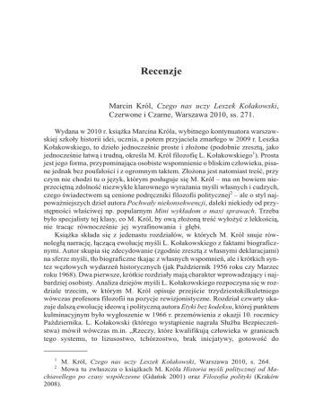 Recenzje Marcin Król, Czego nas uczy Leszek Ko³akowski, Czerwone i Czarne, Warszawa 2010, ss. 271. Wydana w 2010 r. ksi¹¿ka Marcina Króla, wybitnego kontynuatora warszawskiej szko³y historii idei, ucznia, a potem przyjaciela zmar³ego w 2009 r. Leszka Ko³akowskiego, to dzie³o jednoczeœnie proste i z³o¿one (podobnie zreszt¹, jako jednoczeœnie ³atw¹ i trudn¹, okreœla M. Król filozofiê L. Ko³akowskiego1). Prosta jest jego forma, przypominaj¹ca osobiste wspomnienie o bliskim cz³owieku, pisane jednak bez poufa³oœci i z ogromnym taktem. Z³o¿ona jest natomiast treœæ, przy czym nie chodzi tu o jêzyk, którym pos³uguje siê M. Król – ma on bowiem nieprzeciêtn¹ zdolnoœæ niezwykle klarownego wyra¿ania myœli w³asnych i cudzych, czego œwiadectwem s¹ cenione podrêczniki filozofii politycznej2 – ale o styl najpowa¿niejszych dzie³ autora Pochwa³y niekonsekwencji, daleki niekiedy od przystêpnoœci w³aœciwej np. popularnym Mini wyk³adom o maxi sprawach. Trzeba by³o specjalisty tej klasy, co M. Król, by ow¹ z³o¿on¹ treœæ wy³o¿yæ z lekkoœci¹, nie trac¹c równoczeœnie jej wyrafinowania i g³êbi. Ksi¹¿ka sk³ada siê z jedenastu rozdzia³ów, w których M. Król snuje równoleg³¹ narracjê, ³¹cz¹c¹ ewolucjê myœli L. Ko³akowskiego z faktami biograficznymi. Autor skupia siê zdecydowanie (zgodnie zreszt¹ z w³asnymi deklaracjami) na sferze myœli, t³o biograficzne tkaj¹c z w³asnych wspomnieñ, ale i krótkich syntez wêz³owych wydarzeñ historycznych (jak PaŸdziernik 1956 roku czy Marzec roku 1968). Dwa pierwsze, krótkie rozdzia³y maj¹ charakter wprowadzaj¹cy i najbardziej osobisty. Analiza dziejów myœli L. Ko³akowskiego rozpoczyna siê w rozdziale trzecim, w którym M. Król opisuje przejœcie trzydziestokilkuletniego wówczas profesora filozofii na pozycje rewizjonistyczne. Rozdzia³ czwarty ukazuje dalsz¹ ewolucjê ideow¹ i polityczn¹ autora Etyki bez kodeksu, której punktem kulminacyjnym by³o wyg³oszenie w 1966 r. przemówienia z okazji 10. rocznicy PaŸdziernika. L. Ko³akowski (którego wyst¹pienie nagra³a S³u¿ba Bezpieczeñstwa) mówi³ wówczas m.in. „Rzeczy, które kwalifikuj¹ cz³owieka w granicach tego systemu, to lizusostwo, tchórzostwo, brak inicjatywy, gotowoœæ do 1 M. Król, Czego nas uczy Leszek Ko³akowski, Warszawa 2010, s. 264. Mowa tu zw³aszcza o ksi¹¿kach M. Króla Historia myœli politycznej od Machiavellego po czasy wspó³czesne (Gdañsk 2001) oraz Filozofia polityki (Kraków 2008). 2 170 Recenzje SP 1 ’11 pos³uchu. Rzeczy, które dyskwalifikuj¹, to samodzielnoœæ, inicjatywa, poczucie odpowiedzialnoœci”3. Kilka dni póŸniej zosta³ usuniêty z PZPR, co tylko formalnie, jak zaznacza M. Król, przypieczêtowa³o jego rozstanie z marksistowsk¹ ideologi¹. Kolejny, pi¹ty rozdzia³, zdaje relacjê ze zmiany nastawienia L. Ko³akowskiego do religii i Koœcio³a, co daje asumpt do omówienia stosunkowo nieznanej ksi¹¿ki, Œwiadomoœæ religijna i wiêŸ koœcielna. Studia nad chrzeœcijañstwem bezwyznaniowym siedemnastego wieku z 1965 r. Podobn¹ formu³ê – analizy jednej, wa¿nej pracy – ma rozdzia³ szósty. Tu M. Król pochyla siê nad prze³omow¹ Obecnoœci¹ mitu, napisan¹ jeszcze w Polsce, lecz wydan¹ dopiero w 1972 r., gdy L. Ko³akowski (po Marcu 1968 r., któremu M. Król poœwiêca tak¿e nieco uwagi) wyemigrowa³ ju¿ z Polski. Twórczoœci pisanej poza krajem, ale krajowym sprawom poœwiêconej, dotyczy rozdzia³ siódmy. Autor przybli¿a tutaj tak wa¿ne teksty jak Tezy o nadziei i beznadziejnoœci (ukaza³y siê w paryskiej „Kulturze” w 1971 r.), Sprawa polska (1973) i O nas samych (1975). Ósmy rozdzia³ w ca³oœci poœwiêcony jest dzie³u, z którego L. Ko³akowski by³ i chyba pozostanie na œwiecie znany najbardziej – G³ównym nurtom marksizmu, których trzy tomy ukaza³y siê w latach 1976, 1977 i 1978. „O niektórych pracach mówi siê po angielsku, ¿e s¹ definitive, czyli maj¹ charakter ostatecznego omówienia tematu i ¿e nie nale¿y siê w przysz³oœci spodziewaæ ju¿ niczego ani lepszego, ani bardziej wyczerpuj¹cego” – pisze o G³ównych nurtach… M. Król4. Rozdzia³ dziewi¹ty przedstawia stosunek L. Ko³akowskiego do wspó³czesnej cywilizacji, poszukuj¹cej drogi pomiêdzy dziedzictwem wielkich ideologii i religii a rozczarowaniem nimi i p³yn¹cym st¹d nihilizmem. M. Król wpisuje rozwa¿ania L. Ko³akowskiego w szerszy kontekst debaty na temat dzisiejszego œwiata, siêgaj¹c zarazem do dawniejszych, jak i zupe³nie niedawnych prac filozofa. Dziesi¹ty rozdzia³ to powrót do obecnego w ca³ej twórczoœci L. Ko³akowskiego dialogu (sporu?) z religi¹, która jawi siê – poprzez sw¹ koncepcjê absolutu – jako pewien wzorzec uprawiania filozofii, nie mog¹cej uporaæ siê z problemem relatywizmu poznawczego i prawdy. To ostatnie zagadnienie – problem prawdy w filozofii – rozwiniête zostaje w finalnym, jedenastym rozdziale ksi¹¿ki. Jako doœwiadczony wyk³adowca, M. Król wie, ¿e nawet bardzo powa¿ny wyk³ad, by s³uchaczy nie znu¿yæ, urozmaiciæ nale¿y od czasu do czasu ciekaw¹ anegdot¹. W omawianej ksi¹¿ce znajdziemy szereg smakowitych opowiastek, równie¿ tych niezwykle przydatnych dla wszystkich uprawiaj¹cych dzia³alnoœæ naukow¹. „By³ sumiennym uczestnikiem konferencji” – pisze M. Król o L. Ko³akowskim – „co pamiêtam doskonale, bo kiedyœ, w trakcie jednej z nieco beznadziejnych konferencji na temat Europy, czêsto wstawa³em na papierosa. Leszek Ko³akowski wtedy mnie skarci³, powiedzia³: «zap³acili ci za przyjazd, hotel, siedŸ 3 4 M. Król, Czego nas uczy…, Warszawa 2010, s. 57. Ibidem, s. 145. SP 1 ’11 Recenzje 171 i odrabiaj lekcjê, przecie¿ nikt nie wie, o czym myœlisz»”5. Jednak i bez podobnych urozmaiceñ ksi¹¿ka pozosta³aby pasjonuj¹ca. Tak¿e dlatego, ¿e mimo wyra¿anego dla L. Ko³akowskiego szacunku i podziwu, M. Król nie przyjmuje posta