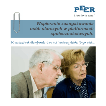 Dare to be wise! Wspieranie zaangażowania osób starszych w platformach społecznościowych: 10 wskazówek dla operatorów sieci i uniwersytetów 3-go wieku. Przedmowa Wstęp Anne-Sophie Parent, Sekretarz Generalna Europejskiej Platformy AGE Stale wzrasta liczba osób starszych, które z entuzjazmem podchodzą do uczenia się w InAGE wspiera project “Peer – miej odwagę być mądrym” od momentu jego rozpoczęcia z uwagi ternecie. Narzędzia Sieci 2.0 wspierające interakcje i współpracę mogą umożliwić stars- na jego cel: stworzenie przyjaznych warunków dla nieformalnego i pozaformalnego uczenia się zym użytkownikom Internetu zdobywane i przekazywanie wiedzy, pozwolić na rozwijanie osób 50+ w Internecie. Dla AGE szczególnie interesujące są „Wskazówki” skierowane dla ad- zainteresowań i utrzymanie sprawności intelektualnej. Głównym wyzwaniem, przed kttórym ministratorów w zakresie rozwijania sieci społecznościowych przy pomocy narzędzi Sieci 2.0. stają operatorzy platform społecznościowych jest podtrzymywanie zainteresowania zdobywaniem i dzieleniem się wiedzą. Rekomendacje odnoszą się zarówno do technologii jak i samego uczenia się, wspierają tworzenie warunków dla wymiany informacji oraz dzielenia się wiedzą i doświadczeniem pomiędzy Dzięki tym wskazówkom dotyczącym wykorzystania Sieci 2.0 administrowany przez ciebie użytkownikami sieci społecznościowych. Jest to szczególnie istotne dla trenerów i starszych system może zmienić się w środowisko przyjazne społecznościowemu uczeniu osób starszych użytkowników Internetu. Rekomendacje są tym istotniejsze, że biorą pod uwagę zróżnicowanie 50+. Wskazówki mogą być przydatne zarówno dla administratorów platform społecznościowych grupy wiekowej 50+ pod względem umiejętności technicznych i motywacji w korzystaniu z ser- dedykowanych dla osób starszych, jak i dla uniwersytetów trzeciego wieku czy instytucji wisów i narzędzi online. wspierających osoby starsze. W szczególności AGE zwraca uwagę na te elementy Sieci 2.0, które umiejscawiają uczącego Dokumenty podzielony został na dwie części: rekomendacje 1-5 dotyczą bezpośrednio techno- się w centrum procesu uczenia się, co stanowi istotną zmianę w stosunku do tradycyjnych me- logii, zaś rekomendacje 6-10 związane są z uczeniem się. Jako całość dają obraz środowiska tod kształcenia. Podkreślamy także potrzebę wdrożenia koncepcji technologii dostępnych dla uczenia się online wspierającego wymianę informacji wśrod starszych uczących się. wszystkich, także dla osób ze szczególnymi potrzebami np. niepełnosprawnych. Szczególnie doceniamy te narzędzia, które umożliwiają prowadzenie dialogu i rozmowy na tematy szcze- Wskazówki oparte są o rezultaty wypracowane przez projekt “PEER – Dare to be wise!” – PEER gólnie interesujące dla użytkowników. – Miej odwagę być mądry! Realizowany w latach 2011-2013. Celem projektu jest uczynienie z platform społecznościowych dedykowanych dla osób starszych atrakcyjnych i przyjaznych AGE zamierza wykorzystywać wypracowane narzędzia i promować ich szersze wdrażanie miejsc wspierających nieformalne i pozaformalne uczenie się wzajemne. gdyż wierzy, iż pozwolą one rozwinąć istniejące platformy społecznościowe dla osób straszych w sposób odzwierciedlający faktyczne potrzeby ich użytkowników. 1 Więcej na temat projektu znajdziesz na stronie http://www.peer-learning-50plus.eu 2 Rekomendacja 1 Wspieraj osoby dorosłe 50+ narzędziami spełniającymi ich potrzeby Administrowany przez ciebie serwis może stać się interaktywnym środowiskiem uczenia się dzięki niewielkim modyfikacjom wykorzystującym narzędzia Sieci 2.0. Narzędzia te pozwalają ich użytkownikom wyrazić siebie, przekazywać doświadczenie i wiedzę oraz czuć się docenionymi i uznanymi ludźmi. Właściwie zaadaptowane pod kątem użytkownika narzędzia 2.0 umożliwiają uporządkowanie informacji. Dają także możliwość łączenia się z innymi narzędziami spoza administrowanego przez ciebie środowiska. Poniżej znajdują się typy narzędzi 2.0 szczególnie pomocne we wzajemnym uczeniu się: •Bezpieczne repozytorium plików umożliwiające przechowywanie różnych typów danych. •Narzędzie do dzielenia się plikami. •Narzędzie do komentowania celem wymiany wiedzy, doświadczeń i opinii oraz dyskutowania. •Narzędzie do komunikacji wideo i audio ułatwiające uczenie się w grupie. •Narzędzie do planowania spotkań i wspólnych wydarzeń. •Narzędzie do tworzenia zakładek i znaczników celem lepszego zarządzania i organizowania informacjami. •Narzędzie umożliwiające współpracę nad konkretnym tematem. Nie zapomnij wyjaśnić, jakie konkretne korzyści odniosą użytkownicy Twojej platformy z korzystania z tych narzędzi! Wybór narzędzi Sieci 2.0: http://www.peer-learning-50plus.eu/en/attach/WP3_D6.pdf 3 4 Rekomendacja 2 Dowiedz się, co może zniechęcać osoby starszespełniającymi ich potrzeby Zaufanie i bezpieczeństwo są kluczowymi warunkami, dzięki którym starsi użytkownicy chętniej dzielą się informacjami, w szczególności tymi o charakterze osobistym. Choć każde z narzędzi 2.0 powinno być stabilne to niezwykle ważnym jest, by użytkownicy czuli się bezpiecznie używając ich. Dlatego dostępność informacji dotyczących technologii oraz bezpieczeństwa danych, w tym danych osobowych, wzmocni poczucie bezpieczeństwa użytkowników sieci społecznościowej. Wiarygodność infrastruktury Stabilne narzędzia 2.0 umożliwiające dostęp 24 godziny na dobę i 7 dni w tygodniu są warunkiem stworzenia i utrzymania motywującego środowiska uczenia się. •Przedstawienie celu, dla którego uruchomiono dodatkowe narzędzia pomoże uniknąć nieporozumień. •Krótkie filmy instruktażowe, teksty o charakterze informacyjnym, informacje o aktualizacjach oprogramowania i nowych funkcjonalności