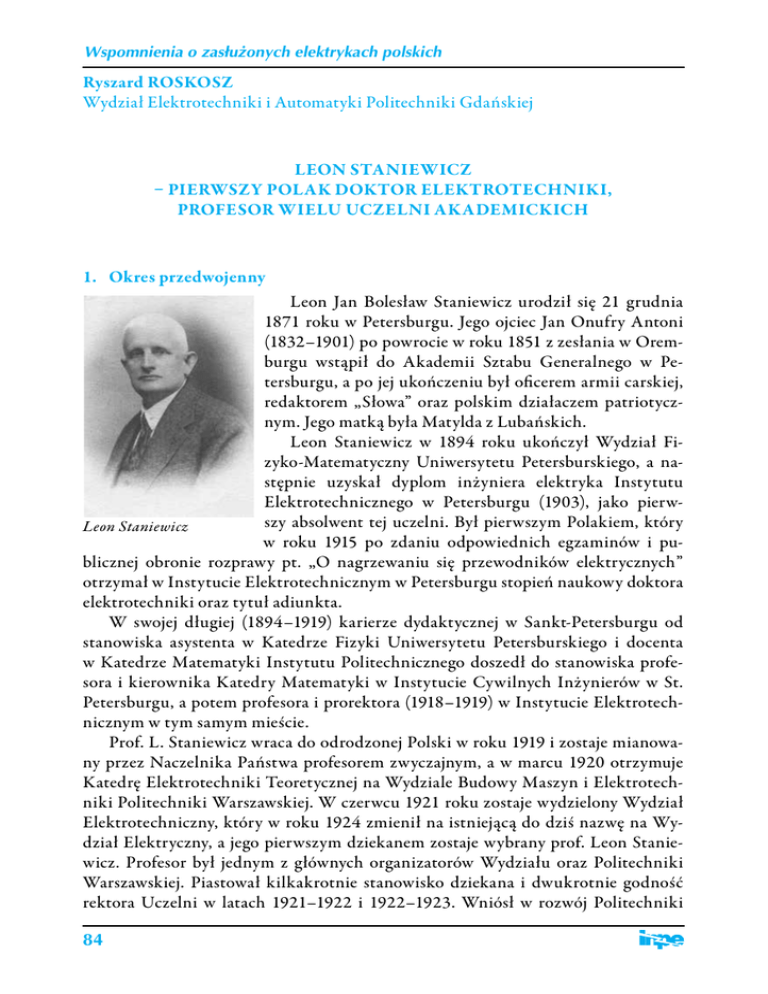 Wspomnienia o zasłużonych elektrykach polskich Ryszard ROSKOSZ Wydział Elektrotechniki i Automatyki Politechniki Gdańskiej LEON STANIEWICZ – PIERWSZY POLAK DOKTOR ELEKTROTECHNIKI, PROFESOR WIELU UCZELNI AKADEMICKICH 1. Okres przedwojenny Leon Jan Bolesław Staniewicz urodził się 21 grudnia 1871 roku w Petersburgu. Jego ojciec Jan Onufry Antoni (1832–1901) po powrocie w roku 1851 z zesłania w Oremburgu wstąpił do Akademii Sztabu Generalnego w Petersburgu, a po jej ukończeniu był oficerem armii carskiej, redaktorem „Słowa” oraz polskim działaczem patriotycznym. Jego matką była Matylda z Lubańskich. Leon Staniewicz w 1894 roku ukończył Wydział Fizyko-Matematyczny Uniwersytetu Petersburskiego, a następnie uzyskał dyplom inżyniera elektryka Instytutu Elektrotechnicznego w Petersburgu (1903), jako pierwszy absolwent tej uczelni. Był pierwszym Polakiem, który Leon Staniewicz w roku 1915 po zdaniu odpowiednich egzaminów i publicznej obronie rozprawy pt. „O nagrzewaniu się przewodników elektrycznych” otrzymał w Instytucie Elektrotechnicznym w Petersburgu stopień naukowy doktora elektrotechniki oraz tytuł adiunkta. W swojej długiej (1894–1919) karierze dydaktycznej w Sankt-Petersburgu od stanowiska asystenta w Katedrze Fizyki Uniwersytetu Petersburskiego i docenta w Katedrze Matematyki Instytutu Politechnicznego doszedł do stanowiska profesora i kierownika Katedry Matematyki w Instytucie Cywilnych Inżynierów w St. Petersburgu, a potem profesora i prorektora (1918–1919) w Instytucie Elektrotechnicznym w tym samym mieście. Prof. L. Staniewicz wraca do odrodzonej Polski w roku 1919 i zostaje mianowany przez Naczelnika Państwa profesorem zwyczajnym, a w marcu 1920 otrzymuje Katedrę Elektrotechniki Teoretycznej na Wydziale Budowy Maszyn i Elektrotechniki Politechniki Warszawskiej. W czerwcu 1921 roku zostaje wydzielony Wydział Elektrotechniczny, który w roku 1924 zmienił na istniejącą do dziś nazwę na Wydział Elektryczny, a jego pierwszym dziekanem zostaje wybrany prof. Leon Staniewicz. Profesor był jednym z głównych organizatorów Wydziału oraz Politechniki Warszawskiej. Piastował kilkakrotnie stanowisko dziekana i dwukrotnie godność rektora Uczelni w latach 1921–1922 i 1922–1923. Wniósł w rozwój Politechniki 84 Wspomnienia o zasłużonych elektrykach polskich Warszawskiej cenne tradycje dydaktyczne i doświadczenie zdobyte w czasie pracy w Uniwersytetach w Sankt-Petersburgu. Świadectwo Leona Staniewicza o publicznej obronie Jego rozprawy i otrzymaniu tytułu adiunkta w Instytucie Elektrotechnicznym w Petersburgu w 1915 r. W roku 1933 Profesor zostaje usunięty z Wydziału, a jego Katedra na mocy ustawy i decyzji ministra Janusza Jędrzejowicza zostaje zlikwidowana. Jest to represja za podpisanie protestu brzeskiego. Od 1933 do 1939 na politechnice Profesor wykłada instalacje elektryczne, nadal pracuje naukowo, a w roku 1935 wydany zostaje jego fundamentalny podręcznik „Teoria prądów zmiennych”, wznowiony następnie przez Wydawnictwo Bratniej Pomocy Studentów Politechniki Gdańskiej w latach 1946–1947. Nr 182–183 85 Wspomnienia o zasłużonych elektrykach polskich Pismo Ministra Wyznań Religijnych i Oświecenia Publicznego Janusza Jędrzejewicza o przeniesieniu prof. Leona Staniewicza w stan nieczynny Zwinięcie Katedry Elektrotechniki Teoretycznej i decyzja Ministra Janusza Jędrzejewicza z dnia 26 września 1933 r. o przeniesieniu w stan nieczynny zastała Profesora w pełni rozwoju pracy naukowej, dydaktycznej i organizacyjnej. Na kilka miesięcy przed tą decyzją, bo 15 marca 1933 r., Senat Akademicki Politechniki Warszawskiej wybrał Komisję dla opracowania nowego Statutu Politechniki, a prze86 Wspomnienia o zasłużonych elektrykach polskich wodniczącym tej Komisji wybrano prof. Leona Staniewicza – ówczesnego dziekana Wydziału Elektrycznego PW. Pismo Rektora PW o wyborze przez Senat Akademicki prof. L. Staniewicza na przewodniczącego Komisji dla opracowania nowego Statutu Politechniki Warszawskiej 2. Działalność w SEP i innych instytucjach Poza Politechniką prof. L. Staniewicz prowadził działalność w różnych instytucjach. Od powstania w 1924 roku Polskiego Komitetu Elektrotechnicznego był nieprzerwanie jego prezesem, przy jego udziale wydano szereg przepisów z dziedziny elektrotechniki. Od 1925 roku był członkiem Rady Technicznej przy Ministerstwie Komunikacji i pod jego przewodnictwem został rozpatrzony i zaopiniowany projekt elektryfikacji węzła kolejowego w Warszawie. W roku 1923 z ramienia Ministerstwa Poczty i Telegrafów przeprowadził jako przewodniczący komisji rzeczoznawców, wspólnie z innymi członkami tej komisji, ekspertyzę i odbiór całej instalacji Warszawskiej Transatlantyckiej Centrali Radiotelegraficznej, wykonanej przez Radio Corporation of America i inne firmy. Profesor w roku 1923 wybrany został na członka Akademii Nauk Technicznych i brał udział w Komisji Słownictwa Technicznego jako przewodniczący grupy elektrotechnicznej, która wydała dział 1. Słownika Elektrotechnicznego, zawierający poNr 182–183 87 Wspomnienia o zasłużonych elektrykach polskich jęcia podstawowe i ogólne. W lipcu 1932 roku, jako delegat Rządu Polskiego, brał udział w Międzynarodowym Kongresie Elektrycznym w Paryżu. Członkowie Komisji powołanej przez MP i T do odbioru stacji radiotelegraficznej w Boernerowie. Od lewej: inż. Splawa Neyman, prof. Roman Trechciński, prof. Leon Staniewicz, kpt inż. Janusz Groszkowski – październik 1923 rok Zarząd oraz członkowie Koła Elektryków, Rok Akademicki 1928/29, Politechnika Warszawska, 14 października 1929 roku. Centralną postacią jest Profesor Leon Staniewicz. Po jego lewej stronie Przewodniczący Koła Konstanty Mauberg. Pozostałe osoby prezentowane na zdjęciu nie są rozpoznane 88 Wspomnienia o zasłużonych elektrykach polskich Od 1920 roku prof. Staniewicz był aktywnym członkiem Stowarzyszenia Elektryków 