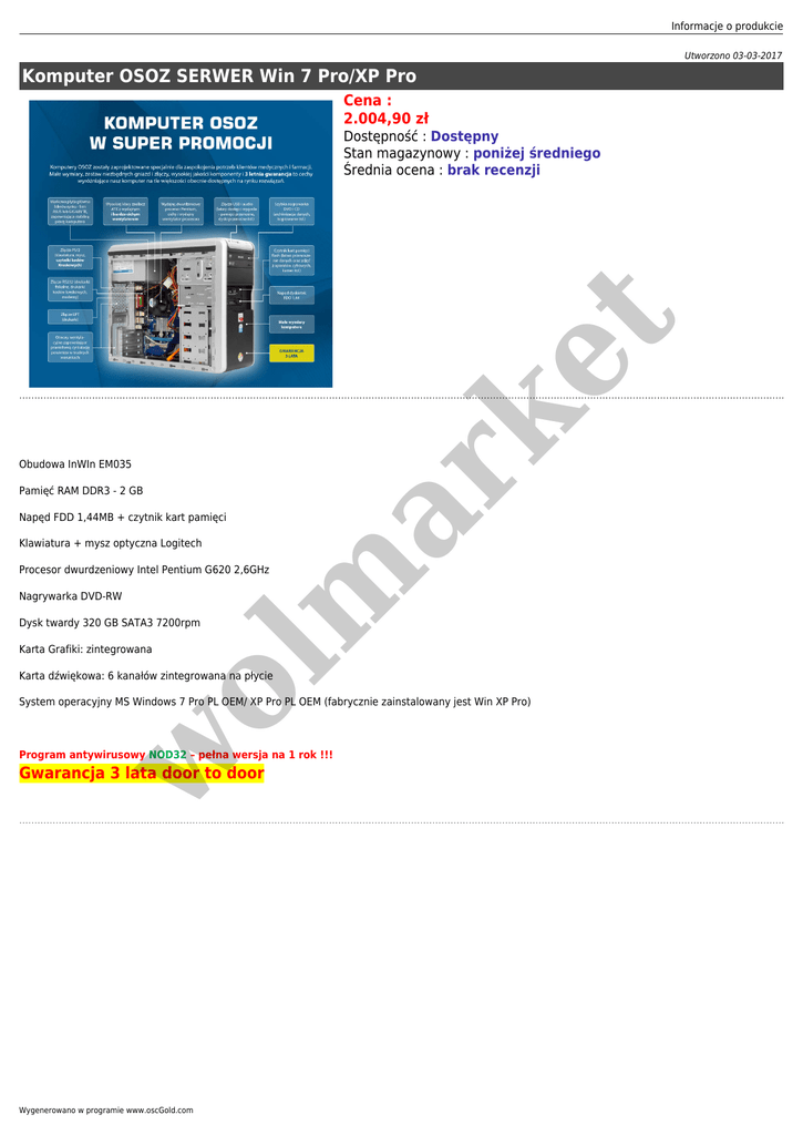 Informacje o produkcie Utworzono 03-03-2017 Komputer OSOZ SERWER Win 7 Pro/XP Pro Cena : 2.004,90 zł Obudowa InWIn EM035 Pamięć RAM DDR3 - 2 GB Napęd FDD 1,44MB + czytnik kart pamięci Klawiatura + mysz optyczna Logitech Nagrywarka DVD-RW Dysk twardy 320 GB SATA3 7200rpm ol Karta Grafiki: zintegrowana m Procesor dwurdzeniowy Intel Pentium G620 2,6GHz ar ke t Dostępność : Dostępny Stan magazynowy : poniżej średniego Średnia ocena : brak recenzji Karta dźwiękowa: 6 kanałów zintegrowana na płycie w System operacyjny MS Windows 7 Pro PL OEM/ XP Pro PL OEM (fabrycznie zainstalowany jest Win XP Pro) Program antywirusowy NOD32 – pełna wersja na 1 rok !!! Gwarancja 3 lata door to door Wygenerowano w programie www.oscGold.com