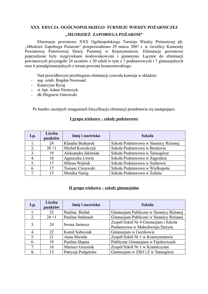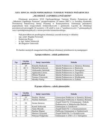 XXX EDYCJA OGÓLNOPOLSKIEGO TURNIEJU WIEDZY POŻARNICZEJ ,,MŁODZIEŻ ZAPOBIEGA POŻAROM” Eliminacje powiatowe XXX Ogólnopolskiego Turnieju Wiedzy Pożarniczej ph. ,,Młodzież Zapobiega Pożarom” przeprowadzono 29 marca 2007 r. w świetlicy Komendy Powiatowej Państwowej Straży Pożarnej w Krasnymstawie. Eliminacje powiatowe poprzedzone były rozgrywkami środowiskowymi i gminnymi. Łącznie do eliminacji powiatowych przystąpiło 24 uczniów z 20 szkół w tym z 7 podstawowych i 7 gimnazjalnych oraz 6 ponadgimnazjalnych z terenu powiatu krasnostawskiego. Nad prawidłowym przebiegiem eliminacji czuwała komisja w składzie: asp. sztab. Bogdan Nowosad Katarzyna Rycaj st. kpt. Adam Niemczyk dh Zbigniew Ostrowski - Po bardzo zaciętych zmaganiach klasyfikacja eliminacji przedstawia się następująco: I grupa wiekowa – szkoły podstawowe Lp. 1. 2. 3. 4. 5. 6. 7. Liczba punktów 24 20 +1 19 18 17 17 15 Imię i nazwisko Klaudia Bednaruk Michał Kowalczyk Aleksandra Jakimiak Agnieszka Litwin Milena Wojtiuk Tomasz Ciszewski Monika Naróg Szkoła Szkoła Podstawowa w Siennicy Różanej Szkoła Podstawowa w Boniewie Szkoła Podstawowa w Tarnogórze Szkoła Podstawowa w Zagrodzie Szkoła Podstawowa w Surhowie Szkoła Podstawowa w Wielkopolu Szkoła Podstawowa w Żulinie II grupa wiekowa – szkoły gimnazjalne 1. 2. Liczba punktów 25 24 +1 3. 24 Iwona Jarmosz 4. 5. 6. 7. 8. 22 21 19 16 13 Kamil Sobiesiak Anna Miciuła Paulina Słupna Mariusz Grzesiuk Patrycja Podgórska Lp. Imię i nazwisko Paulina Biełań Paulina Stalmach Szkoła Gimnazjum Publiczne w Siennicy Różanej Gimnazjum Publiczne w Siennicy Różanej Zespół Szkół Nr 4 Gimnazjum i Szkoła Podstawowa w Małochwieju Dużym Gimnazjum w Gorzkowie Zespół Szkół Nr 1 w Krasnymstawie Publiczne Gimnazjum w Fajsławicach Zespół Szkół Nr 1 w Kraśniczynie Gimnazjum w ZSO i Z w Tarnogórze III grupa wiekowa – szkoły ponadgimnazjalne 1. 2. 3. 4. Liczba punktów 26 23 20 19 5. 15 Katarzyna Cichosz 6. 12 Mateusz Kniażiuk 7. 12 Łukasz Marucha 8. 12 Grzegorz Gorgol 9. 11 Marcin Marczewski Lp. Imię i nazwisko Daniel Miciuła Łukasz Antoniak Kamil Bereza Karolina Berbeć Szkoła II Liceum Ogólnokształcące w Krasnymstawie I Liceum Ogólnokształcące w Krasnymstawie II Liceum Ogólnokształcące w Krasnymstawie I Liceum Ogólnokształcące w Krasnymstawie Zespół Szkół Ogólnokształcących i Zawodowych w Tarnogórze Zespół Szkół w Siennicy Różanej Zespół Szkół Ponadgimnazjalnych Nr 1 w Krasnymstawie Zespół Szkól Ponadgimnazjalnych Nr 1 w Krasnymstawie Zespół Szkół Ponadgimnazjalnych w Żółkiewce Zwycięzcy eliminacji powiatowych z poszczególnych grup zakwalifikowani zostali do eliminacji wojewódzkich, które odbędą się w późniejszym terminie do końca kwietnia br. Wszyscy uczestnicy turnieju poza dyplomami otrzymali nagrody rzeczowe. Nagrodę również ufundowano dla zwycięzcy zmaganiach z podręcznym sprzętem gaśniczym zorganizowanych dla przybyłych wraz z młodzieżą opiekunów. Konkurencję wygrała pani Renata Wiśniewska z Zespołu Szkół Nr 4 Gimnazjum i Szkoły Podstawowej w Małochwieju Dużym. Podczas pobytu w miejscowej Komendzie Powiatowej PSP uczestnicy oraz ich opiekunowie skorzystali z okazji i zapoznali się z warunkami służby strażaków oraz sprzętem będącym na wyposażeniu jednostki. Wśród zaproszonych gości i sponsorów na eliminacjach obecni byli: - Janusz Szpak - Starosta Krasnostawski, - Mirosław Księżuk - Dyrektor Biura Poselskiego Posła Na Sejm RP Henryka Młynarczyka, - Stanisław Kubina - Prezes Zarządu Oddziału Powiatowego ZOSP RP w Krasnymstawie, - st. kpt. Dariusz Pylak - Komendant Powiatowy PSP w Krasnymstawie, - st. kpt. Zbigniew Bojarczuk - Z-ca Komendanta Powiatowego PSP w Krasnymstawie, - Wacław Cichosz - Dyrektor Wojewódzkiego Funduszu Ochrony Środowiska i Gospodarki Wodnej O/Chełm, - Zbigniew Janowski - Dyrektor Rejonowego Zakładu Energetycznego w Krasnymstawie, - Piotr Żołnacz - Hurtownia Papiernicza i Motoryzacyjna AGAT w Krasnymstawie, - Jerzy Babiarz - Wójt Gminy Izbica, - Tadeusz Chruściel - Wójt Gminy Fajsławice, - przedstawiciele prasy i telewizji. Pytania testowe obowiązujące podczas turnieju 1. Jaki jubileusz obchodzi w bieżącym roku Państwowa Straż Pożarna: a) 15 lecie powstania b) 10 lecie organizacji KSRG c) 5 lecie powstania Komend Powiatowych 2. Jaki dokument określa szczegółowe zadania i organizację Ochotniczej Straży Pożarnej? a) regulamin organizacyjny b) statut c) ustawa o stowarzyszeniach 3. W skład uzbrojenia osobistego strażaka wchodzi: a) zatrzaśnik b) prądownica c) prądnica 4. W jakiej odległości można umieszczać butle z gazem propan – butan od urządzeń emitujących ciepło? a) 3 m b) 2 m c) 1,5 m 5. Ciśnienie robocze węży W-75 i W-52 wynosi: a) 12 atm. b) 14 atm. c) 15 atm. 6. Jaki jest najwyższy stopień w korpusie oficerów straży pożarnej: a) kapitan b) generał brygadier c) generał nadbrygadier 7. Punkt skupu i przechowywania zboża należy zakwalifikować do obiektów: a) PM – przemysłowo-magazynowych b) PM - przetwórstwa i magazynowania c) PS - przemysłu spożywczego 8. Gaz płynny propan-butan jest: a) cięższy od ciężaru właściwego wody b) lżejszy od ciężaru właściwego wody c) równy ciężarowi właściwemu wody 9. Kto ma prawo do przeprowadzania czynności kontrolno-rozpoznawczych z zakresu ochrony przeciwpożarowej? a) członek OSP b) strażak PSP c) uprawniony strażak pełniący służbę w PSP 10. Jaka powinna być maksymalna odległość dojścia do podręcznego sprzętu gaśniczego? a) 25 m b) 15 m c) 30 m 11. Kto odpowiada za realizację polityki państwa w zakresie ochrony przeciwpożarowej oraz pełni nadzór nad funkcjonowaniem Krajowego Systemu Ratowniczo Gaśniczego? a) Komendant Główny PSP – Szef Obrony Cywilnej Państwa b) Prezes Rady Ministrów c) Minister Spraw Wewnętrznych i Administracji 12. Temperatura w pomieszczeniach przez