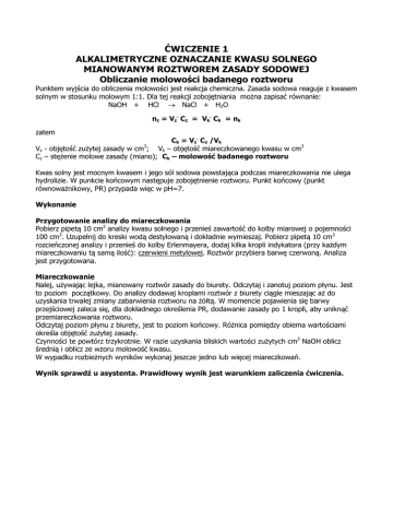 ĆWICZENIE 1 ALKALIMETRYCZNE OZNACZANIE KWASU SOLNEGO MIANOWANYM ROZTWOREM ZASADY SODOWEJ Obliczanie molowości badanego roztworu Punktem wyjścia do obliczenia molowości jest reakcja chemiczna. Zasada sodowa reaguje z kwasem solnym w stosunku molowym 1:1. Dla tej reakcji zobojętniania można zapisać równanie: NaOH + HCl NaCl + H2O nz = Vz. Cz = Vk. Ck = nk zatem Ck = Vz. Cz /Vk Vz - objętość zużytej zasady w cm3; Vk – objętość miareczkowanego kwasu w cm3 Cz – stężenie molowe zasady (miano); Ck – molowość badanego roztworu Kwas solny jest mocnym kwasem i jego sól sodowa powstająca podczas miareczkowania nie ulega hydrolizie. W punkcie końcowym następuje zobojętnienie roztworu. Punkt końcowy (punkt równoważnikowy, PR) przypada więc w pH=7. Wykonanie Przygotowanie analizy do miareczkowania Pobierz pipetą 10 cm3 analizy kwasu solnego i przenieś zawartość do kolby miarowej o pojemności 100 cm3. Uzupełnij do kreski wodą destylowaną i dokładnie wymieszaj. Pobierz pipetą 10 cm3 rozcieńczonej analizy i przenieś do kolby Erlenmayera, dodaj kilka kropli indykatora (przy każdym miareczkowaniu tą samą ilość): czerwieni metylowej. Roztwór przybiera barwę czerwoną. Analiza jest przygotowana. Miareczkowanie Nalej, używając lejka, mianowany roztwór zasady do biurety. Odczytaj i zanotuj poziom płynu. Jest to poziom początkowy. Do analizy dodawaj kroplami roztwór z biurety ciągle mieszając aż do uzyskania trwałej zmiany zabarwienia roztworu na żółtą. W momencie pojawienia się barwy przejściowej zaleca się, dla dokładnego określenia PR, dodawanie zasady po 1 kropli, aby uniknąć przemiareczkowania roztworu. Odczytaj poziom płynu z biurety, jest to poziom końcowy. Różnica pomiędzy obiema wartościami określa objętość zużytej zasady. Czynności te powtórz trzykrotnie. W razie uzyskania bliskich wartości zużytych cm3 NaOH oblicz średnią i oblicz ze wzoru molowość kwasu. W wypadku rozbieżnych wyników wykonaj jeszcze jedno lub więcej miareczkowań. Wynik sprawdź u asystenta. Prawidłowy wynik jest warunkiem zaliczenia ćwiczenia. ĆWICZENIE 2 ACYDYMETRYCZNE OZNACZANIE ZASADY SODOWEJ MIANOWANYM ROZTWOREM KWASU SOLNEGO Obliczanie molowości badanego roztworu Punktem wyjścia do obliczenia molowości zasady jest reakcja chemiczna. Zasada sodowa reaguje z kwasem solnym w stosunku molowym 1:1. Dla tej reakcji zobojętniania można zapisać równanie: NaOH + HCl NaCl + H2O nz = Vz. Cz = Vk. Ck = nk zatem Cz = Vk. Ck /Vz Vz - objętość miareczkowanej zasady w cm3; Cz – molowość badanego roztworu; Vk – objętość zużytego kwasu w cm3 Ck – stężenie molowe kwasu (miano) Kwas solny jest mocnym kwasem i jego sól sodowa powstająca podczas miareczkowania nie ulega hydrolizie. W punkcie końcowym następuje zobojętnienie roztworu. Punkt końcowy (punkt równoważnikowy, PR) przypada więc w pH=7. Wykonanie Przygotowanie analizy do miareczkowania Pobierz pipetą 10 cm3 analizy zasady sodowej i przenieś zawartość do kolby miarowej o pojemności 100 cm3. Uzupełnij do kreski wodą destylowaną i dokładnie wymieszaj. Pobierz pipetą 10 cm3 rozcieńczonej analizy i przenieś do kolby Erlenmayera, dodaj kilka kropli indykatora (przy każdym miareczkowaniu tą samą ilość): oranżu metylowego. Roztwór przybiera barwę żółtą. Analiza jest przygotowana do miareczkowania. Miareczkowanie Nalej, używając lejka, mianowany roztwór kwasu do biurety. Odczytaj i zanotuj poziom płynu. Jest to poziom początkowy. Do analizy dodawaj kroplami roztwór z biurety ciągle mieszając aż do uzyskania trwałej zmiany zabarwienia roztworu na czerwoną. W momencie pojawienia się barwy przejściowej zaleca się, dla dokładnego określenia PR, dodawanie kwasu po 1 kropli, aby uniknąć przemiareczkowania roztworu. Odczytaj poziom płynu z biurety, jest to poziom końcowy. Różnica pomiędzy obiema wartościami określa objętość zużytego kwasu. Czynności te powtórz trzykrotnie. W razie uzyskania bliskich wartości zużytych cm3 HCl oblicz średnią i oblicz ze wzoru molowość zasady. W wypadku rozbieżnych wyników wykonaj jeszcze jedno lub więcej miareczkowań. Wynik sprawdź u asystenta. Prawidłowy wynik jest warunkiem zaliczenia ćwiczenia. ĆWICZENIE 3 KOMPLEKSOMETRYCZNE OZNACZANIE STĘŻENIA JONÓW MAGNEZU Kompleksometria polega na wykorzystaniu reakcji tworzenia trwałych kompleksów z oznaczanymi jonami przez związki chelatujące. Najczęściej wykorzystywane związki chelatujace tzw. kompleksony, są to kwasy aminopolikarboksylowe, mające zdolność do tworzenia kompleksów kleszczowych dzięki obecności w cząsteczkach miejsc aktywnych (atomy ligandowe – tlenu, azotu, niewiążące pary elektronowe). Przykładami kompleksonów są : Komplekson I – kwas nitrylotrioctowy N(CH2COO)3 Komplekson II – kwas wersenowy (etylenodiaminotetraoctowy), dla uproszczenia nazwę zapisujemy - EDTA (H4Y – Y –anion kwasu) (CH2COOH)2N-CH2-CH2-N(CH2COOH)2 Komlpekson III – sól disodowa kwasu wersenowego, w skrócie również EDTA Kompleks EDTA z jonami metalu Reakcje tworzenia połączeń kompleksonów z jonami metali przebiegają zawsze w stosunku molowym: mol kationów metalu na mol jonów wersenianowych, niezależnie od ładunku jonu. W oznaczeniach kompleksometrycznych stosuje się dwa rodzaje wskaźników: metalowskaźniki i wskaźniki redoks. Muszą one spełniać określone warunki: 1. kompleks oznaczanego jonu metalu z używanym w reakcji wskaźnikiem musi być mniej trwały niż kompleks z czynnikiem chelatującym 2. różnica barw między wolnym wskaźnikiem a kompleksem metal - wskaźnik powinna być wyraźna 3. reakcja wskaźnika z metalem powinna mieć wysoką czułość W oznaczeniach stężenia jonów magnezu, wapnia w roztworach wodnych (np. oznaczanie twardości wody) stosuje się jako wskaźnik czerń eriochromowąT. Czerń eriochromowa T jest trójprotonowym kwasem, o wzorze umownym H3T. H3T zaliczana j