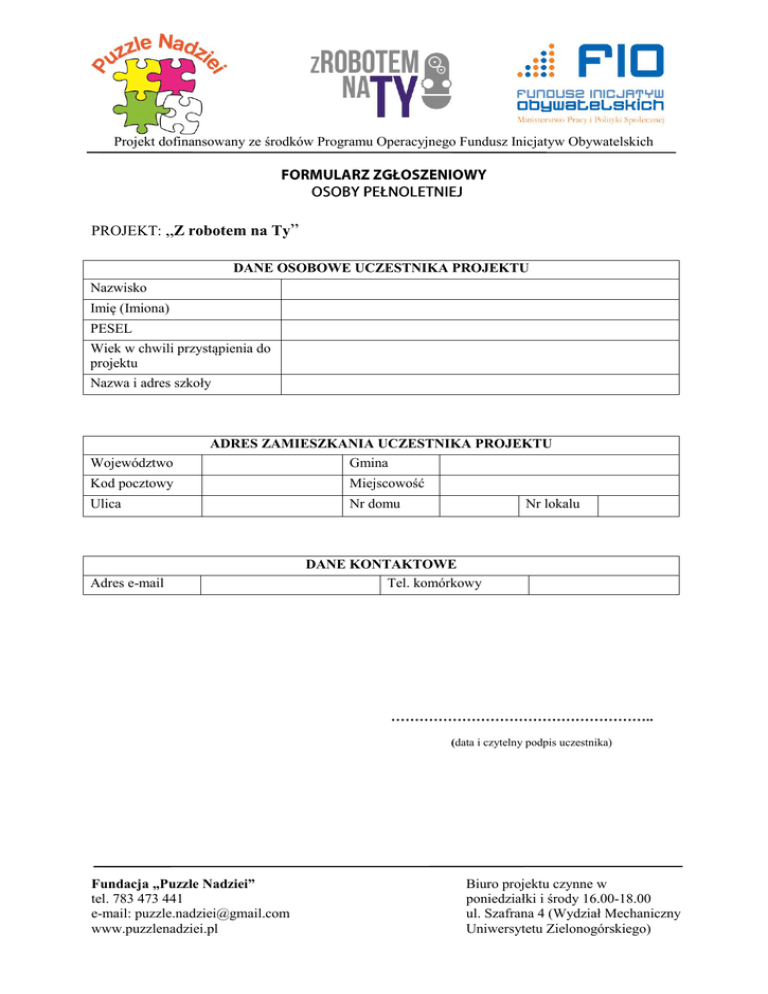 Projekt dofinansowany ze środków Programu Operacyjnego Fundusz Inicjatyw Obywatelskich PROJEKT: „Z robotem na Ty” DANE OSOBOWE UCZESTNIKA PROJEKTU Nazwisko Imię (Imiona) PESEL Wiek w chwili przystąpienia do projektu Nazwa i adres szkoły Województwo ADRES ZAMIESZKANIA UCZESTNIKA PROJEKTU Gmina Kod pocztowy Miejscowość Ulica Nr domu Adres e-mail Nr lokalu DANE KONTAKTOWE Tel. komórkowy ……………………………………………….. (data i czytelny podpis uczestnika) Fundacja „Puzzle Nadziei” tel. 783 473 441 e-mail: [email protected] www.puzzlenadziei.pl Biuro projektu czynne w poniedziałki i środy 16.00-18.00 ul. Szafrana 4 (Wydział Mechaniczny Uniwersytetu Zielonogórskiego) Projekt dofinansowany ze środków Programu Operacyjnego Fundusz Inicjatyw Obywatelskich OŚWIADCZENIE Oświadczam, że: Wyrażam zgodę na wypełnianie dokumentów związanych z Projektem (np. ankiety, oceny szkolenia), Zapoznałem/am się z Regulaminem uczestnictwa w Projekcie „Z robotem na Ty” i akceptuję jego postanowienia, Zostałem/am poinformowany/a, że Projekt jest współfinansowany ze środków otrzymanych w ramach Programu Operacyjnego Fundusz Inicjatyw Obywatelskich, Wyrażam zgodę na publikacje zdjęć wykonanych w ramach Projektu (wykorzystanie mojego wizerunku na stronie internetowej Projektu oraz w materiałach informacyjnych z realizacji Projektu), Zobowiązuję się do systematycznego uczęszczania na warsztaty, zgodnie z wybraną grupą szkoleniową w Projekcie „Z robotem na Ty”, Wyrażam zgodę na udział w badaniu ankietowym przeprowadzanym w 6 miesięcy po zakończeniu Projektu. Odnośnie gromadzenia i przetwarzania danych osobowych: Wyrażam dobrowolną zgodę na gromadzenie, przetwarzanie i przekazywanie danych zawartych w niniejszym formularzu (zgodnie z Ustawą z dnia 29 sierpnia 1997 r. o ochronie danych osobowych Dz. U. z 2002 r. Nr 101 poz. 926, ze zm.), do celów związanych z przeprowadzeniem rekrutacji, szkolenia, monitoringu i ewaluacji Projektu, Oświadczam, że zostałem/am poinformowany/a, iż podanie danych jest dobrowolne, aczkolwiek odmowa ich podania jest równoznaczna z brakiem możliwości udzielenia wsparcia w ramach Projektu Pouczony/a o odpowiedzialności za składanie oświadczeń niezgodnych z prawdą, oświadczam, iż dane oraz oświadczenia zawarte w niniejszym formularzu są zgodne z prawdą. ..................................................................................................... (data i czytelny podpis uczestnika) Fundacja „Puzzle Nadziei” tel. 783 473 441 e-mail: [email protected] www.puzzlenadziei.pl Biuro projektu czynne w poniedziałki i środy 16.00-18.00 ul. Szafrana 4 (Wydział Mechaniczny Uniwersytetu Zielonogórskiego) Projekt dofinansowany ze środków Programu Operacyjnego Fundusz Inicjatyw Obywatelskich OŚWIADCZENIE UCZESTNIKA PROJEKTU O WYRAŻENIU ZGODY NA PRZETWARZANIE DANYCH OSOBOWYCH W związku z przystąpieniem do Projektu „Z robotem na Ty” nr umowy 247_I/2014 realizowanego w ramach Programu Operacyjnego Fundusz Inicjatyw Obywatelskich wyrażam zgodę na przetwarzanie moich danych osobowych. Oświadczam, iż przyjmuję do wiadomości, że: 1 Administratorem tak zebranych danych osobowych jest Instytucja Zarządzająca dla Programu Operacyjnego Fundusz Inicjatyw Obywatelskich – Departament Pożytku Publicznego Ministerstwa Pracy i Polityki Społecznej; 2 Moje dane osobowe będą przetwarzane wyłącznie w celu udzielenia wsparcia, realizacji Projektu „Z robotem na Ty” ewaluacji, monitoringu i sprawozdawczości w ramach Programu Operacyjnego Fundusz Inicjatyw Obywatelskich 3 Moje dane osobowe mogą zostać udostępnione innym podmiotom wyłącznie w celu udzielenia wsparcia, realizacji projektu „Z robotem na Ty ”, ewaluacji, monitoringu i sprawozdawczości w ramach Programu Operacyjnego Fundusz Inicjatyw Obywatelskich 4 Podanie danych jest dobrowolne, aczkolwiek odmowa ich podania jest równoznaczna z brakiem możliwości udzielenia wsparcia w ramach Projektu; 5 Mam prawo dostępu do treści moich danych i ich poprawiania. _______________________ Miejscowość, data Fundacja „Puzzle Nadziei” tel. 783 473 441 e-mail: [email protected] www.puzzlenadziei.pl _______________________________ PODPIS UCZESTNIKA PROJEKTU Biuro projektu czynne w poniedziałki i środy 16.00-18.00 ul. Szafrana 4 (Wydział Mechaniczny Uniwersytetu Zielonogórskiego) Projekt dofinansowany ze środków Programu Operacyjnego Fundusz Inicjatyw Obywatelskich DEKLARACJA UCZESTNICTWA W PROJEKCIE Ja,……………………………………………………………(imię i nazwisko uczestnika), niżej podpisany/a deklaruję wolę uczestniczenia w Projekcie „Z robotem na TY”, nr umowy 247_I/2014, realizowanego w ramach Programu Operacyjnego Fundusz Inicjatyw Obywatelskich Ja, …………………………………………….....……...…(imię i nazwisko uczestnika) spełniam kryteria kwalifikowalności uprawniające do udziału w projekcie „Z robotem na TY” ponieważ (proszę zaznaczyć znakiem X spełniane kryteria kwalifikowalności): Zamieszkuję (w rozumieniu KC) na terenie województwa lubuskiego Jestem w wieku 5-18 lat POUCZENIE O ODPOWIEDZIALNOŚCI ZA SKŁADANIE OŚWIADCZEN NIEZGODNYCH Z PRAWDĄ Pouczony/a i świadomy/a odpowiedzialności za składanie odpowiedzialności za składanie oświadczeń niezgodnych z prawdą, oświadczam, że wszystkie informacje podane w niniejszej deklaracji są zgodne z prawdą. ______________________ _______________________________ Miejscowość PODPIS UCZESTNIKA PROJEKTU Fundacja „Puzzle Nadziei” tel. 783 473 441 e-mail: [email protected] www.puzzlenadziei.pl Biuro projektu czynne w poniedziałki i środy 16.00-18.00 ul. Szafrana 4 (Wydział Mechaniczny Uniwersytetu Zielonogórskiego)