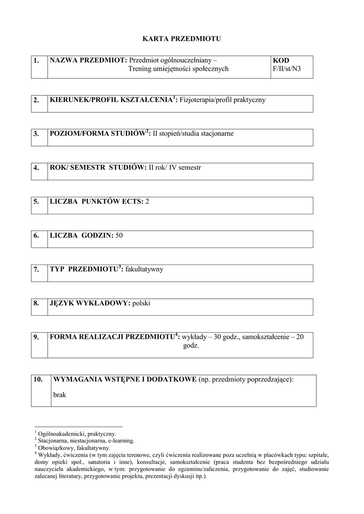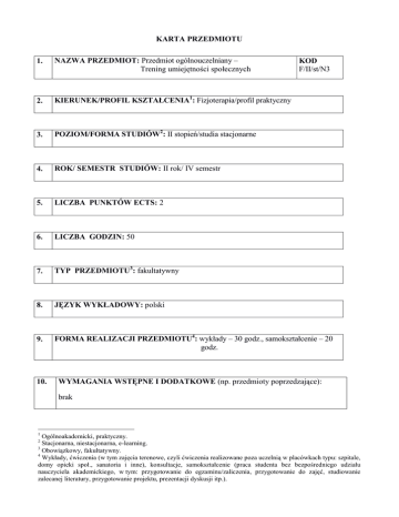 KARTA PRZEDMIOTU 1. NAZWA PRZEDMIOT: Przedmiot ogólnouczelniany – Trening umiejętności społecznych 2. KIERUNEK/PROFIL KSZTAŁCENIA1: Fizjoterapia/profil praktyczny 3. POZIOM/FORMA STUDIÓW2: II stopień/studia stacjonarne 4. ROK/ SEMESTR STUDIÓW: II rok/ IV semestr 5. LICZBA PUNKTÓW ECTS: 2 6. LICZBA GODZIN: 50 7. TYP PRZEDMIOTU3: fakultatywny 8. JĘZYK WYKŁADOWY: polski 9. FORMA REALIZACJI PRZEDMIOTU4: wykłady – 30 godz., samokształcenie – 20 godz. 10. KOD F/II/st/N3 WYMAGANIA WSTĘPNE I DODATKOWE (np. przedmioty poprzedzające): brak 1 Ogólnoakademicki, praktyczny. Stacjonarna, niestacjonarna, e-learning. 3 Obowiązkowy, fakultatywny. 4 Wykłady, ćwiczenia (w tym zajęcia terenowe, czyli ćwiczenia realizowane poza uczelnią w placówkach typu: szpitale, domy opieki społ., sanatoria i inne), konsultacje, samokształcenie (praca studenta bez bezpośredniego udziału nauczyciela akademickiego, w tym: przygotowanie do egzaminu/zaliczenia, przygotowanie do zajęć, studiowanie zalecanej literatury, przygotowanie projektu, prezentacji dyskusji itp.). 2 11. CEL PRZEDMIOTU: Celem przedmiotu jest zapoznanie studenta z kompetencją społeczną, zarządzanie sobą, innymi ludźmi oraz osiągnięcie wysokiej skuteczności interpersonalnej. 12. PRZEDMIOTOWE EFEKTY KSZTAŁCENIA5 P_W01. Ma wiedzę na temat kompetencji społecznych. P_W02. Zna zasady kompetencji społecznych w życiu zawodowym i prywatnym. P_W03. Ma wiedzę na temat problemów i zaburzeń w inter-reakcjach międzyludzkich. P_U01. Potrafi nawiązywać i podtrzymywać satysfakcjonujące związki z innymi ludźmi, zarówno bliskie, intymne, rodzinne, jak i profesjonalne, wynikające z pełnionych ról. P_U02. Umie trafnie oceniać sytuacje społeczne oraz sprawnie myśleć o sytuacjach społecznych. P_K01. Ma świadomość korzyści wynikających z prawidłowych relacji międzyludzkich. P_K02. Rozumie istotę procesów i relacji międzyludzkich. 5 Odniesienie do obszaru Odniesienie do kształcenia zgodnego z obszarowych Krajowymi Ramami efektów Kwalifikacji dla kształcenia Szkolnictwa Wyższego (symbol) (symbol obszaru) Obszar kształcenia w zakresie nauk społecznych. Profil praktyczny (S) Obszar kształcenia w zakresie nauk społecznych. Profil praktyczny (S) Obszar kształcenia w zakresie nauk społecznych. Profil praktyczny (S) Obszar kształcenia w zakresie nauk społecznych. Profil praktyczny (S) S2P_W04 S2P_W05 S2P_W07 S2P_W08 Obszar kształcenia w zakresie nauk społecznych. Profil praktyczny (S) Obszar kształcenia w zakresie nauk społecznych. Profil praktyczny (S) Obszar kształcenia w zakresie nauk społecznych. Profil praktyczny (S) S2P_U05 S2P_U07 S2P_U08 S2P_W05 S2P_W07 S2P_W04 S2P_W05 S2P_W08 S2P_U05 S2P_U07 S2P_U08 S2P_K02 S2P_K03 S2P_K02 S2P_K03 Efekty kształcenia w zakresie wiedzy (P_W), umiejętności (P_U) i kompetencji społecznych (P_K). P_K03. Wykazuje empatię, asertywność, komunikatywność, umiejętność pracy w zespole. 13. S2P_K02 S2P_K03 WERYFIKACJA OSIĄGANIA ZAKŁADANYCH EFEKTÓW KSZTAŁCENIA Symbol przedmiotowego efektu kształcenia P_W01 6 Obszar kształcenia w zakresie nauk społecznych. Profil praktyczny (S) Forma pracy studenta wykłady, samokształcenie P_W02 wykłady, samokształcenie P_W03 wykłady, samokształcenie P_U01 wykłady, samokształcenie P_U02 wykłady, samokształcenie P_K01 wykłady, samokształcenie P_K02 wykłady, samokształcenie P_K03 wykłady, samokształcenie Metody (sposoby) oceny6 Typ oceny7 Forma dokumentacji końcowe zaliczenie pisemne końcowe zaliczenie pisemne końcowe zaliczenie pisemne końcowe zaliczenie pisemne końcowe zaliczenie pisemne końcowe zaliczenie pisemne końcowe zaliczenie pisemne końcowe zaliczenie pisemne podsumowująca test podsumowująca test podsumowująca test podsumowująca test podsumowująca test podsumowująca test podsumowująca test podsumowująca test Ocenianie ciągłe (bieżące przygotowanie do zajęć), śródsemestralne zaliczenie pisemne, śródsemestralne zaliczenie ustne, końcowe zaliczenia pisemne, końcowe zaliczenia ustne, egzamin pisemny, egzamin ustny, praca semestralna, ocena umiejętności ruchowych, praca dyplomowa, projekt, kontrola obecności 7 Formująca, podsumowująca. 14. TREŚCI PROGRAMOWE Treść zajęć Forma zajęć8 (liczba godz.) Symbol przedmiotowych efektów kształcenia 1. Trening umiejętności społecznych jako forma podnoszenia kompetencji społecznych. wykłady (2) 2. Metody kompetencji społecznych. wykłady (2) P_W01, P_W02, P_K01, P_K02, P_K03 P_W01, P_W02, P_K01, P_K02, P_K03 3. 3. Techniki kompetencji społecznych specyficzne dla danego treningu. 4. Rozwijanie kompetencji społecznych w życiu zawodowym i prywatnym. wykłady (2) 5. Treningi interpersonalne, treningi kompetencji społecznych. wykłady (2) 6. Trening umiejętności społecznych. wykłady (2) 7. Formy treningu umiejętności społecznych. wykłady (2) 8. Trening percepcji społecznej. wykłady (2) 9. Techniki stosowane podczas treningu percepcji społecznej. wykłady (2) 10. Trening analizowania sytuacji społecznych. wykłady (2) 11. Trening komunikacji niewerbalnej. 8 Wykłady (2) wykłady (2) P_W01, P_W02, P_K01, P_K02, P_K03 P_W01, P_W02, P_K01, P_K02, P_K03 P_W01, P_W02, P_U02, P_K01, P_K02, P_K03 P_W01, P_W02, P_W03, P_U01, P_K01, P_K02, P_K03 P_W01, P_W02, P_W03, P_K01, P_K02, P_K03 P_W01, P_W02, P_W03, P_K01, P_K02, P_K03 P_W01, P_W02, P_W03, P_U01, P_K01, P_K02, P_K03 P_W01, P_W02, P_W03, P_U01, P_U02, P_K01, P_K02, P_K03 P_W01, P_W02, P_W03, P_U02, P_K01, P_K02, P_K03 Wykłady, ćwiczenia (w tym zajęcia terenowe, czyli ćwiczenia realizowane poza uczelnią w placówkach typu: szpitale, domy opieki społ., sanatoria i inne), konsultacje, samokształcenie (praca studenta bez bezpośredniego udziału nauczyciela akademickiego, w tym: przygotowanie do egzaminu/zaliczenia, przygotowanie do zajęć, studiowanie zalecanej literatury, przygotowanie projektu, prezentacji dyskusji itp.). 12. Trening komunikacji w