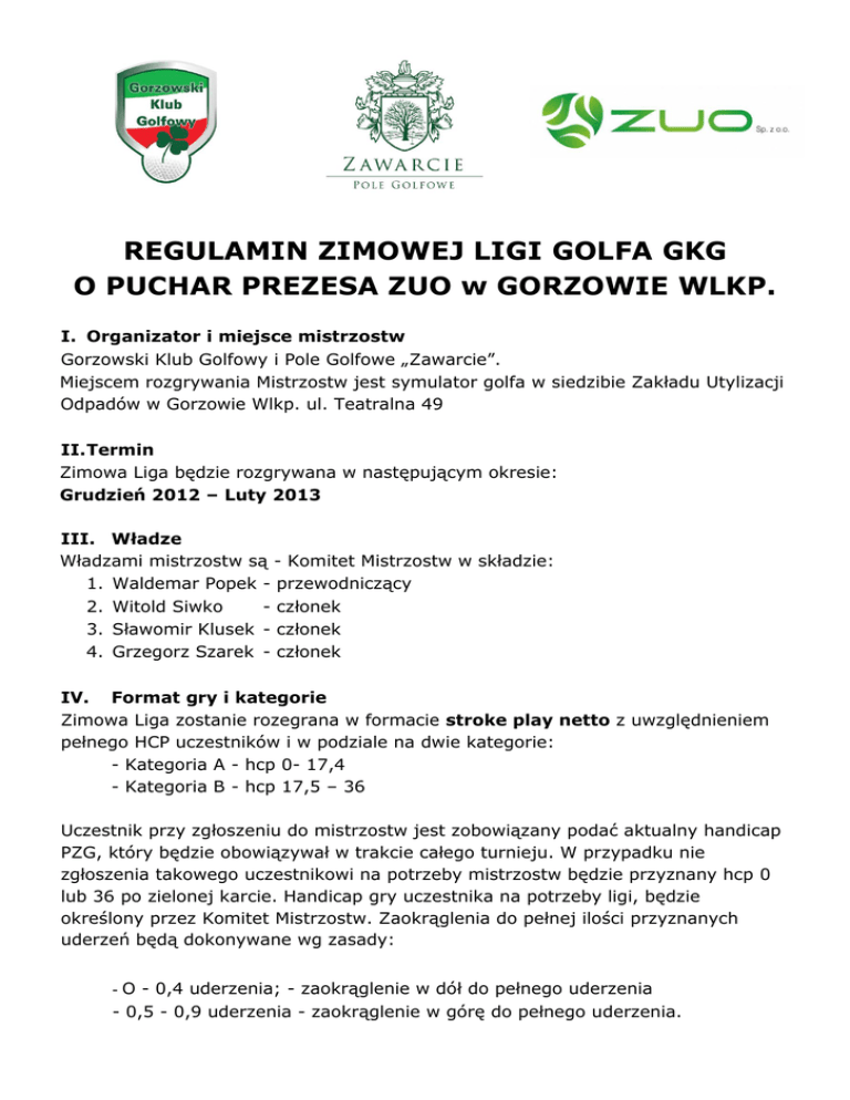 REGULAMIN ZIMOWEJ LIGI GOLFA GKG O PUCHAR PREZESA ZUO w GORZOWIE WLKP. I. Organizator i miejsce mistrzostw Gorzowski Klub Golfowy i Pole Golfowe „Zawarcie”. Miejscem rozgrywania Mistrzostw jest symulator golfa w siedzibie Zakładu Utylizacji Odpadów w Gorzowie Wlkp. ul. Teatralna 49 II. Termin Zimowa Liga będzie rozgrywana w następującym okresie: Grudzień 2012 – Luty 2013 III. Władze Władzami mistrzostw są - Komitet Mistrzostw w składzie: 1. Waldemar Popek - przewodniczący 2. Witold Siwko - członek 3. Sławomir Klusek - członek 4. Grzegorz Szarek - członek IV. Format gry i kategorie Zimowa Liga zostanie rozegrana w formacie stroke play netto z uwzględnieniem pełnego HCP uczestników i w podziale na dwie kategorie: - Kategoria A - hcp 0- 17,4 - Kategoria B - hcp 17,5 – 36 Uczestnik przy zgłoszeniu do mistrzostw jest zobowiązany podać aktualny handicap PZG, który będzie obowiązywał w trakcie całego turnieju. W przypadku nie zgłoszenia takowego uczestnikowi na potrzeby mistrzostw będzie przyznany hcp 0 lub 36 po zielonej karcie. Handicap gry uczestnika na potrzeby ligi, będzie określony przez Komitet Mistrzostw. Zaokrąglenia do pełnej ilości przyznanych uderzeń będą dokonywane wg zasady: - O - 0,4 uderzenia; - zaokrąglenie w dół do pełnego uderzenia - 0,5 - 0,9 uderzenia - zaokrąglenie w górę do pełnego uderzenia. W turnieju obowiązują reguły Royal & Ancient Golf Club of St. Andrews. Uczestnicy ligi w określonych terminach zaliczają grę na poszczególnych polach, a uzyskany wynik sumuje się do ogólnego wyniku. Przykład: zawodnik na polu nr 1 uzyskał wynik 102 (uderzenia brutto) od tego wyniku odejmujemy aktualny handicap np.: 19 i uzyskujemy ilość pkt do ogólnej klasyfikacji 102 – 19 = 83 pkt V. Terminy rozegrania rund na poszczególnych polach: Nazwa pola, termin rozegrania oficjalnej rundy na danym polu: 1. AVIARA – FOUR SEASONS - 10.12.2012 - 16.12.2012 2. BELFRY - 17.12.2012 - 23.12.2012 3. BOUNTIFUL RIDGE - 07.01.2013 - 13.01.2013 4. FIRESTONE C.C. – SOUTH COURSE 5. FRANKFURTER GOLF CLUB - 14.01.2013 - 20.01.2013 - 21.01.2013 - 27.01.2013 6. LOCH LOMOND GOLF CLUB - 28.01.2013 - 03.02.2013 7. NEW SOUTH WALES - 04.02.2013 - 10.02.2013 8. ST. ANDREWS LINKS – OLD COURSE - 11.02.2013 - 17.02.2013 9. TORREY PINES – SOUTH COURSE - 18.02.2013 - 24.02.2013 10. VALDERRAMA GOLF CLUB - 25.02.2013 - 03.03.2013 Przed przystąpieniem do gry w rundzie, która ma być oficjalnie zaliczona do wyniku uczestnika ma on obowiązek zgłoszenia tego faktu w recepcji „symulatora”, zarezerwowanie terminu gry pod numerem 603630710 oraz zapewnienie markera, którym może być wyłącznie inny uczestnik mistrzostw zgłoszony w tej samej kategorii co zainteresowany gracz lub obsługujący symulator instruktor golfa obecny podczas rundy. Gracz może zaliczyć rundę sam lub w grupach dowolnych.. Po zakończeniu każdej rundy musi on niezwłocznie podać wynik obecnemu na symulatorze instruktorowi golfa. Dopuszczalne jest łączenie rozegrania dwóch rund w jednym dniu. VI. Klasyfikacja i wyniki Na końcowy wynik uczestnika składają się wyniki uzyskane w oficjalnie zgłoszonych rundach turniejowych. Suma uzyskanych punktów stanowić będzie podstawę do klasyfikacji końcowej. VII. Ogłoszenie wyników i nagrody Uroczyste zakończenie ligi oraz wręczenie atrakcyjnych nagród w poszczególnych kategoriach odbędzie się 03.03.2013 o godz. 13.00 VIII. Zgłoszenie Zgłoszenia do mistrzostw będą przyjmowane do dnia 08.12.2012 r. do godz. 18.00 telefonicznie pod numerem 501438211 oraz potwierdzone mailem na adres: [email protected] Zgłoszenie powinno zawierać: 1. 2. 3. 4. Imię i nazwisko Aktualny HCP (lub jego brak) Przynależność do klubu golfowego/ lub niezrzeszony Numer telefonu i adres mailowy (wyłącznie na użytek turnieju) IX. Opłaty 1.Wpisowe w wysokości 20 zł - wnoszone jest przez uczestnika bezpośrednio przed pierwszą grą za cały udział w lidze u instruktorów golfa na symulatorze. Zgłoszenia dokonane bez wniesienia wpisowego będą uznane za niebyłe. 2. Każdorazowa opłata za grę na symulatorze wynosi wg cennika ustalonego przez ZUO w Gorzowie Wlkp. - poniedziałek – niedziela – 30 zł za 1 godz. gry. Nie ma limitu czasu na rozegranie rundy. Np.: 4 zawodników gra rundę 3 godz. - opłata za symulator wynosi 90 zł co na jednego gracza wynosi 22,50 zł X. Sprawy wątpliwe i sporne W sprawach wątpliwych i spornych instancją rozstrzygającą jest Komitet Mistrzostw, którego postanowienia na użytek turnieju są ostateczne i nie odlegające zaskarżeniu. Wszyscy uczestnicy ligi rozgrywają rundy na poszczególnych polach przy jednakowych parametrach ustawienia symulatora ustalonych przez instruktora obsługującego go, bez możliwości zmian przez grających pod karą dyskwalifikacji.