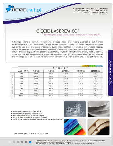 a, macj subli nsfer, a r t o , term pondruk anie, tam gad¿ety, grawerow nie owa iask p , nie cze , t³o owy r e t pu kom haft E -LIN A ON IENI W MÓ - ZA ul. Sk³adowa 12 lok. 2, 15-399 Bia³ystok tel. 085 744 09 95, fax. 085 744 09 94 e-mail: [email protected] 2 CIÊCIE LASEREM CO materia³y: plexi, sklejka, papier, karton, laminaty, korek, skóra, tekstylia. Technologia laserowa zapewnia niesamowit¹ precyzjê ciêcia oraz wysok¹ prêdkoœæ z zachowaniem C E N N I K 1-25 mb 26-50 mb 51-100 mb 101-250 mb 251-500 mb 1 mm 2,40 z³ 2,00 z³ 1,80 z³ 1,25 z³ 1,10 z³ 2 mm 3,20 z³ 3,00 z³ 2,20 z³ 2,00 z³ 1,55 z³ 3 mm 3,90 z³ 3,40 z³ 2,65 z³ 2,35 z³ 1,75 z³ 4 mm 4,20 z³ 3,60 z³ 3,00 z³ 2,70 z³ 1,85 z³ 5 mm 4,40 z³ 3,80 z³ 3,35 z³ 2,95 z³ 1,90 z³ 6 mm 4,70 z³ 4,25 z³ 3,90 z³ 3,35 z³ 2,40 z³ 7 mm 5,00 z³ 4,80 z³ 4,45 z³ 3,90 z³ 2,80 z³ 8 mm 6,20 z³ 5,80 z³ 5,20 z³ 4,30 z³ 3,45 z³ 9 mm 6,90 z³ 6,50 z³ 5,80 z³ 4,60 z³ 3,85 z³ 10 mm 10,60 z³ 9,45 z³ 7,70 z³ 5,90 z³ 4,90 z³ gruboœæ materia³u gruboœæ • • • • • iloœæ mb wykonanie próby ciêcia - GRATIS! uruchomienie procesu: op³ata 20 z³ cena nie zawiera materia³u do ciêcia zlecenia ekspresowe: + 50% ceny z tabeli materia³y trudne w obróbce kalkulowane s¹ indywidualnie CENY NETTO NALE¯Y DOLICZYÆ 22% VAT ACME Karina Rafa³ko ul. Sk³adowa 12 lok. 2, 15-399 Bia³ystok, NIP: 542-259-17-53, REGON: 200011894 Konto Multibank: 37 1140 2017 0000 4202 0446 9938 tel. 085 744 09 95, fax. 085 744 09 94, kom. 509 551 398, e-mail: [email protected] CIÊCIE LASEREM CO2 g³adkich krawêdzi - bez koniecznoœci dalszej obróbki materia³u. Lasery CO2 zosta³y stworzone do ciêcia p³yt akrylowych plexi oraz innych materia³ów. Dziêki technologi laserowej mo¿liwe jest wyciêcie ka¿dego kszta³tu, co pozwala na zaprojektowanie i wykonanie oryginalnych produktów: litery przestrzenne, tabliczki, breloki, dyplomy, zegary, stojaki, prezentery, podk³adki, wizytówki, identyfikatory, ¿etony, medale, odznaki, trofea oraz inne nietypowe elementy w reklamie wizualnej. Pliki do ciêcia nale¿y dostarczyæ wg. formatki pola roboczego 72x43 cm - w formacie wektorowym (zamienione na krzywe) Corel Draw 11 lub pdf w skali 1:1.