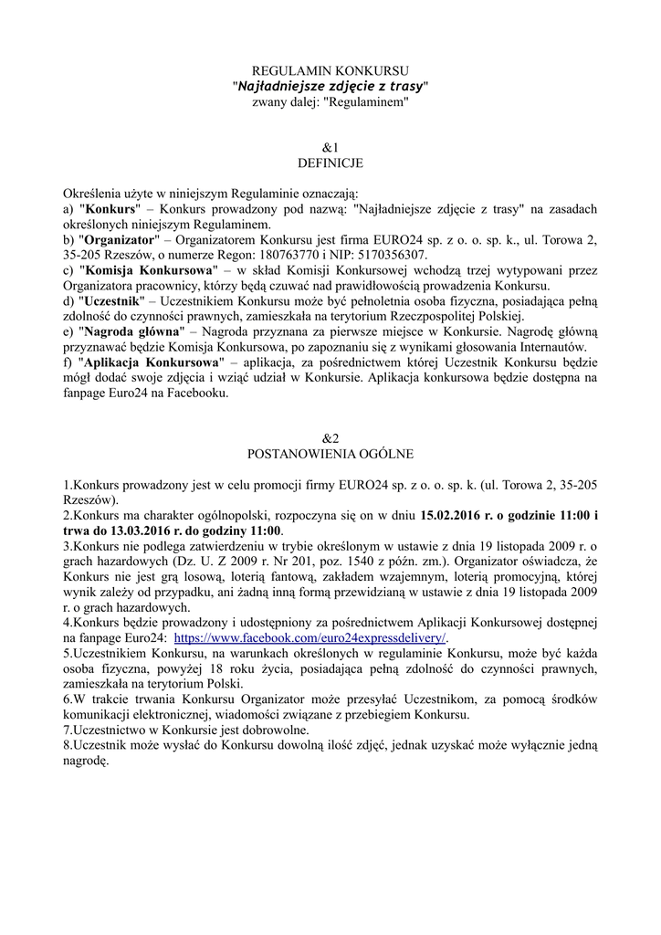 REGULAMIN KONKURSU "Najładniejsze zdjęcie z trasy" zwany dalej: "Regulaminem" &1 DEFINICJE Określenia użyte w niniejszym Regulaminie oznaczają: a) "Konkurs" – Konkurs prowadzony pod nazwą: "Najładniejsze zdjęcie z trasy" na zasadach określonych niniejszym Regulaminem. b) "Organizator" – Organizatorem Konkursu jest firma EURO24 sp. z o. o. sp. k., ul. Torowa 2, 35-205 Rzeszów, o numerze Regon: 180763770 i NIP: 5170356307. c) "Komisja Konkursowa" – w skład Komisji Konkursowej wchodzą trzej wytypowani przez Organizatora pracownicy, którzy będą czuwać nad prawidłowością prowadzenia Konkursu. d) "Uczestnik" – Uczestnikiem Konkursu może być pełnoletnia osoba fizyczna, posiadająca pełną zdolność do czynności prawnych, zamieszkała na terytorium Rzeczpospolitej Polskiej. e) "Nagroda główna" – Nagroda przyznana za pierwsze miejsce w Konkursie. Nagrodę główną przyznawać będzie Komisja Konkursowa, po zapoznaniu się z wynikami głosowania Internautów. f) "Aplikacja Konkursowa" – aplikacja, za pośrednictwem której Uczestnik Konkursu będzie mógł dodać swoje zdjęcia i wziąć udział w Konkursie. Aplikacja konkursowa będzie dostępna na fanpage Euro24 na Facebooku. &2 POSTANOWIENIA OGÓLNE 1.Konkurs prowadzony jest w celu promocji firmy EURO24 sp. z o. o. sp. k. (ul. Torowa 2, 35-205 Rzeszów). 2.Konkurs ma charakter ogólnopolski, rozpoczyna się on w dniu 15.02.2016 r. o godzinie 11:00 i trwa do 13.03.2016 r. do godziny 11:00. 3.Konkurs nie podlega zatwierdzeniu w trybie określonym w ustawie z dnia 19 listopada 2009 r. o grach hazardowych (Dz. U. Z 2009 r. Nr 201, poz. 1540 z późn. zm.). Organizator oświadcza, że Konkurs nie jest grą losową, loterią fantową, zakładem wzajemnym, loterią promocyjną, której wynik zależy od przypadku, ani żadną inną formą przewidzianą w ustawie z dnia 19 listopada 2009 r. o grach hazardowych. 4.Konkurs będzie prowadzony i udostępniony za pośrednictwem Aplikacji Konkursowej dostępnej na fanpage Euro24: https://www.facebook.com/euro24expressdelivery/. 5.Uczestnikiem Konkursu, na warunkach określonych w regulaminie Konkursu, może być każda osoba fizyczna, powyżej 18 roku życia, posiadająca pełną zdolność do czynności prawnych, zamieszkała na terytorium Polski. 6.W trakcie trwania Konkursu Organizator może przesyłać Uczestnikom, za pomocą środków komunikacji elektronicznej, wiadomości związane z przebiegiem Konkursu. 7.Uczestnictwo w Konkursie jest dobrowolne. 8.Uczestnik może wysłać do Konkursu dowolną ilość zdjęć, jednak uzyskać może wyłącznie jedną nagrodę. &3 ZASADY PROWADZENIA KONKURSU 1.Aby wziąć udział w Konkursie należy spełnić warunki: a) Zapoznać się z treścią Regulaminu Konkursu zamieszczoną na stronie http://euro24.co/, wyrazić zgodę na postanowienia Regulaminu oraz wyrazić zgodę na pozostałe oświadczenia zawarte w Aplikacji Konkursowej. b) Przesłać zdjęcie, zrobione przez Uczestnika Konkursu podczas wyjazdu służbowego w trasę, wraz z podpisem miejsca, które zostało uwiecznione na fotografii za pośrednictwem aplikacji na fanpage Euro24: https://www.facebook.com/euro24expressdelivery/. c) Wypełnić formularz zgłoszeniowy podając wymagane dane osobowe, dostępny w aplikacji na fanpage Euro24: https://www.facebook.com/euro24expressdelivery/. 2.Spełnienie warunków określonych w ustępie 1 pkt a-c niniejszego paragrafu stanowi zgłoszenie (zwane dalej "Zgłoszeniem Konkursowym"). 3.Każdy uczestnik Konkursu może zgłosić za pośrednictwem aplikacji konkursowej na fanpage Euro24: https://www.facebook.com/euro24expressdelivery/ dowolną ilość osobnych zdjęć spełniających warunki zawarte w &3 ustęp b. Jedna osoba może jednak otrzymać tylko jedną nagrodę. 4.Zgłoszenia Konkursowe niespełniające wymogów określonych w &3 nie będą przyjmowane. 5.Wszystkie zgłoszenia Uczestników Konkursu będą zapisywane w bazie danych Organizatora. 6.Nadesłane Zgłoszenia Konkursowe nie mogą zawierać treści wulgarnych, obraźliwych lub naruszających dobra osobiste innych osób, nie mogą także zawierać znaków towarowych żadnych firm, dopuszczalny jest jedynie znak Euro24. 7.Uczestnicy Konkursu są zobowiązani do przestrzegania niniejszego Regulaminu. Nieprzestrzeganie Regulaminu może skutkować wykluczeniem Uczestnika z udziału w Konkursie. 8.Organizator zastrzega sobie prawo do nie publikowania lub usunięcia zdjęć, które uzna za niestosowne lub niewpisujące się w konwencję Konkursu. 9.Uczestnik przesyłając zdjęcie udziela niewyłącznej, nieodpłatnej licencji na przetwarzanie lub wykorzystanie zdjęcia przez Euro24 z siedzibą w Rzeszowie (adres: ul. Torowa 2, 35-205 Rzeszów), w szczególności dodanie logo firmy Euro24, publikację zdjęcia w Internecie, wykorzystanie go w działaniach promocyjnych dotyczących Konkursu, jak również w celu przeprowadzenia i rozstrzygnięcia Konkursu. &4 PRAWA AUTORSKIE 1.Każdy Uczestnik, który wysłał zdjęcie w ramach Konkursu oświadcza, że jest wyłącznym autorem wykonanego zdjęcia i posiada pełne prawa majątkowe i osobiste prawa autorskie i oświadcza, że posiada wiedzę, że wykonane zdjęcie w ramach Konkursu nie narusza autorskich praw majątkowych i osobistych osób trzecich. 2.Uczestnik zwolni Organizatora od wszelkich roszczeń osób trzecich wynikających z faktu, że autorskie prawa majątkowe i osobiste do publikowanego w ramach Aplikacji Konkursowej oraz nagrodzonego zdjęcia przenoszone na Organizatora na podstawie postanowień niniejszego Regulaminu, nie przysługiwały Uczestnikowi w dacie wydania nagrody. 3.Uczestnik oświadcza, że posiada zgodę osób widniejących na przesłanych przez niego fotografiach, lub w wypadku osób niepełnoletnich zgodę ich opiekunów prawnych, na rozpowszechnianie ich wizerunku w ramach Konkursu oraz w materiałach promocyjnych dotyczących Konkursu, także podawanych do publicznej wiadomości na portalac