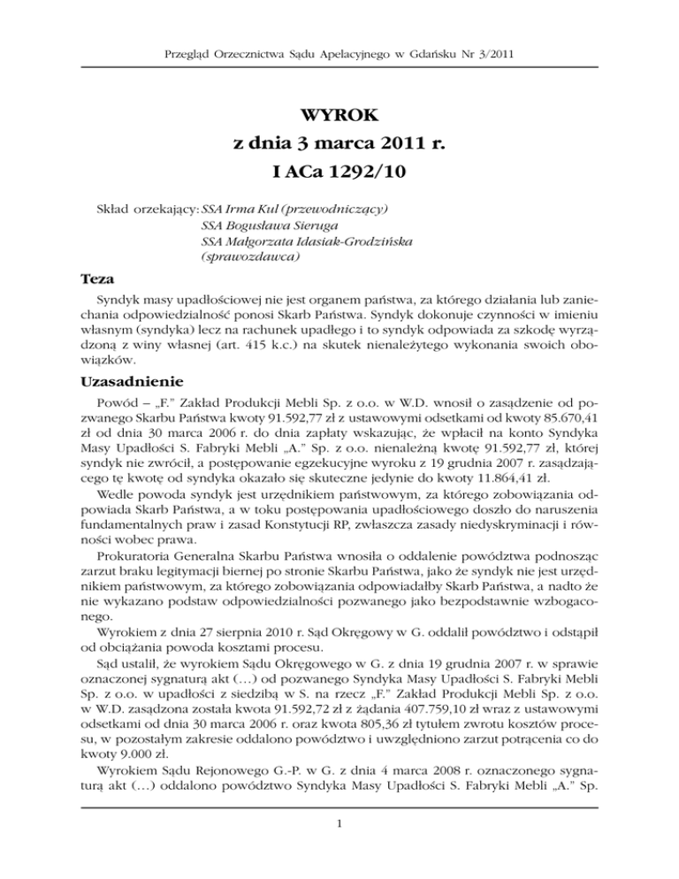 Przegl¹d Orzecznictwa S¹du Apelacyjnego w Gdañsku Nr 3/2011 WYROK z dnia 3 marca 2011 r. I ACa 1292/10 Sk³ad orzekaj¹cy:SSA Irma Kul (przewodnicz¹cy) SSA Bogus³awa Sieruga SSA Ma³gorzata Idasiak-Grodziñska (sprawozdawca) Teza Syndyk masy upad³ociowej nie jest organem pañstwa, za którego dzia³ania lub zaniechania odpowiedzialnoæ ponosi Skarb Pañstwa. Syndyk dokonuje czynnoci w imieniu w³asnym (syndyka) lecz na rachunek upad³ego i to syndyk odpowiada za szkodê wyrz¹dzon¹ z winy w³asnej (art. 415 k.c.) na skutek nienale¿ytego wykonania swoich obowi¹zków. Uzasadnienie Powód F. Zak³ad Produkcji Mebli Sp. z o.o. w W.D. wnosi³ o zas¹dzenie od pozwanego Skarbu Pañstwa kwoty 91.592,77 z³ z ustawowymi odsetkami od kwoty 85.670,41 z³ od dnia 30 marca 2006 r. do dnia zap³aty wskazuj¹c, ¿e wp³aci³ na konto Syndyka Masy Upad³oci S. Fabryki Mebli A. Sp. z o.o. nienale¿n¹ kwotê 91.592,77 z³, której syndyk nie zwróci³, a postêpowanie egzekucyjne wyroku z 19 grudnia 2007 r. zas¹dzaj¹cego tê kwotê od syndyka okaza³o siê skuteczne jedynie do kwoty 11.864,41 z³. Wedle powoda syndyk jest urzêdnikiem pañstwowym, za którego zobowi¹zania odpowiada Skarb Pañstwa, a w toku postêpowania upad³ociowego dosz³o do naruszenia fundamentalnych praw i zasad Konstytucji RP, zw³aszcza zasady niedyskryminacji i równoci wobec prawa. Prokuratoria Generalna Skarbu Pañstwa wnosi³a o oddalenie powództwa podnosz¹c zarzut braku legitymacji biernej po stronie Skarbu Pañstwa, jako ¿e syndyk nie jest urzêdnikiem pañstwowym, za którego zobowi¹zania odpowiada³by Skarb Pañstwa, a nadto ¿e nie wykazano podstaw odpowiedzialnoci pozwanego jako bezpodstawnie wzbogaconego. Wyrokiem z dnia 27 sierpnia 2010 r. S¹d Okrêgowy w G. oddali³ powództwo i odst¹pi³ od obci¹¿ania powoda kosztami procesu. S¹d ustali³, ¿e wyrokiem S¹du Okrêgowego w G. z dnia 19 grudnia 2007 r. w sprawie oznaczonej sygnatur¹ akt ( ) od pozwanego Syndyka Masy Upad³oci S. Fabryki Mebli Sp. z o.o. w upad³oci z siedzib¹ w S. na rzecz F. Zak³ad Produkcji Mebli Sp. z o.o. w W.D. zas¹dzona zosta³a kwota 91.592,72 z³ z ¿¹dania 407.759,10 z³ wraz z ustawowymi odsetkami od dnia 30 marca 2006 r. oraz kwota 805,36 z³ tytu³em zwrotu kosztów procesu, w pozosta³ym zakresie oddalono powództwo i uwzglêdniono zarzut potr¹cenia co do kwoty 9.000 z³. Wyrokiem S¹du Rejonowego G.-P. w G. z dnia 4 marca 2008 r. oznaczonego sygnatur¹ akt ( ) oddalono powództwo Syndyka Masy Upad³oci S. Fabryki Mebli A. Sp. 1 Przegl¹d Orzecznictwa S¹du Apelacyjnego w Gdañsku Nr 3/2011 z o.o. w S. przeciwko F. Zak³adowi Produkcji Mebli Sp. z o.o. w W.D. oraz zas¹dzi³ od powoda na rzecz pozwanego kwotê 2.417 z³ tytu³em kosztów zastêpstwa procesowego. Nastêpnie wyrokiem S¹du Okrêgowego w G. z dnia 27 czerwca 2008 r. oznaczonego sygnatur¹ akt ( ) oddalono apelacjê powoda. Powód F. Zak³ad Produkcji Mebli Sp. z o.o. z siedzib¹ w W.D. wzywa³ Syndyka Masy Upad³oci do dobrowolnego zaspokojenia zas¹dzonych wyrokami nale¿noci, lecz bezskutecznie. Na podstawie powy¿ej wskazanych orzeczeñ wszczête zosta³y postêpowania egzekucyjne przed Komornikiem S¹dowym przy S¹dzie Rejonowym w G. J.B. oznaczone sygnatur¹ akt KM ( ) oraz przed Komornikiem S¹dowym przy S¹dzie Rejonowym w S.G. J.B. oznaczone sygnatur¹ akt KM ( ). W toku egzekucji wyegzekwowana zosta³a tylko czêæ nale¿noci zas¹dzonej na rzecz powoda od Syndyka Masy Upad³oci. W przewa¿aj¹cym zakresie S¹d ustali³ stan faktyczny w sprawie w oparciu o z³o¿one przez stronê powodow¹ dokumenty, przedstawione i za³¹czone w poczet materia³u dowodowego akta postêpowania upad³ociowego oraz postêpowania egzekucyjnego prowadzonego przez Komornika S¹dowego przy S¹dzie Rejonowym w S.G. J.B. ( ) oraz w oparciu o zeznania strony powodowej. S¹d Okrêgowy oddali³ powództwo i zwa¿y³, ¿e zgodnie z art. 156 ustawy z dnia 28 lutego 2003 r. prawo upad³ociowe i naprawcze (Dz.U. z 2009 r. Nr 75, poz. 1361 ze zm, dalej u.p.u.n.) syndyka powo³uje siê w razie og³oszenia upad³oci obejmuj¹cej likwidacjê maj¹tku. Postêpowaniem kieruje sêdzia-komisarz, który sprawuje nadzór nad czynnociami syndyka (art. 152 u.p.u.n.), jednak¿e nie ponosi on odpowiedzialnoci za dzia³ania syndyka. W judykaturze uznaje siê, ¿e w relacji pomiêdzy syndykiem a sêdzi¹-komisarzem (czy te¿ s¹dem) nie zachodzi stosunek prawny zbli¿ony do stosunku pomiêdzy pracownikiem a pracodawc¹, ani co do warunków wykonywania przez syndyka czynnoci w ramach postêpowania upad³ociowego, ani co do wynagrodzenia, czy te¿ co do odpowiedzialnoci sêdziego-komisarza (s¹du) za wykonanie czynnoci przez syndyka (wyrok NSA z 17 padziernika 2006 r., II FSK 86/06). Stanowisko to zosta³o potwierdzone oraz rozwiniête w wyroku Naczelnego S¹du Administracyjnego z dnia 5 kwietnia 2007 r. gdzie wskazano, i¿ stosunek ³¹cz¹cy syndyka z s¹dem, czy te¿ sêdzi¹ komisarzem nie ma charakteru zbli¿onego do stosunku pracy pomiêdzy pracownikiem a pracodawc¹ (...). Kierowanie tokiem postêpowania upad³ociowego przez sêdziego komisarza i nadzór nad czynnociami syndyka wynikaj¹cy z art. 152 u.p.u.n. nie oznacza, ¿e warunki wykonywania czynnoci przez syndyka s¹ zbli¿one do warunków, w jakich wiadcz¹ pracê pracownicy w ramach stosunku pracy. Syndyk w postêpowaniu upad³ociowym wykonuje czynnoci na rachunek upad³ego, lecz w imieniu w³asnym (art. 160 ust. 1 u.p.u.n.). Syndyk nie odpowiada za zobowi¹zania zaci¹gniête w sprawach dotycz¹cych masy upad³oci (art. 160 ust. 2 u.p.u.n) a ryzyko gospodarcze ponosi masa upad³oci. Odpowiedzialnoci za te czynnoci nie ponosi równie¿ s¹d (Skarb Pañstwa). S¹d te¿ nie odpowiada za szkodê wyrz¹dzon¹ na skutek nienale¿ytego wykonania obowi¹zków przez syndyka. Na podstawie art. 160 ust. 3 u.p.u.n. za w/w szkodê odpowiada bezporednio syndyk. Wynagrodzenie syndyka, jak i zwrot wydatków ustalane jest wprawdzie przez s