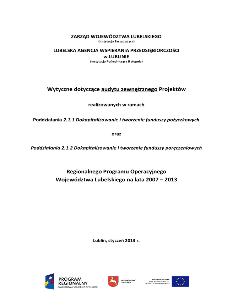 ZARZĄD WOJEWÓDZTWA LUBELSKIEGO (Instytucja Zarządzająca) LUBELSKA AGENCJA WSPIERANIA PRZEDSIĘBIORCZOŚCI w LUBLINIE (Instytucja Pośrednicząca II stopnia) Wytyczne dotyczące audytu zewnętrznego Projektów realizowanych w ramach Poddziałania 2.1.1 Dokapitalizowanie i tworzenie funduszy pożyczkowych oraz Poddziałania 2.1.2 Dokapitalizowanie i tworzenie funduszy poręczeniowych Regionalnego Programu Operacyjnego Województwa Lubelskiego na lata 2007 – 2013 Lublin, styczeń 2013 r. Wytyczne dotyczące audytu zewnętrznego projektów realizowanych w ramach Poddziałania 2.1.1 i 2.1.2 Regionalnego Programu Operacyjnego Województwa Lubelskiego na lata 2007 – 2013 WSTĘP Zgodnie z umową o dofinansowanie Projektów realizowanych w ramach Poddziałania 2.1.1 Dokapitalizowanie i tworzenie funduszy pożyczkowych i 2.1.2 Dokapitalizowanie i tworzenie funduszy poręczeniowych II Osi Priorytetowej Regionalnego Programu Operacyjnego Województwa Lubelskiego na lata 2007 – 2013 Beneficjent Projektu zobowiązany jest do przeprowadzenia audytu zewnętrznego, w przypadku gdy jego wartość przekracza 20 000 000, 00 PLN. Audyt, zgodnie z § 9 pkt 9 „Beneficjent zobowiązuje się do wyboru audytora i poddania się audytowi zgodnie z obowiązującymi przepisami prawa. Ponadto w przypadku gdy całkowita wartość kapitału przeznaczonego na realizację Projektu przekracza 20 000 000,00 PLN Beneficjent podda się audytowi zewnętrznemu, co najmniej jeden raz w okresie realizacji Projektu po zaangażowaniu 60% kapitału przeznaczonego na realizację Projektu w ramach jednokrotnego obrotu kapitałem, w terminie wyznaczonym przez Instytucję Pośredniczącą II stopnia” Opracowując niniejsze Wytyczne przyjęto, że audytem zewnętrznym jest zakres działań, którego celem jest uzyskanie racjonalnego zapewnienia, że Projekt jest realizowany zgodnie z umową i wnioskiem o dofinansowanie oraz obowiązującymi przepisami prawa. Prawidłowo i rzetelnie przeprowadzony audyt Projektu współfinansowanego ze środków Unii Europejskiej, Regionalnego Programu Operacyjnego Województwa Lubelskiego na lata 2007 – 2013 stanowi niezależne potwierdzenie prawidłowości realizacji Projektu. Wydatki poniesione przez Beneficjenta na przeprowadzenie audytu zewnętrznego Projektu są kwalifikowalne, o ile zostały przewidziane w zatwierdzonym budżecie Projektu (są możliwe do rozliczenia w ramach Projektu), spełniają warunki kwalifikowalności wydatków dla Poddziałania 2.1.1 i 2.1.2 a także wymogi, o których mowa w dalszej części Wytycznych. WYBÓR AUDYTORA Audyt zewnętrzny powinien zostać przeprowadzony przez podmiot i/lub audytorów niezależnych od jednostki audytowanej (Beneficjenta), co powinno zostać potwierdzone deklaracją bezstronności. Bezstronność i niezależność audytora nie zostaje zachowana jeśli audytor lub podmiot przeprowadzający audyt zewnętrzny: posiada udziały, akcje lub inne tytuły własności w jednostce pełniącej rolę Beneficjenta lub w jednostce z nią stowarzyszonej, dominującej lub współzależnej; jest lub był w ostatnich 3 latach przedstawicielem prawnym (pełnomocnikiem), członkiem organów nadzorujących, zarządzających bądź administrujących lub pracownikiem jednostki Strona 2 z 6 Wytyczne dotyczące audytu zewnętrznego projektów realizowanych w ramach Poddziałania 2.1.1 i 2.1.2 Regionalnego Programu Operacyjnego Województwa Lubelskiego na lata 2007 – 2013 pełniącej rolę Beneficjenta, jednostki stowarzyszonej, dominującej, zależnej lub współzależnej; w ostatnich 3 latach uczestniczył w sporządzaniu dokumentów stanowiących przedmiot audytu, nie dokonywał również badania sprawozdania finansowego audytowanego podmiotu w okresie min. 3 lat poprzedzających audyt; osiągnął chociażby w jednym roku w ciągu ostatnich 5 lat co najmniej 40% przychodu rocznego z tytułu świadczenia usług na rzecz danej jednostki, jednostki wobec niej dominującej lub jednostek z nią stowarzyszonych, jednostek od niej zależnych lub współzależnych (nie dotyczy to pierwszego roku działalności podmiotu przeprowadzającego audyt); jest małżonkiem, krewnym lub powinowatym w linii prostej do drugiego stopnia lub jest związany z tytułu opieki, przysposobienia lub kurateli z osobą zarządzającą lub będącą w organach nadzorczych jednostki albo zatrudnia przy prowadzeniu audytu takie osoby; jest lub był zaangażowany w planowanie, przygotowanie, realizację lub zarządzanie Projektem; z innych powodów (faktycznych, formalnych lub prawnych) nie spełnia kryterium niezależności lub bezstronności względem jednostki audytowanej. Audyt powinien zostać przeprowadzony przez osobę spełniającą warunki określone w art. 286 ustawy z dnia 27 sierpnia 2009 r. o finansach publicznych (Dz. U. Nr 157, poz. 1240, z późn. Zm.) lub osobę prawną lub jednostkę organizacyjną nieposiadającą osobowości prawnej, zatrudniającą przy przeprowadzaniu audytu osoby, o których mowa w w/w artykule. Zgodnie z ustawą o finansach publicznych, audytorem wewnętrznym może być osoba, która: 1. ma obywatelstwo państwa członkowskiego Unii Europejskiej lub innego państwa, którego obywatelom, na podstawie umów międzynarodowych lub przepisów prawa wspólnotowego, przysługuje prawo podjęcia zatrudnienia na terytorium Rzeczypospolitej Polskiej; 2. ma pełną zdolność do czynności prawnych oraz korzysta z pełni praw publicznych; 3. nie była karana za umyślne przestępstwo lub umyślne przestępstwo skarbowe; 4. posiada wyższe wykształcenie; 5. posiada następujące kwalifikacje do przeprowadzania audytu wewnętrznego: a. jeden z certyfikatów: Certified Internal Auditor (CIA), Certified Government Auditing Professional (CGAP), Certified Information Systems Auditor (CISA), Association of Chartered Certified Accountants (ACCA), Certified Fraud Examiner (CFE), Certification in Control Self Assessment (CCSA), Certified Financial Services Aud