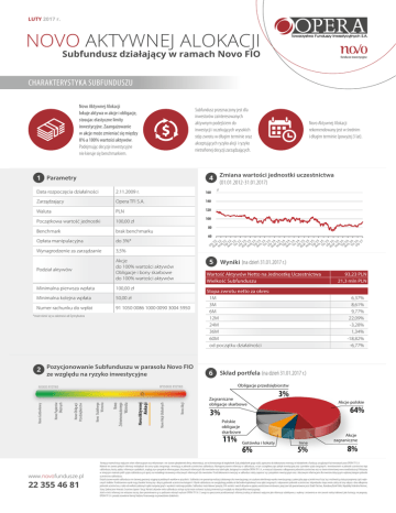 LUTY 2017 r. NOVO AKTYWNEJ ALOKACJI Subfundusz działający w ramach Novo FIO CHARAKTERYSTYKA SUBFUNDUSZU Novo Aktywnej Alokacji lokuje aktywa w akcje i obligacje, stosujac elastyczne limity inwestycyjne. Zaangażowanie w akcje może zmieniać się między 0% a 100% wartości aktywów. Podejmując decyzje inwestycyjne nie kieruje się benchmarkiem. Subfundusz przeznaczony jest dla inwestorów zainteresowanych aktywnym podejściem do inwestycji i oczekujących wysokich stóp zwrotu w długim terminie oraz akceptujących ryzyko akcji i ryzyko nietrafionej decyzji zarządzających. 4 Zmiana wartości jednostki uczestnictwa (01.01.2012-31.01.2017) 1 Parametry Data rozpoczęcia działalności 2.11.2009 r. 160 Zarządzający Opera TFI S.A. 140 Waluta PLN 120 Początkowa wartość jednostki 100,00 zł Benchmark brak benchmarku Opłata manipulacyjna do 3%* Wynagrodzenie za zarządzanie 3,5% Podział aktywów Akcje do 100% wartości aktywów Obligacje i bony skarbowe do 100% wartości aktywów Minimalna pierwsza wpłata 100,00 zł Minimalna kolejna wpłata 50,00 zł Numer rachunku do wpłat 91 1050 0086 1000 0090 3004 5950 80 60 5 Wyniki (na dzień 31.01.2017 r.) Wartość Aktywów Netto na Jednostkę Uczestnictwa Wielkość Subfunduszu 2 Pozycjonowanie Subfunduszu w parasolu Novo FIO ze względu na ryzyko inwestycyjne Novo Akcji Novo Akcji Globalnych Novo Aktywnej Alokacji Novo Zrównoważonego Wzrostu Novo Stabilnego Wzrostu Novo Obligacji Przedsiębiorstw Novo Papierów Dłużnych Stopa zwrotu netto za okres: 1M 3M 6M 12M 24M 36M 60M od początku działalności 6,37% 8,61% 9,77% 22,09% -3,28% 1,34% -18,82% -6,77% Obligacje przedsiębiorstw Zagraniczne obligacje skarbowe 3% Akcje polskie 64% 3% Polskie obligacje skarbowe 11% Gotówka i lokaty 6% 22 355 46 81 93,23 PLN 21,3 mln PLN 6 Skład portfela (na dzień 31.01.2017 r.) WYSOKIE RYZYKO NISKIE RYZYKO Novo Gotówkowy zł 100 *może różnić się w zależności od Dystrybutora www.novofundusze.pl Novo Aktywnej Alokacji rekomendowany jest w średnim i długim terminie (powyżej 3 lat). Inne 5% Akcje zagraniczne 8% Niniejszy materiał służy wyłącznie celom informacyjnym oraz reklamowym i nie stanowi jakiejkolwiek oferty, rekomendacji, ani też kierowanego do kogokolwiek (lub jakiejkolwiek grupy osób) zaproszenia do dokonywania inwestycji w którykolwiek z funduszy zarządzanych lub tworzonych przez OPERA TFI S.A. Materiał nie zawiera pełnych informacji niezbędnych do oceny ryzyka związanego z inwestycją w jednostki uczestnictwa subfunduszu. Wymagane prawem informacje o subfunduszu, w tym szczegółowy opis polityki inwestycyjnej oraz czynników ryzyka związanych z inwestowaniem w jednostki uczestnictwa tego subfunduszu, koszty, opłaty i informacje o podatkach, znajdują się w prospekcie informacyjnym, kluczowych informacjach dla inwestorów oraz tabeli opłat, dostępnych w siedzibie OPERA TFI S.A., w miejscach zbywania i odkupywania jednostek uczestnictwa oraz na stronie internetowej www.novofundusze.pl. Wskazany w niniejszym materiale profil ryzyka subfunduszu jest oparty na metodologii stosowanej w kluczowych informacjach dla inwestorów. Przed dokonaniem inwestycji w subfundusz należy zapoznać się z prospektem inwestycyjnym oraz z kluczowymi informacjami dla inwestora dotyczącymi wybranej kategorii jednostki uczestnictwa subfunduszu. Dotychczasowe wyniki subfunduszu nie stanowią gwarancji osiągnięcia podobnych wyników w przyszłości. Subfundusz nie gwarantuje realizacji założonego celu inwestycyjnego, ani uzyskania określonego wyniku inwestycyjnego, a potencjalny jego uczestnik musi liczyć się z możliwością utraty przynajmniej części wpłaconych środków. Przedstawione wyniki mają charakter historyczny i dotyczą jednostek uczestnictwa kategorii A. Wyniki subfunduszu nie uwzględniają podatku od dochodów kapitałowych oraz opłat związanych z nabywaniem jednostek uczestnictwa. Indywidualna stopa zwrotu zależy od ceny nabycia i dnia odkupienia jednostek uczestnictwa, a także od wielkości pobranych opłat manipulacyjnych i wysokości należnego podatku. Subfundusz może lokować powyżej 35% wartości swoich aktywów w papiery wartościowe emitowane, poręczane lub gwarantowane przez Skarb Państwa, Narodowy Bank Polski, Republikę Federalna Niemiec, Stany Zjednoczone Ameryki, Cesarstwo Japonii i Turcję. Wartość aktywów netto subfunduszu cechuje się lub może cechować się dużą zmiennością ze względu na skład portfela inwestycyjnego. Jeżeli w treści informacji nie wskazano inaczej, dane prezentowane są na podstawie własnych wyliczeń OPERA TFI SA. Z uwagi na uproszczenie przedstawionych informacji należy je traktować wyłącznie jako informacje subiektywne, a wykresy i zestawienia w nim zawarte należy traktować jako ilustrację, nie prognozę. OPERA TFI S.A. posiada zezwolenie Komisji Nadzoru Finansowego na prowadzenie działalności.