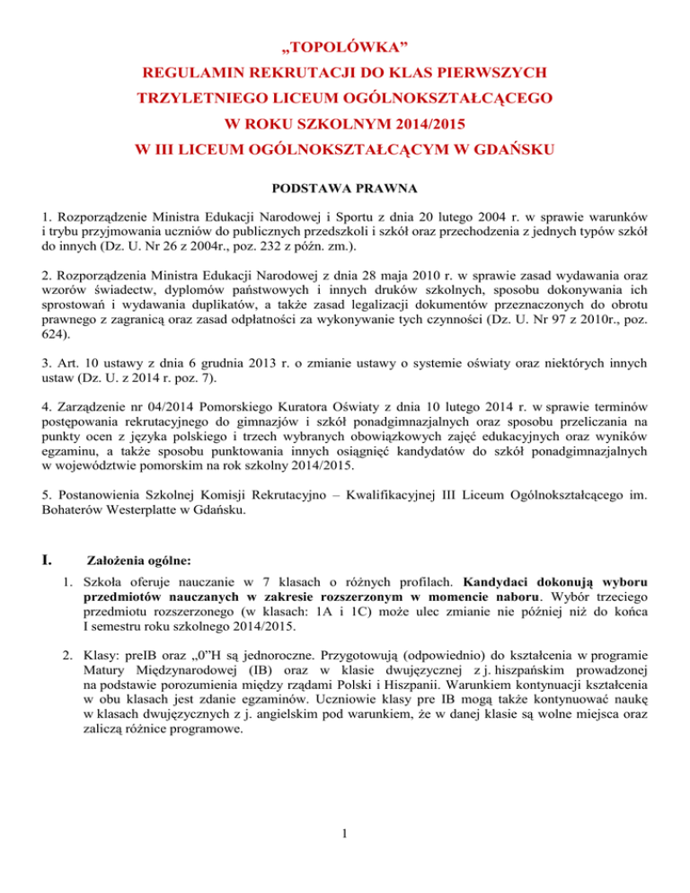„TOPOLÓWKA” REGULAMIN REKRUTACJI DO KLAS PIERWSZYCH TRZYLETNIEGO LICEUM OGÓLNOKSZTAŁCĄCEGO W ROKU SZKOLNYM 2014/2015 W III LICEUM OGÓLNOKSZTAŁCĄCYM W GDAŃSKU PODSTAWA PRAWNA 1. Rozporządzenie Ministra Edukacji Narodowej i Sportu z dnia 20 lutego 2004 r. w sprawie warunków i trybu przyjmowania uczniów do publicznych przedszkoli i szkół oraz przechodzenia z jednych typów szkół do innych (Dz. U. Nr 26 z 2004r., poz. 232 z późn. zm.). 2. Rozporządzenia Ministra Edukacji Narodowej z dnia 28 maja 2010 r. w sprawie zasad wydawania oraz wzorów świadectw, dyplomów państwowych i innych druków szkolnych, sposobu dokonywania ich sprostowań i wydawania duplikatów, a także zasad legalizacji dokumentów przeznaczonych do obrotu prawnego z zagranicą oraz zasad odpłatności za wykonywanie tych czynności (Dz. U. Nr 97 z 2010r., poz. 624). 3. Art. 10 ustawy z dnia 6 grudnia 2013 r. o zmianie ustawy o systemie oświaty oraz niektórych innych ustaw (Dz. U. z 2014 r. poz. 7). 4. Zarządzenie nr 04/2014 Pomorskiego Kuratora Oświaty z dnia 10 lutego 2014 r. w sprawie terminów postępowania rekrutacyjnego do gimnazjów i szkół ponadgimnazjalnych oraz sposobu przeliczania na punkty ocen z języka polskiego i trzech wybranych obowiązkowych zajęć edukacyjnych oraz wyników egzaminu, a także sposobu punktowania innych osiągnięć kandydatów do szkół ponadgimnazjalnych w województwie pomorskim na rok szkolny 2014/2015. 5. Postanowienia Szkolnej Komisji Rekrutacyjno – Kwalifikacyjnej III Liceum Ogólnokształcącego im. Bohaterów Westerplatte w Gdańsku. I. Założenia ogólne: 1. Szkoła oferuje nauczanie w 7 klasach o różnych profilach. Kandydaci dokonują wyboru przedmiotów nauczanych w zakresie rozszerzonym w momencie naboru. Wybór trzeciego przedmiotu rozszerzonego (w klasach: 1A i 1C) może ulec zmianie nie później niż do końca I semestru roku szkolnego 2014/2015. 2. Klasy: preIB oraz „0”H są jednoroczne. Przygotowują (odpowiednio) do kształcenia w programie Matury Międzynarodowej (IB) oraz w klasie dwujęzycznej z j. hiszpańskim prowadzonej na podstawie porozumienia między rządami Polski i Hiszpanii. Warunkiem kontynuacji kształcenia w obu klasach jest zdanie egzaminów. Uczniowie klasy pre IB mogą także kontynuować naukę w klasach dwujęzycznych z j. angielskim pod warunkiem, że w danej klasie są wolne miejsca oraz zaliczą różnice programowe. 1 W roku szkolnym 2014/2015 otwieramy następujące klasy: II. KLASA „A” – DWUJĘZYCZNA Z J. ANGIELSKIM Przedmioty z rozszerzonym programem nauczania: • • • • MATEMATYKA (18h w cyklu trzyletnim) GEOGRAFIA (10h w cyklu trzyletnim) Przedmioty rozszerzone do wyboru: WOS lub HISTORIA lub BIOLOGIA Nauczane języki: angielski (18h w cyklu trzyletnim) i hiszpański (6h w cyklu trzyletnim) • Przedmioty nauczane dwujęzycznie: matematyka, geografia. KLASA „B” – DWUJĘZYCZNA Z JĘZYKIEM ANGIELSKIM Z PRZEDMIOTAMI EKSPERYMENTALNYMI Przedmioty z rozszerzonym programem nauczania: • BIOLOGIA (13h w cyklu trzyletnim) • CHEMIA (12h w cyklu trzyletnim) • Nauczane języki: angielski (18h w cyklu trzyletnim) i niemiecki (6h w cyklu trzyletnim). • Dodatkowe godziny z matematyki (13h w cyklu trzyletnim). • Przedmioty nauczane dwujęzycznie: biologia, chemia. KLASA „C” – HUMANISTYCZNO - PRAWNICZA Przedmioty z rozszerzonym programem nauczania: • • • • J. POLSKI (20h w cyklu trzyletnim) HISTORIA (14h w cyklu trzyletnim) Przedmioty rozszerzone do wyboru: WOS lub GEOGRAFIA lub BIOLOGIA Nauczane języki: angielski (9h w cyklu trzyletnim) i francuski (6h w cyklu trzyletnim) KLASA „D” – MATEMATYCZNO - FIZYCZNA Przedmioty z rozszerzonym programem nauczania: • MATEMATYKA (21h w cyklu trzyletnim) • FIZYKA (11h w cyklu trzyletnim) • Nauczane języki: angielski (11h w cyklu trzyletnim) i niemiecki lub hiszpański (6h w cyklu trzyletnim) • przedmiot uzupełniający: zaawansowana grafika i multimedia (grafika 2D i 3D; obróbka multimediów; projektowanie zaawansowanych stron www) 2 KLASA „IH” – DWUJĘZYCZNA Z JĘZYKIEM HISZPAŃSKIM Przygotowująca do matury polskiej i hiszpańskiej (kontynuacja po klasie wstępnej „0H”). • Możliwość przyjęcia kandydatów pod następującymi warunkami: • a) zdanie egzaminu z języka hiszpańskiego • b) wolne miejsca przedmioty z rozszerzonym programem nauczania: • • • • • • • GEOGRAFIA (9h w cyklu trzyletnim) J. ANGIELSKI (15h w cyklu trzyletnim) Obowiązkowe przedmioty dodatkowe: LITERATURA HISZPAŃSKA HISTORIA Z ELEMENTAMI HISTORII SZTUKI KRÓLESTWA HISZPANII GEOGRAFIA KRÓLESTWA HISZPANII nauczane języki: hiszpański (19h w cyklu trzyletnim) i angielski (15h w cyklu trzyletnim) KLASA „0H” – WSTĘPNA Z JĘZYKIEM HISZPAŃSKIM • • • • Przygotowująca do klasy dwujęzycznej z językiem hiszpańskim. Zajęcia z nauczycielem z Hiszpanii. Dodatkowe opłaty. Nauczane języki: j. hiszpański (20h w tygodniu) KLASA „preIB” - DWUJĘZYCZNA Z J. ANGIELSKIM • Tylko dla uczniów, którzy od II klasy chcą uczestniczyć w programie dyplomowym matury międzynarodowej. Dodatkowe opłaty. • Przedmioty nauczane dwujęzycznie: • MATEMATYKA • BIOLOGIA • FIZYKA • GEOGRAFIA • HISTORIA • CHEMIA • dodatkowe przedmioty: METODOLOGIA BADAŃ NAUKOWYCH (nauczana w języku angielskim) i CAS (Creativity Action Service) • Nauczane języki: angielski (6h w tygodniu) i niemiecki (2h w tygodniu) 3 UWAGI DODATKOWE W roku szkolnym 2014/2015 nie będzie przeprowadzany sprawdzian uzdolnień kierunkowych z języka angielskiego do klas IA, IB i I preIB. język angielski jest obowiązkowy jako pierwszy język obcy w klasach I A, I B ,I C, I D, I preIB ( nauczany w III LO od poziomu B1), w klasie wstępnej 0H i klasie IH pierwszym językiem obcym jest język hiszpański kandydaci do klasy wstępnej 0H są przyjmowani na ogólnych zasadach rekrutacji elektronicznej. nabór uczniów do klasy IH przeprowadzany 