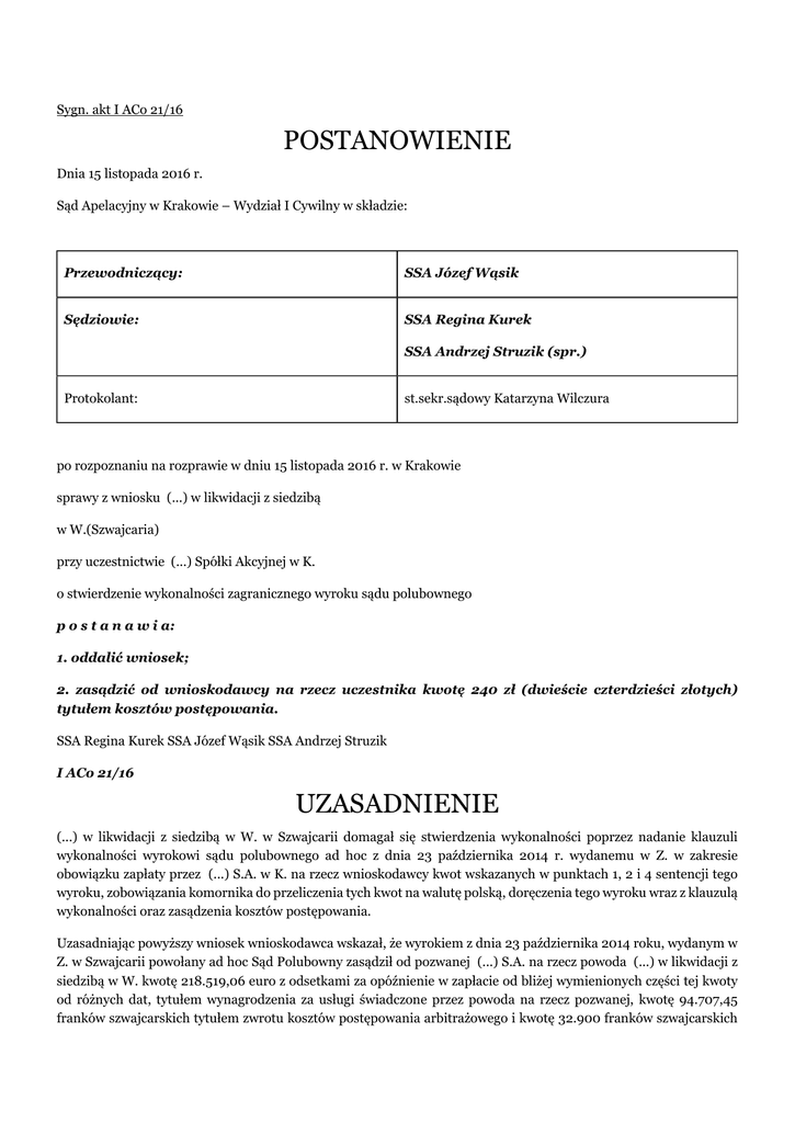 Sygn. akt I ACo 21/16 POSTANOWIENIE Dnia 15 listopada 2016 r. Sąd Apelacyjny w Krakowie – Wydział I Cywilny w składzie: Przewodniczący: SSA Józef Wąsik Sędziowie: SSA Regina Kurek SSA Andrzej Struzik (spr.) Protokolant: st.sekr.sądowy Katarzyna Wilczura po rozpoznaniu na rozprawie w dniu 15 listopada 2016 r. w Krakowie sprawy z wniosku (...) w likwidacji z siedzibą w W.(Szwajcaria) przy uczestnictwie (...) Spółki Akcyjnej w K. o stwierdzenie wykonalności zagranicznego wyroku sądu polubownego p o s t a n a w i a: 1. oddalić wniosek; 2. zasądzić od wnioskodawcy na rzecz uczestnika kwotę 240 zł (dwieście czterdzieści złotych) tytułem kosztów postępowania. SSA Regina Kurek SSA Józef Wąsik SSA Andrzej Struzik I ACo 21/16 UZASADNIENIE (...) w likwidacji z siedzibą w W. w Szwajcarii domagał się stwierdzenia wykonalności poprzez nadanie klauzuli wykonalności wyrokowi sądu polubownego ad hoc z dnia 23 października 2014 r. wydanemu w Z. w zakresie obowiązku zapłaty przez (...) S.A. w K. na rzecz wnioskodawcy kwot wskazanych w punktach 1, 2 i 4 sentencji tego wyroku, zobowiązania komornika do przeliczenia tych kwot na walutę polską, doręczenia tego wyroku wraz z klauzulą wykonalności oraz zasądzenia kosztów postępowania. Uzasadniając powyższy wniosek wnioskodawca wskazał, że wyrokiem z dnia 23 października 2014 roku, wydanym w Z. w Szwajcarii powołany ad hoc Sąd Polubowny zasądził od pozwanej (...) S.A. na rzecz powoda (...) w likwidacji z siedzibą w W. kwotę 218.519,06 euro z odsetkami za opóźnienie w zapłacie od bliżej wymienionych części tej kwoty od różnych dat, tytułem wynagrodzenia za usługi świadczone przez powoda na rzecz pozwanej, kwotę 94.707,45 franków szwajcarskich tytułem zwrotu kosztów postępowania arbitrażowego i kwotę 32.900 franków szwajcarskich tytułem odszkodowania. Rozstrzygnięty spór dotyczył umowy zawartej przez strony w dniu 30 listopada 2003 roku dotyczącej świadczenia przez wnioskodawcę (...) na rzecz uczestniczki (...) S.A. usług pośrednictwa przy transferach piłkarzy oraz rozliczenia wcześniejszych wzajemnych należności, a uczestniczka dotychczas nie uiściła żadnych kwot zasądzonych tym wyrokiem. Do wniosku został dołączony odpis wyroku Sądu Polubownego z dnia 23 października 2014 r. poświadczony przez szwajcarskiego notariusza z zgodność z oryginałem i opatrzona apostille oraz kserokopia umowy z dnia 30 listopada 2003 r. Na wezwanie sądu, wystosowane do wnioskodawcy po wyznaczeniu rozprawy i doręczeniu odpisu wniosku uczestniczce, wnioskodawca ostatecznie przedstawił oryginał wyroku Sądu Polubownego, nie przedstawił natomiast oryginału ani uwierzytelnionego odpisu umowy prezentując stanowisko, że nie jest to konieczne, gdyż fakt istnienia zapisu na sąd polubowny może wykazywać także innymi środkami dowodowymi. Wnioskodawca podnosił, że pierwotnie wyznaczony w umowie do rozstrzygania sporów sąd polubowny przy (...) (Izba do Spraw Rozwiązywania Sporów) uznał się za niewłaściwy, co spowodowało powołanie, zgodnie z prawem szwajcarskim, sądu polubownego ad hoc, ten zaś postanowieniem z dnia 14 listopada 2011 r. orzekł o swej właściwości do rozpoznania sporu, natomiast uczestnik nie skorzystał z możliwości zaskarżenia tego postanowienia do sądu państwowego, tracąc przez to możliwość kwestionowania właściwości sądu polubownego w niniejszym postępowaniu. Uczestniczka wnosiła o oddalenie wniosku i zasądzenie kosztów postępowania, zarzucając w pierwszej kolejności, że wnioskodawca nie przedłożył oryginału ani urzędowo poświadczonego odpisu zapisu na sąd polubowny, co stanowi brak merytoryczny skutkujący oddaleniem wniosku. Uczestniczka przeczyła też istnieniu zapisu na sąd polubowny twierdząc, że organy działające przy (...), które były wskazane w zapisie powoływanym przez wnioskodawcę, nie mają statusu sądów polubownych, a nawet gdyby taki ich status uznać, to nieprzyjęcie przez te organy sporu do rozpoznania spowodowało utratę mocy zapisu na sąd polubowny. Z ostrożności procesowej uczestniczka podniosła też zarzut spełnienia świadczenia w całości. Sąd Apelacyjny zważył, co następuje: W rozpoznawanej sprawie zastosowanie znajdują postanowienia Konwencji o uznawaniu i wykonywaniu zagranicznych orzeczeń arbitrażowych sporządzonej w N. dnia 10 czerwca 1958 roku (określanej dalej jako Konwencja nowojorska), jako że orzeczenia arbitrażowe, których uznania i stwierdzenia wykonalności domaga się wnioskodawczyni, zostały wydane na obszarze Szwajcarii. W konsekwencji art. I ust. 1 Konwencji nowojorskiej przesądza jej stosowanie i powoduje, że jej postanowienia wyprzedzają przepisy kodeksu postępowania cywilnego. Art. II Konwencji nowojorskiej stawia wymóg poddania sporu arbitrażowi w umowie pisemnej, a zgodnie z art. IV tej Konwencji przedłożenie oryginału lub należycie uwierzytelnionego odpisu takiej umowy stanowi konieczny warunek uzyskania uznania lub wykonalności orzeczenia arbitrażowego. Za utrwalone w orzecznictwie sądów polskich można uznać stanowisko, że przedłożenie przez stronę ubiegającą się o uznanie lub stwierdzenie wykonalności wyroku zagranicznego sądu arbitrażowego pisemnej umowy obejmującej zapis na sąd polubowny stanowi wymaganie formalne wniosku, a jej nieprzedłożenie powoduje zastosowanie przepisu art. 130 § 1 k.p.c. (tak m.in. Sąd Najwyższy w postanowieniu z dnia 3 listopada 2004 r. III CK 510/03, w postanowieniu z 23 stycznia 2013 r. I CSK 186/13, w postanowieniu z dnia 25 maja 2016 r. V CSK 257/15). Niemniej jednak w sytuacji, gdy wnioskowi przed wezwaniem o uzupełnienie tego braku nadano bieg (doręczono odpis wniosku uczestnikowi i wyznaczono rozprawę), zastosowanie art. 130 § 2 k.p.c. nie jest możliwe. Stąd sąd rozpoznał wniosek merytorycznie. Przedłożenie oryginału lub należycie uwierzytelnionego odpisu zapisu na za