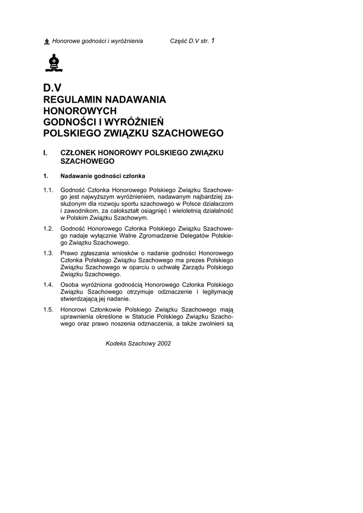 l Honorowe godności i wyróżnienia Część D.V str. 1 l D.V REGULAMIN NADAWANIA HONOROWYCH GODNOŚCI I WYRÓŻNIEŃ POLSKIEGO ZWIĄZKU SZACHOWEGO I. CZŁONEK HONOROWY POLSKIEGO ZWIĄZKU SZACHOWEGO 1. Nadawanie godności członka 1.1. Godność Członka Honorowego Polskiego Związku Szachowego jest najwyższym wyróżnieniem, nadawanym najbardziej zasłużonym dla rozwoju sportu szachowego w Polsce działaczom i zawodnikom, za całokształt osiągnięć i wieloletnią działalność w Polskim Związku Szachowym. 1.2. Godność Honorowego Członka Polskiego Związku Szachowego nadaje wyłącznie Walne Zgromadzenie Delegatów Polskiego Związku Szachowego. 1.3. Prawo zgłaszania wniosków o nadanie godności Honorowego Członka Polskiego Związku Szachowego ma prezes Polskiego Związku Szachowego w oparciu o uchwałę Zarządu Polskiego Związku Szachowego. 1.4. Osoba wyróżniona godnością Honorowego Członka Polskiego Związku Szachowego otrzymuje odznaczenie i legitymację stwierdzającą jej nadanie. 1.5. Honorowi Członkowie Polskiego Związku Szachowego mają uprawnienia określone w Statucie Polskiego Związku Szachowego oraz prawo noszenia odznaczenia, a także zwolnieni są Kodeks Szachowy 2002 Część D.V str. 2 l Honorowe godności i wyróżnienia od opłat licencyjnych, startowego i mają wolny wstęp na wszystkie imprezy szachowe w kraju. 1.6. Rejestr nadanych odznaczeń prowadzi Polski Związek Szachowy (Komisja Odznaczeń). II. HONOROWA ODZNAKA POLSKIEGO ZWIĄZKU SZACHOWEGO 1. Nadawanie honorowych odznak 1.1. Honorowa Odznaka Polskiego Związku Szachowego jest zaszczytnym wyróżnieniem, nadawanym zawodnikom, sędziom, działaczom sportowym i społecznym, a także osobom fizycznym i prawnym szczególnie zasłużonym dla rozwoju, umasowienia i podniesienia poziomu sportu szachowego (gra bezpośrednia, korespondencyjna i kompozycja szachowa) w Polsce lub spełniającym wymagania podane w punktach 2, 3 i 4 Regulaminu. Odznaka może być również nadana osobom fizycznym i prawnym, działającym poza granicami kraju. 1.2. Honorowa Odznaka Polskiego Związku Szachowego ma trzy stopnie: złoty, srebrny i brązowy. Osoba wyróżniona honorową odznaką otrzymuje legitymację stwierdzającą przyznanie i prawo jej noszenia. 1.3. Odznaki złote i srebrne są przyznawane przez Zarząd Polskiego Związku Szachowego, a brązowe przez Zarządy Wojewódzkich Związków Szachowych. Odznaki przyznawane są z okazji ważnych uroczystości czy imprez szachowych. 1.4. Honorowe odznaki PZszach mogą być przyznawane działaczowi lub zawodnikowi w odstępie trzech lat. 1.5. Prawo zgłaszania wniosków o nadanie honorowej odznaki mają członkowie Zarządu Polskiego Związku Szachowego oraz Zarządy Wojewódzkich Związków Szachowych. 1.6. Osobom lub stowarzyszeniom ukaranym dyscyplinarnie lub sądowo, odznaka honorowa może być nadana nie wcześniej, niż po upływie pięciu lat od dnia zakończenia kary. Kodeks Szachowy 2002 l Honorowe godności i wyróżnienia 1.7. Część D.V str. 3 Rejestr nadanych odznak złotych i srebrnych prowadzi Polski Związek Szachowy (Komisja Odznaczeń), a brązowych wojewódzkie związki szachowe. 2. Złota odznaka honorowa Złota Odznaka Honorowa Polskiego Związku Szachowego może być nadana: (a) działaczom szachowym, którzy mają: wyróżnienia przyznane przez centralne władze sportu w Polsce, za działalność w sporcie szachowym, mandat prezesa Polskiego Związku Szachowego, przynajmniej czteroletni staż działalności w Zarządzie Polskiego Związku Szachowego, przynajmniej siedmioletni staż działalności w Zarządach Wojewódzkich Związków Szachowych, (b) sędziom szachowym, którzy mają: tytuł sędziego klasy FIDE lub klasy międzynarodowej FIDE lub klasy międzynarodowej ICCF, tytuł sędziego klasy państwowej i przynajmniej siedmioletni staż sędziowski, (c) trenerom szachowym mającym: - dyplom trenera klasy mistrzowskiej, - dyplom trenera pierwszej klasy i przynajmniej siedmioletni staż pracy w zawodzie, (d) szachistom, którzy: zdobyli tytuł mistrza Polski kobiet lub mężczyzn, zdobyli z reprezentacją Polski medal na Olimpiadzie Szachowej lub drużynowych mistrzostwach Europy, zdobyli medal w indywidualnych mistrzostwach świata lub Europy, mają tytuł arcymistrza lub mistrza międzynarodowego, mają klasę sportową mistrzowską międzynarodową, (e) klubom sportowym, których sekcje szachowe zdobyły tytuł drużynowego mistrza Polski, Kodeks Szachowy 2002 Część D.V str. 4 (f) l Honorowe godności i wyróżnienia innym osobom i instytucjom szczególnie zasłużonym dla sportu szachowego na wniosek Zarządu Polskiego Związku Szachowego. 3. Srebrna odznaka honorowa Srebrna odznaka honorowa Polskiego Związku Szachowego może być nadana: (a) działaczom szachowym, którzy mają: przynajmniej dwuletni staż działalności we władzach Polskiego Związku Szachowego, mandat prezesa Wojewódzkiego Związku Szachowego, przynajmniej pięcioletni staż działalności we władzach sekcji szachowych klubów i kół sportowych, (b) sędziom szachowym, którzy mają: – tytuł sędziego klasy państwowej, – tytuł sędziego klasy pierwszej i przynajmniej pięcioletni staż sędziowski, (c) trenerom i instruktorom szachowym, którzy mają: – dyplom trenera pierwszej klasy, – dyplom trenera drugiej klasy oraz przynajmniej czteroletni staż pracy w zawodzie, – książeczkę instruktora i przynajmniej 6-letni staż pracy w zawodzie, (d) szachistom, którzy: – mają tytuł mistrza Polski juniorek lub juniorów od 16 lat, – zdobyli medal w mistrzostwach Polski do 20 lat, – brali udział w finale mistrzostw Polski kobiet i mężczyzn, (e) klubom sportowym, których sekcje szachowe zdobyły w drużynowych mistrzostwach Polski (I lidze szachowej) miejsca 1-10, (f) innym osobom i instytucjom szczególnie zasłużonym dla sportu szachowego (na wniosek Zarządu Wojewódzkiego Związku Szachowego). Kodeks Szachowy 2002 l Honorowe 