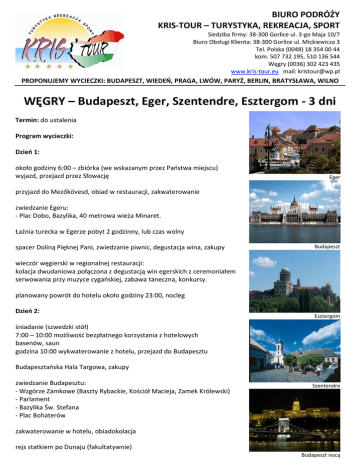 BIURO PODRÓŻY KRIS-TOUR – TURYSTYKA, REKREACJA, SPORT Siedziba firmy: 38-300 Gorlice ul. 3-go Maja 10/7 Biuro Obsługi Klienta: 38-300 Gorlice ul. Mickiewicza 3 Tel. Polska (0048) 18 354 00 44 kom. 507 732 195, 510 136 544 Węgry (0036) 302 423 435 www.kris-tour.eu mail: [email protected] PROPONUJEMY WYCIECZKI: BUDAPESZT, WIEDEŃ, PRAGA, LWÓW, PARYŻ, BERLIN, BRATYSŁAWA, WILNO WĘGRY – Budapeszt, Eger, Szentendre, Esztergom - 3 dni Termin: do ustalenia Program wycieczki: Dzień 1: około godziny 6:00 – zbiórka (we wskazanym przez Państwa miejscu) wyjazd, przejazd przez Słowację Eger przyjazd do Mezőkövesd, obiad w restauracji, zakwaterowanie zwiedzanie Egeru: - Plac Dobo, Bazylika, 40 metrowa wieża Minaret. Łaźnia turecka w Egerze pobyt 2 godzinny, lub czas wolny spacer Doliną Pięknej Pani, zwiedzanie piwnic, degustacja wina, zakupy Budapeszt wieczór węgierski w regionalnej restauracji: kolacja dwudaniowa połączona z degustacją win egerskich z ceremoniałem serwowania przy muzyce cygańskiej, zabawa taneczna, konkursy. planowany powrót do hotelu około godziny 23:00, nocleg Dzień 2: Esztergom śniadanie (szwedzki stół) 7:00 – 10:00 możliwość bezpłatnego korzystania z hotelowych basenów, saun godzina 10:00 wykwaterowanie z hotelu, przejazd do Budapesztu Budapesztańska Hala Targowa, zakupy zwiedzanie Budapesztu: - Wzgórze Zamkowe (Baszty Rybackie, Kościół Macieja, Zamek Królewski) - Parlament - Bazylika Św. Stefana - Plac Bohaterów Szentendre zakwaterowanie w hotelu, obiadokolacja rejs statkiem po Dunaju (fakultatywnie) Budapeszt nocą Budapesztu nocą ze Wzgórza Gellerta powrót do hotelu, nocleg dla osób chętnych możliwość zorganizowania kąpieli nocnych w łaźniach tureckich (fakultatywnie) Dzień 3: Hotel Mezőkövesd śniadanie (szwedzki stół) wykwaterowanie z hotelu zwiedzanie Zakola Dunaju. przejazd do Esztergomu - kolebki katolicyzmu na Węgrzech i siedziby najwyższych władz kościoła węgierskiego, zwiedzanie Bazyliki - największej świątyni katolickiej na Węgrzech. następnie przejazd do Szentendre - obiad przy kieliszku wina, spacer po Starówce Hotel Mezőkövesd około godziny 23:00 – planowany powrót do Polski Cena za osobę - 515 złotych (kalkulacja dla grupy 40-48 osób) Świadczenia zawarte w cenie: • • • • • • • • • 1 nocleg w Mezőkövesd (Hotel Balneo****, pokoje 2 osobowe) 1 nocleg w Budapeszcie (hotel***, pokoje 2 osobowe) 2 śniadania szwedzki stół (dzień 2,3) obiad w Mezőkövesd (dzień 1) wieczór węgierski (dzień 1) obiadokolacja w Budapeszcie (dzień 2) obiad w Szentendre (dzień 3) opieka pilota oraz przewodnika ubezpieczenie turystyczne (NNW 2500 Euro, KL 10000 Euro) Hotel Mezőkövesd (basen termalny) Hotel Budapeszt Świadczenia dodatkowo płatne: • • rejs statkiem po Dunaju (dzień 2) 20 złotych/osoba transport autokarem, opłaty parkingów, autostrad Orientacyjny koszt zorganizowania transportu dla grupy 40 osobowej: Rzeszów 115 złotych/osoba Kraków 120 złotych/osoba Katowice 150 złotych/osoba Kielce 145 złotych/osoba Jasło 105 złotych/osoba Nowy Sącz 105 złotych/osoba Gorlice 100 złotych/osoba Wyżej wymieniony program może ulec zmianie po uwzględnieniu Państwa sugestii. Hotel Budapeszt Hala Targowa w Budapeszcie