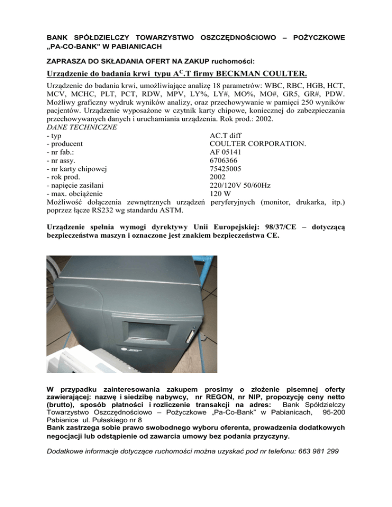 BANK SPÓŁDZIELCZY TOWARZYSTWO OSZCZĘDNOŚCIOWO – POŻYCZKOWE „PA-CO-BANK” W PABIANICACH ZAPRASZA DO SKŁADANIA OFERT NA ZAKUP ruchomości: Urządzenie do badania krwi typu AC.T firmy BECKMAN COULTER. Urządzenie do badania krwi, umożliwiające analizę 18 parametrów: WBC, RBC, HGB, HCT, MCV, MCHC, PLT, PCT, RDW, MPV, LY%, LY#, MO%, MO#, GR5, GR#, PDW. Możliwy graficzny wydruk wyników analizy, oraz przechowywanie w pamięci 250 wyników pacjentów. Urządzenie wyposażone w czytnik karty chipowe, koniecznej do zabezpieczania przechowywanych danych i uruchamiania urządzenia. Rok prod.: 2002. DANE TECHNICZNE - typ AC.T diff - producent COULTER CORPORATION. - nr fab.: AF 05141 - nr assy. 6706366 - nr karty chipowej 75425005 - rok prod. 2002 - napięcie zasilani 220/120V 50/60Hz - max. obciążenie 120 W Możliwość dołączenia zewnętrznych urządzeń peryferyjnych (monitor, drukarka, itp.) poprzez łącze RS232 wg standardu ASTM. Urządzenie spełnia wymogi dyrektywy Unii Europejskiej: 98/37/CE – dotyczącą bezpieczeństwa maszyn i oznaczone jest znakiem bezpieczeństwa CE. W przypadku zainteresowania zakupem prosimy o złożenie pisemnej oferty zawierającej: nazwę i siedzibę nabywcy, nr REGON, nr NIP, propozycję ceny netto (brutto), sposób płatności i rozliczenie transakcji na adres: Bank Spółdzielczy Towarzystwo Oszczędnościowo – Pożyczkowe „Pa-Co-Bank” w Pabianicach, 95-200 Pabianice ul. Pułaskiego nr 8 Bank zastrzega sobie prawo swobodnego wyboru oferenta, prowadzenia dodatkowych negocjacji lub odstąpienie od zawarcia umowy bez podania przyczyny. Dodatkowe informacje dotyczące ruchomości można uzyskać pod nr telefonu: 663 981 299