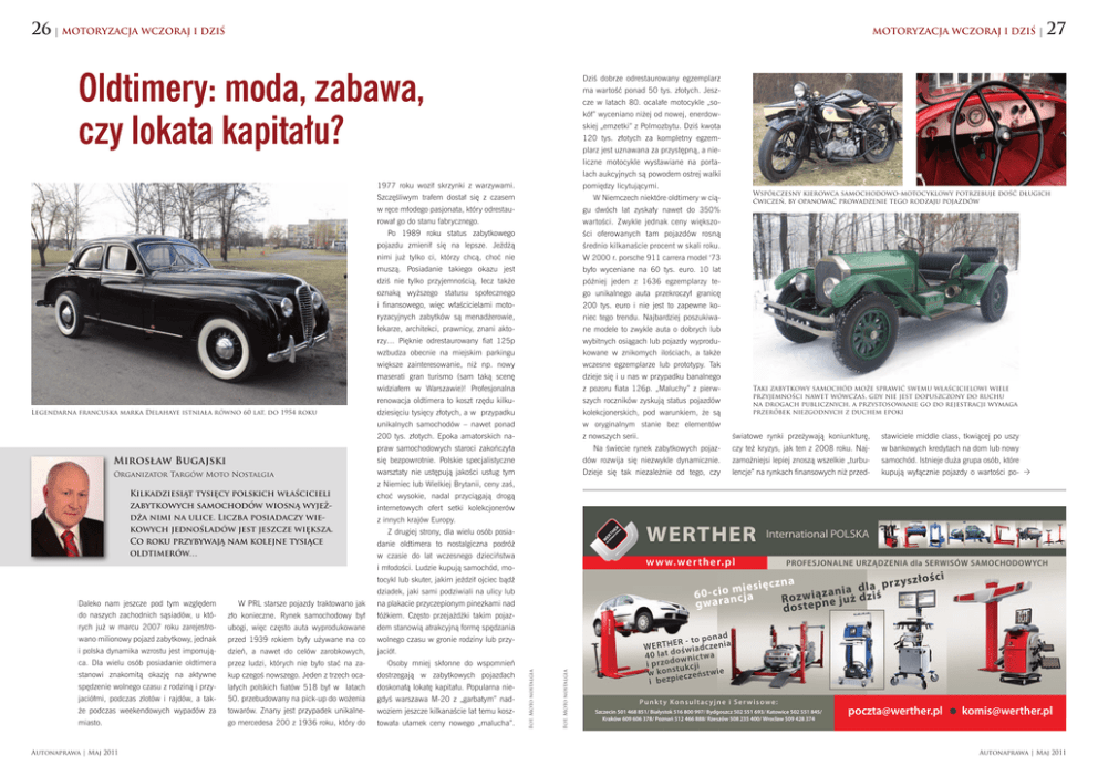 26 | MOTORYZACJA WCZORAJ I DZIŚ MOTORYZACJA WCZORAJ I DZIŚ | Oldtimery: moda, zabawa, czy lokata kapitału? 27 Dziś dobrze odrestaurowany egzemplarz ma wartość ponad 50 tys. złotych. Jeszcze w latach 80. ocalałe motocykle „sokół” wyceniano niżej od nowej, enerdowskiej „emzetki” z Polmozbytu. Dziś kwota 120 tys. złotych za kompletny egzemplarz jest uznawana za przystępną, a nieliczne motocykle wystawiane na portalach aukcyjnych są powodem ostrej walki 1977 roku woził skrzynki z warzywami. Legendarna francuska marka Delahaye istniała równo 60 lat, do 1954 roku Mirosław Bugajski Organizator Targów Moto Nostalgia Kilkadziesiąt tysięcy polskich właścicieli zabytkowych samochodów wiosną wyjeżdża nimi na ulice. Liczba posiadaczy wiekowych jednośladów jest jeszcze większa. Co roku przybywają nam kolejne tysiące oldtimerów… pomiędzy licytującymi. Szczęśliwym trafem dostał się z czasem W Niemczech niektóre oldtimery w cią- w ręce młodego pasjonata, który odrestau- gu dwóch lat zyskały nawet do 350% rował go do stanu fabrycznego. wartości. Zwykle jednak ceny większo- Po 1989 roku status zabytkowego ści oferowanych tam pojazdów rosną pojazdu zmienił się na lepsze. Jeżdżą średnio kilkanaście procent w skali roku. nimi już tylko ci, którzy chcą, choć nie W 2000 r. porsche 911 carrera model ‘73 muszą. Posiadanie takiego okazu jest było wyceniane na 60 tys. euro. 10 lat dziś nie tylko przyjemnością, lecz także później jeden z 1636 egzemplarzy te oznaką wyższego statusu społecznego go unikalnego auta przekroczył granicę i finansowego, więc właścicielami moto- 200 tys. euro i nie jest to zapewne ko- ryzacyjnych zabytków są menadżerowie, niec tego trendu. Najbardziej poszukiwa- lekarze, architekci, prawnicy, znani akto- ne modele to zwykle auta o dobrych lub rzy… Pięknie odrestaurowany fiat 125p wybitnych osiągach lub pojazdy wyprodu- wzbudza obecnie na miejskim parkingu kowane w znikomych ilościach, a także większe zainteresowanie, niż np. nowy wczesne egzemplarze lub prototypy. Tak maserati gran turismo (sam taką scenę dzieje się i u nas w przypadku banalnego widziałem w Warszawie)! Profesjonalna z pozoru fiata 126p. „Maluchy” z pierw- renowacja oldtimera to koszt rzędu kilku- szych roczników zyskują status pojazdów dziesięciu tysięcy złotych, a w przypadku kolekcjonerskich, pod warunkiem, że są unikalnych samochodów – nawet ponad w oryginalnym stanie bez elementów 200 tys. złotych. Epoka amatorskich na- z nowszych serii. Taki zabytkowy samochód może sprawić swemu właścicielowi wiele przyjemności nawet wówczas, gdy nie jest dopuszczony do ruchu na drogach publicznych, a przystosowanie go do rejestracji wymaga przeróbek niezgodnych z duchem epoki światowe rynki przeżywają koniunkturę, stawiciele middle class, tkwiącej po uszy praw samochodowych staroci zakończyła Na świecie rynek zabytkowych pojaz- czy też kryzys, jak ten z 2008 roku. Naj- w bankowych kredytach na dom lub nowy się bezpowrotnie. Polskie specjalistyczne dów rozwija się niezwykle dynamicznie. zamożniejsi lepiej znoszą wszelkie „turbu- samochód. Istnieje duża grupa osób, które warsztaty nie ustępują jakości usług tym Dzieje się tak niezależnie od tego, czy lencje” na rynkach finansowych niż przed- kupują wyłącznie pojazdy o wartości po- z Niemiec lub Wielkiej Brytanii, ceny zaś, choć wysokie, nadal przyciągają drogą internetowych ofert setki kolekcjonerów z innych krajów Europy. WERTHER Z drugiej strony, dla wielu osób posiadanie oldtimera to nostalgiczna podróż w czasie do lat wczesnego dzieciństwa zło konieczne. Rynek samochodowy był łóżkiem. Często przejażdżki takim pojaz- rych już w marcu 2007 roku zarejestro- ubogi, więc często auta wyprodukowane dem stanowią atrakcyjną formę spędzania wano milionowy pojazd zabytkowy, jednak przed 1939 rokiem były używane na co wolnego czasu w gronie rodziny lub przy- i polska dynamika wzrostu jest imponują- dzień, a nawet do celów zarobkowych, jaciół. ca. Dla wielu osób posiadanie oldtimera przez ludzi, których nie było stać na za- Osoby mniej skłonne do wspomnień stanowi znakomitą okazję na aktywne kup czegoś nowszego. Jeden z trzech oca- dostrzegają w zabytkowych pojazdach spędzenie wolnego czasu z rodziną i przy- lałych polskich fiatów 518 był w latach doskonałą lokatę kapitału. Popularna nie- jaciółmi, podczas zlotów i rajdów, a tak- 50. przebudowany na pick-up do wożenia gdyś warszawa M-20 z „garbatym” nad- że podczas weekendowych wypadów za towarów. Znany jest przypadek unikalne- woziem jeszcze kilkanaście lat temu kosz- miasto. go mercedesa 200 z 1936 roku, który do towała ułamek ceny nowego „malucha”. Fot. Moto nostalgia na plakacie przyczepionym pinezkami nad do naszych zachodnich sąsiadów, u któ- Fot. Moto nostalgia dziadek, jaki sami podziwiali na ulicy lub W PRL starsze pojazdy traktowano jak PROFESJONALNE URZĄDZENIA dla SERWISÓW SAMOCHODOWYCH ści r z ys z ł o p ęczna i s a l e i d m ą z a n iuaż d z i ś 6 0 - c i oa n c j a R o z w ip ej gwar doste n tocykl lub skuter, jakim jeździł ojciec bądź Daleko nam jeszcze pod tym względem International POLSKA w w w.wer ther.pl i młodości. Ludzie kupują samochód, mo- Autonaprawa | Maj 2011 Współczesny kierowca samochodowo-motocyklowy potrzebuje dość długich ćwiczeń, by opanować prowadzenie tego rodzaju pojazdów onad ER - to p W E R T H o ś w ia d c z e n ia 4 0 la t do w n ic t w a i p r z o d t u k c ji w k o n s c z e ń s t w ie i b e z p ie P u n k t y Ko n s u l t a c y j n e i S e r w i s o w e : Szczecin 501 468 851/ Białystok 516 800 997/ Bydgoszcz 502 551 693/ Katowice 502 551 845/ Kraków 609 606 378/ Poznań 512 466 888/ Rzeszów 508 235 400/ Wrocław 509 428 374 reklama_185X85.indd 1 [email protected] [email protected] 2010-04-22 16:09:21 Autonaprawa | Maj 2011