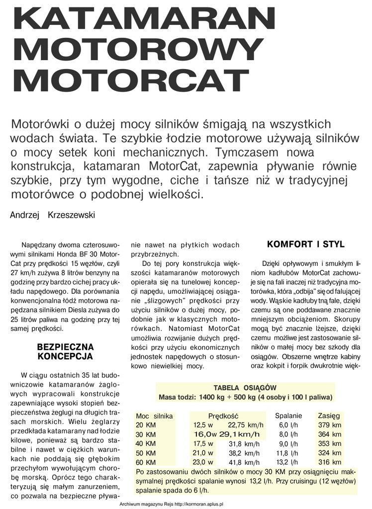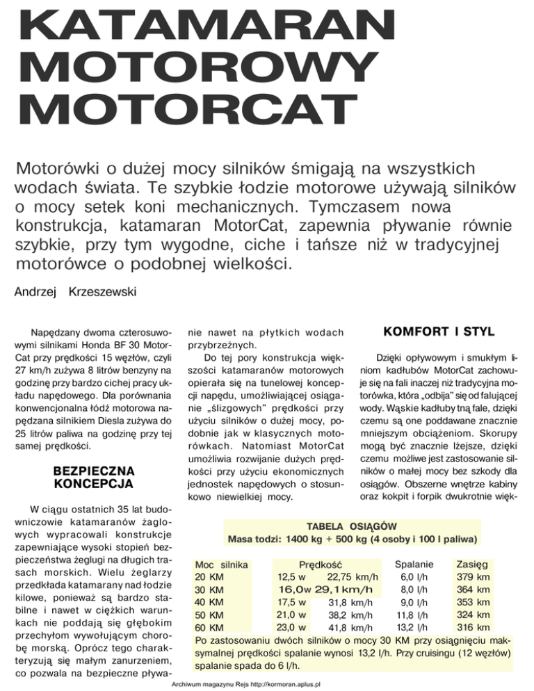 KATAMARAN MOTOROWY MOTORCAT Motorówki o dużej mocy silników śmigają na wszystkich wodach świata. Te szybkie łodzie motorowe używają silników o mocy setek koni mechanicznych. Tymczasem nowa konstrukcja, katamaran MotorCat, zapewnia pływanie równie szybkie, przy tym wygodne, ciche i tańsze niż w tradycyjnej motorówce o podobnej wielkości. Andrzej Krzeszewski Napędzany dwoma czterosuwowymi silnikami Honda BF 30 MotorCat przy prędkości 15 węzłów, czyli 27 km/h zużywa 8 litrów benzyny na godzinę przy bardzo cichej pracy układu napędowego. Dla porównania konwencjonalna łódź motorowa napędzana silnikiem Diesla zużywa do 25 litrów paliwa na godzinę przy tej samej prędkości. BEZPIECZNA KONCEPCJA W ciągu ostatnich 35 lat budowniczowie katamaranów żaglowych wypracowali konstrukcje zapewniające wysoki stopień bezpieczeństwa żeglugi na długich trasach morskich. Wielu żeglarzy przedkłada katamarany nad łodzie kilowe, ponieważ są bardzo stabilne i nawet w ciężkich warunkach nie poddają się głębokim przechyłom wywołującym chorobę morską. Oprócz tego charakteryzują się małym zanurzeniem, co pozwala na bezpieczne pływa- nie nawet na płytkich wodach przybrzeżnych. Do tej pory konstrukcja większości katamaranów motorowych opierała się na tunelowej koncepcji napędu, umożliwiającej osiąganie „ślizgowych" prędkości przy użyciu silników o dużej mocy, podobnie jak w klasycznych motorówkach. Natomiast MotorCat umożliwia rozwijanie dużych prędkości przy użyciu ekonomicznych jednostek napędowych o stosunkowo niewielkiej mocy. KOMFORT l STYL Dzięki opływowym i smukłym liniom kadłubów MotorCat zachowuje się na fali inaczej niż tradycyjna motorówka, która „odbija" się od falującej wody. Wąskie kadłuby tną fale, dzięki czemu są one poddawane znacznie mniejszym obciążeniom. Skorupy mogą być znacznie lżejsze, dzięki czemu możliwe jest zastosowanie silników o małej mocy bez szkody dla osiągów. Obszerne wnętrze kabiny oraz kokpit i forpik dwukrotnie więk- TABELA OSIĄGÓW Masa todzi: 1400 kg + 500 kg (4 osoby i 100 l paliwa) Spalanie Zasięg Moc silnika Prędkość 379 km 20 KM 12,5 w 22,75 km/h 6,0 l/h 364 km 16,0 w 29,1 km/h 8,0 l/h 30 KM 40 KM 17,5 w 353 km 31,8 km/h 9,0 l/h 21,0 w 324 km 50 KM 38,2 km/h 11,8 l/h 23,0 w 13,2 l/h 316 km 60 KM 41,8 km/h Po zastosowaniu dwóch silników o mocy 30 KM przy osiągnięciu maksymalnej prędkości spalanie wynosi 13,2 l/h. Przy cruisingu (12 węzłów) spalanie spada do 6 l/h. Archiwum magazynu Rejs http://kormoran.aplus.pl sze niż w tradycyjnej motorówce stanowią kolejną zaletę tej unikalnej konstrukcji. Przy czym małe - jedynie 30 cm - zanurzenie i trap do schodzenia na ląd umożliwiają zacumowanie przy dowolnym nabrzeżu czy nawet wprost na plaży. Wreszcie, MotorCat jest łatwy i tani w obsłudze. EKONOMIKA SILNIKÓW Nowe technologie silników zaburtowych oferują ich nabywcom trwałość i niezawodność. Konstrukcja Motorcata pozwala na zastosowanie małych, zaburtowych silników, zmniejszając znacznie koszt oprzyrządowania. Zastosowanie dwóch silników, zawieszonych na obu kadłubach, to dodatkowa gwarancja niezawodności i znakomitej zwrotności. MotorCat w ruchu bezwstrząsowo rozcina powierzchnię wody BF30 moc 30 KM obroty 5500-6000 min-1 liczba cylindrów 3 (OHC) pojemność skokowa 499 cm3 przełożenie 2,08:1 biegi P-N-W prąd ładowania 10 A zbiornik paliwa 13 l masa 63 (S) 67 (L) kg wydech przez śrubę śred. x skok śruby 240x240 (S) 235x235 (L) Małe zanurzenie pozwala mu „wjechać" na plażę. Zwraca uwagę oryginalna rampa zejściowa. MOTORCAT ŁÓDŹ CZARTEROWA Koszty eksploatacji motorówek często zaskakują. Nierzadko rachunki za paliwo w czasie weekendu dochodzą do 400-500 PLN. Niewielki koszt eksploatacji MotorCata może sprawić, że stanie się on, zarówno dla firm czarterowych jak i dla ich klientów, atrakcyjną łodzią motorową. Fot. Marek Słodownik MotorCat długość 8,53 m 2,89/5,79 m szerokość masa 730 kg 0,30 m zanurzenie silnik 35-50 KM wysokość w pływaku 1 ,85 m Rys. Marek Strauchold Archiwum magazynu Rejs http://kormoran.aplus.pl