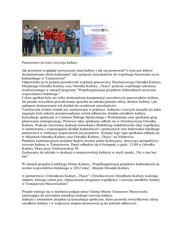 Partnerstwo na rzecz rozwoju kultury Jak powinien wyglądać nowoczesny dom kultury i jak się promować? Czym jest dobrze skonstruowana oferta kulturalna? Jak zachęcać mieszkańców do wspólnego kreowania życia kulturalnego w Tomaszowie? Odpowiedzi na te pytania poszukiwali wspólnie pracownicy Dzielnicowego Ośrodka Kultury, Miejskiego Ośrodka Kultury oraz Ośrodka Kultury „Tkacz” podczas wspólnego szkolenia zrealizowanego w ramach programu ”Współorganizacja projektów kulturalnych na terenie województwa łódzkiego.” Celem spotkań było nie tylko doskonalenie kompetencji zawodowych pracowników kultury, ale przede wszystkim poszukiwanie sposobu na uatrakcyjnienie oferty domów kultury i jak najlepsze dostosowanie ich działań do oczekiwań mieszkańców. Teoretyczna wiedza została już zastosowana w praktyce. Jednymi z nowych narzędzi po jakie sięgnięto były ankiety przeprowadzone wśród odbiorców działań ośrodków kultury, konsultacje społeczne w Centrum Dialogu Społecznego i Wolontariatu oraz spotkania grup planowania strategicznego. Pierwsze takie spotkanie odbyło się w Dzielnicowym Ośrodku Kultury. Podczas ożywionej dyskusji mieszkańcy Białobrzeg zadeklarowali chęć współpracy w animowaniu i wspomaganiu działań kulturalnych i społecznych oraz budowania lokalnego partnerstwa w realizacji rozpoczętych już projektów. Kolejne tego typu spotkania odbędą się w Miejskim Ośrodku Kultury oraz Ośrodku Kultury „Tkacz” na Niebrowie. Punktem kulminacyjnym projektu będzie otwarty panel dyskusyjny, dotyczący perspektywy rozwoju kultury w Tomaszowie. Panel odbędzie się 6 listopada, o godz. 12.00 w Ośrodku Kultury Tkacz przy Nieborowskiej 50. Zachęcamy do udziału w dyskusji o tomaszowskiej kulturze w myśl zasady „Nic o nas bez nas”. W ramach projektu Łódzkiego Domu Kultury „Współorganizacja projektów kulturalnych na terenie województwa łódzkiego w 2012 roku”, Miejski Ośrodek Kultury w partnerstwie z Ośrodkiem Kultury „Tkacz” i Dzielnicowym Ośrodkiem Kultury realizują zadanie, którego celem jest „Opracowanie programu współpracy i rozwoju ośrodków kultury w Tomaszowie Mazowieckim”. Projekt wpisuje się w działania podjęte przez Gminę Miasto Tomaszów Mazowiecki, zmierzające do powstania miejskiej strategii rozwoju kultury. Jednym z elementów projektu są konsultacje społeczne, które pozwolą zweryfikować ofertę ośrodków kultury i w większym stopniu dostosować ją do potrzeb odbiorców. Opinie można wyrazić poprzez wzięcie udziału w ankiecie, która dostępna jest w siedzibach tomaszowskich ośrodków i w Centrum Dialogu Społecznego i Wolontariatu a także poprzez wypełnienie ankiety online na stronach internetowych placówek do 17 października. W Centrum Dialogu Społecznego i Wolontariatu przy Pl. Kościuszki 18 organizatorzy zaplanowali także konsultacje, podczas których można swoje opinie wyrazić osobiście. We trzy kolejne czwartki: 11,18 i 25 października w godz. 16.00- 18.00 będzie tu można porozmawiać z przedstawicielami Miejskiego Ośrodka Kultury, Ośrodka Kultury Tkacz i Dzielnicowego Ośrodka Kultury. W ramach projektu realizowanego przez Łódzki Dom Kultury zatytułowanego „Współorganizacja projektów kulturalnych na terenie województwa łódzkiego w 2012 roku”, Miejski Ośrodek Kultury w partnerstwie z Ośrodkiem Kultury „Tkacz” i Dzielnicowym Ośrodkiem Kultury otrzymał dotację na „Opracowanie programu współpracy i rozwoju ośrodków kultury w Tomaszowie Mazowieckim”. Jednym z elementów projektu są konsultacje społeczne, które pozwolą zweryfikować ofertę ośrodków kultury i w większym stopniu dostosować ją do potrzeb odbiorców. Konsultacje będą poprowadzone jako sonda uliczna i internetowa, ankiety będą rozdawane na wydarzeniach kulturalnych organizowanych przez ośrodki a w siedzibie Centrum Dialogu Społecznego i Wolontariatu będzie można wyrazić swoje opinie osobiście. W tej chwili zapraszamy do wypełnienia ankiety przez internet.