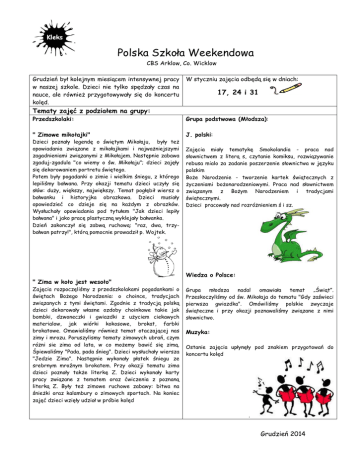Polska Szkoła Weekendowa CBS Arklow, Co. Wicklow Grudzień był kolejnym miesiącem intensywnej pracy w naszej szkole. Dzieci nie tylko spędzały czas na nauce, ale również przygotowywały się do koncertu kolęd. W styczniu zajęcia odbędą się w dniach: 17, 24 i 31 Tematy zajęć z podziałem na grupy: Przedszkolaki: Grupa podstwowa (Młodsza): " Zimowe mikołajki" J. polski: Dzieci poznały legendę o świętym Mikołaju, były też opowiadania związane z mikołajkami i najważniejszymi zagadnieniami związanymi z Mikołajem. Następnie zabawa zgaduj-zgadula "co wiemy o św. Mikołaju"; dzieci zajęły się dekorowaniem portretu świętego. Potem były pogadanki o zimie i wielkim śniegu, z którego lepiliśmy bałwana. Przy okazji tematu dzieci uczyły się słów: duży, większy, największy. Temat pogłębił wiersz o bałwanku i historyjka obrazkowa. Dzieci musiały opowiedzieć co dzieje się na każdym z obrazków. Wysłuchały opowiadania pod tytułem "Jak dzieci lepiły bałwana" i jako pracę plastyczną wyklejały bałwanka. Dzień zakonczył się zabwą ruchową: "raz, dwa, trzybałwan patrzy!", którą pomocnie prowadził p. Wojtek. " Zima w koło jest wesoło" Zajęcia rozpoczęliśmy z przedszkolakami pogadankami o świętach Bożego Narodzenia: o choince, tradycjach związanych z tymi świętami. Zgodnie z tradycją polską dzieci dekorowały własne ozdoby choinkowe takie jak bombki, dzwoneczki i gwiazdki z użyciem ciekawych materialow, jak wiórki kokosowe, brokat, farbki brokatowe. Omawialiśmy również temat otaczającej nas zimy i mrozu. Poruszylismy tematy zimowych ubrań, czym różni sie zima od lata, w co możemy bawić się zimą. Śpiewaliśmy "Pada, pada śnieg". Dzieci wysłuchały wiersza "Jedzie Zima". Następnie wykonały płatek śniegu ze srebrnym mroźnym brokatem. Przy okazji tematu zima dzieci poznały także literkę Z. Dzieci wykonały karty pracy związane z tematem oraz ćwiczenia z poznaną literką Z. Były też zimowe ruchowe zabawy: bitwa na śnieżki oraz kalambury o zimowych sportach. Na koniec zajęć dzieci wzięły udział w próbie kolęd Zajęcia miały tematykę Smokolandia - praca nad słownictwem z literą s, czytanie komiksu, rozwiązywanie rebusa mialo za zadanie poszerzenie słownictwa w języku polskim Boże Narodzenie - tworzenie kartek świątecznych z życzeniami bożonarodzeniowymi. Praca nad słownictwem związanym z Bożym Narodzeniem i tradycjami świątecznymi. Dzieci pracowały nad rozróżnieniem ś i sz. Wiedza o Polsce: Grupa młodsza nadal omawiała temat „Świąt”. Przeskoczyliśmy od św. Mikołaja do tematu "Gdy zaświeci pierwsza gwiazdka". Omówiliśmy polskie zwyczaje świąteczne i przy okazji poznawaliśmy związane z nimi słownictwo. Muzyka: Ostanie zajęcia upłynęły pod znakiem przygotowań do koncertu kolęd . Grudzień 2014 Polska Szkoła Weekendowa CBS Arklow, Co. Wicklow Grupa średnio – zaawansowna (Starsza) J. polski: Zajęcia rozpoczęliśmy od przypomnienia zasad pisania zaproszenia. Wyjaśnienia słów zawartch we wzorze zaproszenia z zeszytu ćwiczeń np. botanik, zalesianie... Praca nad słowami zawieracjącymi sz. Przypomnienie zasad pisowni wielkiej i małej litery. Wspólna praca nad dyktandem. Wspólne czytanie opowiadania o zwyczajach mikołajkowych. Czytanie ze zrozumieniem – dzieci uważnie czytając instrukcję na opakowaniu przygotowywały na zajęciach kisel lub sernik na zimno. Wspólne czytanie instrukcji na opakowaniach różnych produktów, rozwijanie słownictwa. Zapoznanie się z polskimi zwyczajami bożonarodzeniowymi. Pisanie ze słuchu – odnajdywanie w tekście słów związanych z Bożym Narodzeniem i zapisywanie ich ze słuchu. Praca na podstawie fragmentu tekstu z książki „Noelka” M. Musierowicz. W grudniu urodziny obchodzili: Wiktor, Zuzanna i Nikola 14 grudnia o godzinie 15:00 w kościele Sts. Mary and Peters w Arklow odbył się Koncert Polskich Kolęd. Bardzo serdecznie dziękujemy dzieciom za wspaniały występ. Państwu oraz przybyłym do kościoła gościom dziękujemy za wspólne kolędowanie. Na nadchodzący czas życzymy Państwu: Wspaniałych świąt Bożego Narodzenia spędzonych w ciepłej, rodzinnej atmosferze, samych szczęśliwych dni w nadchodzącym roku oraz szampańskiej zabawy sylwestrowej. Kadra PWS Kleks Wiedza o Polsce: Grupa starsza: miała test z ostatniego półrocza (15 pytań). Dzieciaki spisały się na medal:) Muzyka: Przez ostatnie zajęcia główie śpiewaliśmy kolędy, aby być gotowym na nadchodzący koncert. Starsza grupa słuchała pastorałek i poznawała tradycje zwiazane z Bożym Narodzeniem. Dodatkowe pytania prosimy kierować na adres szkoły [email protected] Grudzień 2014