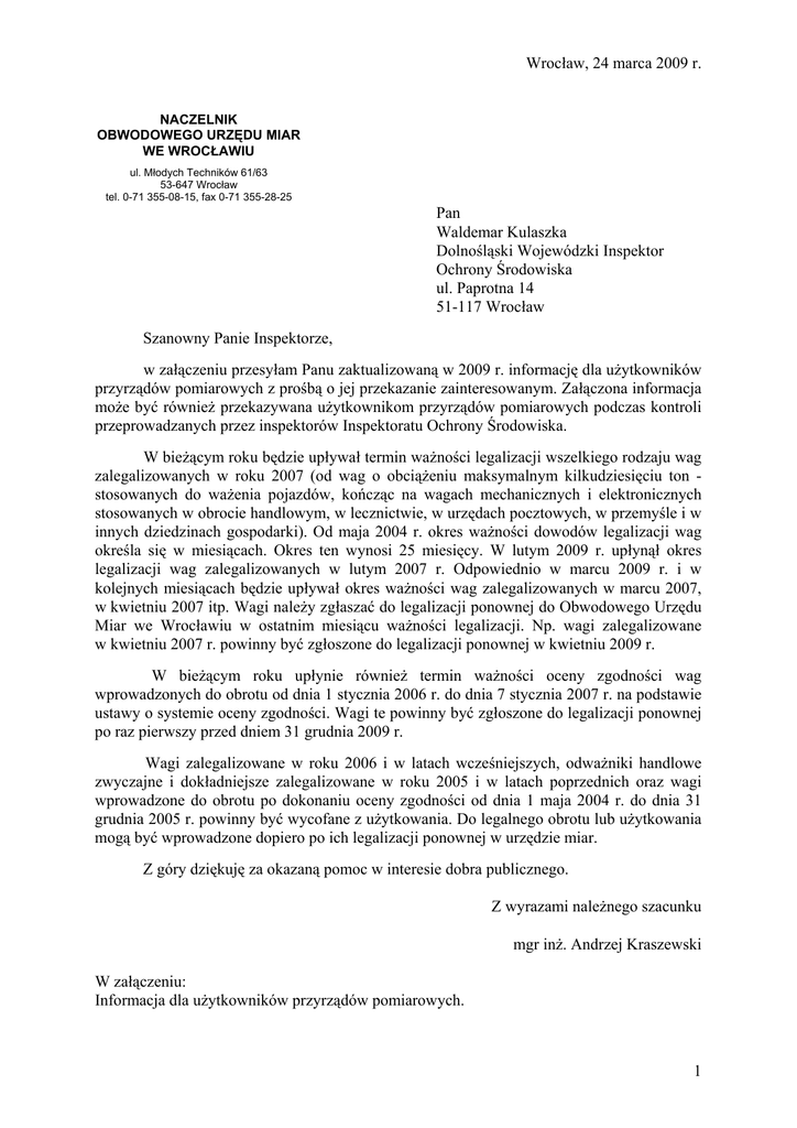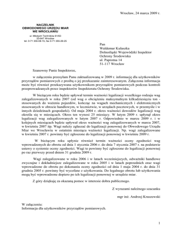 Wrocław, 24 marca 2009 r. NACZELNIK OBWODOWEGO URZĘDU MIAR WE WROCŁAWIU ul. Młodych Techników 61/63 53-647 Wrocław tel. 0-71 355-08-15, fax 0-71 355-28-25 Pan Waldemar Kulaszka Dolnośląski Wojewódzki Inspektor Ochrony Środowiska ul. Paprotna 14 51-117 Wrocław Szanowny Panie Inspektorze, w załączeniu przesyłam Panu zaktualizowaną w 2009 r. informację dla użytkowników przyrządów pomiarowych z prośbą o jej przekazanie zainteresowanym. Załączona informacja może być również przekazywana użytkownikom przyrządów pomiarowych podczas kontroli przeprowadzanych przez inspektorów Inspektoratu Ochrony Środowiska. W bieżącym roku będzie upływał termin ważności legalizacji wszelkiego rodzaju wag zalegalizowanych w roku 2007 (od wag o obciążeniu maksymalnym kilkudziesięciu ton stosowanych do ważenia pojazdów, kończąc na wagach mechanicznych i elektronicznych stosowanych w obrocie handlowym, w lecznictwie, w urzędach pocztowych, w przemyśle i w innych dziedzinach gospodarki). Od maja 2004 r. okres ważności dowodów legalizacji wag określa się w miesiącach. Okres ten wynosi 25 miesięcy. W lutym 2009 r. upłynął okres legalizacji wag zalegalizowanych w lutym 2007 r. Odpowiednio w marcu 2009 r. i w kolejnych miesiącach będzie upływał okres ważności wag zalegalizowanych w marcu 2007, w kwietniu 2007 itp. Wagi należy zgłaszać do legalizacji ponownej do Obwodowego Urzędu Miar we Wrocławiu w ostatnim miesiącu ważności legalizacji. Np. wagi zalegalizowane w kwietniu 2007 r. powinny być zgłoszone do legalizacji ponownej w kwietniu 2009 r. W bieżącym roku upłynie również termin ważności oceny zgodności wag wprowadzonych do obrotu od dnia 1 stycznia 2006 r. do dnia 7 stycznia 2007 r. na podstawie ustawy o systemie oceny zgodności. Wagi te powinny być zgłoszone do legalizacji ponownej po raz pierwszy przed dniem 31 grudnia 2009 r. Wagi zalegalizowane w roku 2006 i w latach wcześniejszych, odważniki handlowe zwyczajne i dokładniejsze zalegalizowane w roku 2005 i w latach poprzednich oraz wagi wprowadzone do obrotu po dokonaniu oceny zgodności od dnia 1 maja 2004 r. do dnia 31 grudnia 2005 r. powinny być wycofane z użytkowania. Do legalnego obrotu lub użytkowania mogą być wprowadzone dopiero po ich legalizacji ponownej w urzędzie miar. Z góry dziękuję za okazaną pomoc w interesie dobra publicznego. Z wyrazami należnego szacunku mgr inż. Andrzej Kraszewski W załączeniu: Informacja dla użytkowników przyrządów pomiarowych. 1 Legalizacja wag mechanicznych, legalizacja wag elektronicznych oraz legalizacja odważników Obwodowy Urząd Miar we Wrocławiu Wrocław, 14-01-2009 r. INFORMACJA DLA UŻYTKOWNIKÓW PRZYRZĄDÓW POMIAROWYCH Legalizacja przyrządu pomiarowego jest sprawdzeniem, stwierdzeniem i poświadczeniem dowodem legalizacji, że przyrząd pomiarowy spełnia wymagania określone we właściwych przepisach. Legalizacji podlegają wagi nieautomatyczne mechaniczne i elektroniczne, stosowane we wszystkich dziedzinach gospodarki: w obrocie handlowym, przy obliczaniu opłat targowych, ceł, podatków, premii, opustów, kar, wynagrodzeń, odszkodowań, w praktyce medycznej do ważenia pacjentów, przy sporządzaniu lekarstw na receptę w aptekach oraz w analizach wykonywanych w laboratoriach medycznych i farmaceutycznych a także przy paczkowaniu towarów. Do Obwodowego Urzędu Miar we Wrocławiu do legalizacji ponownej powinny być zgłaszane wagi - kompletne sprawne i czyste, nie później niż w ostatnim miesiącu ważności dowodu legalizacji poprzedniej. W 2009 r. należy zgłaszać do legalizacji ponownej: 1. Wagi mechaniczne i elektroniczne zalegalizowane w roku 2007. na podstawie ustawy Prawo o miarach, 2. Wagi mechaniczne i elektroniczne po dokonanej ocenie zgodności w 2006 roku na podstawie ustawy o ocenie zgodności, 3. Wagi mechaniczne i elektroniczne po naprawie, lub z uszkodzonymi cechami legalizacyjnymi bez względu na to, kiedy były uprzednio legalizowane. UWAGA Wagi zalegalizowane w styczniu 2007 r. oznaczone cechami legalizacyjnymi roczną - „07”, urzędu miar „PL”, oraz cechą miesięczną „I” (styczeń) utracą ważność ostatniego dnia stycznia 2009 r. (25 miesięcy). Wagi zalegalizowane w lutym 2007 r. oznaczone cechami legalizacyjnymi roczną - „07”, urzędu miar „PL”, oraz cechą miesięczną „II” (luty) będą ważne do ostatniego dnia lutego 2009 r. (25 miesięcy). Odpowiednio 25 miesięcy będzie wynosił okres ważności legalizacji wag zalegalizowanych w kolejnych miesiącach 2007 roku. Do legalizacji ponownej wagi należy zgłaszać najpóźniej w ostatnim miesiącu ważności ich legalizacji w celu zachowania ciągłości ważnej legalizacji. Tak samo do legalizacji ponownej należy zgłaszać wagi po naprawie lub po stwierdzeniu, że mają uszkodzone cechy legalizacyjne. Nałożone na wagi w styczniu 2009 r. cechy urzędu „3PL1”, cecha miesięczna „I” (styczeń) wraz z cechą roczną „09” będą ważnymi dowodami legalizacji wag do 31 stycznia 2011 r. UWAGA! 2 Wagi zalegalizowane w roku 2006 w dowolnym miesiącu i w latach wcześniejszych (oznaczone cechą roczną „06”, „05”, „04” „03”...) i jedną z cech miesięcznych („I” – „XII”, które nie zostały zgłoszone do obowiązkowej legalizacji ponownej w latach ubiegłych) mają nieważne cechy legalizacyjne, powinny być wycofane z użytkowania i zgłoszone do legalizacji ponownej. LEGALIZACJA WAG WPROWADZONYCH DO OBROTU NA PODSTAWIE USTAWY O SYSTEMIE OCENY ZGODNOŚCI (LEGALIZACJA WE) Wagi wprowadzone do obrotu na podstawie ustawy o systemie oceny zgodności (Dz. U. z 2004 r., Nr 204, poz. 2087, z późn. zmianami) od dnia 1 maja 2004 r. do dnia 31 grudnia 2005 r. powinny być wycofane z użytkowania w związku z upłynięciem terminu ważności ich dowodów oceny zgodności jako dowodów legalizacji, jeśli miałyby być stosowane w dziedzinach, w których podlegają lega