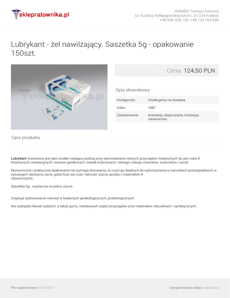 AGIMED Tomasz Dziwosz Ul. Kuźnicy Kołłątajowskiej 6A/41, 31-234 Kraków +48 530 328 132; +48 123 764 830 Lubrykant - żel nawilżający. Saszetka 5g - opakowanie 150szt. Cena: 124,50 PLN Opis słownikowy Dostępność Oczekujemy na dostawę Index 1687 Zastosowanie anestezja, diagnostyka, intubacja, ratownictwo Opis produktu Lubrykant stosowany jest jako środek nadający poślizg przy wprowadzaniu różnych przyrządów medycznych do jam ciała #℣佐⌡⌀渀瀀⸀ 爀甀爀攀k krtaniowych, intubacyjnych, nosowo-gardłowych, masek krtaniowych, różnego rodzaju cewników, wzierników i sond). Ekonomiczne i praktyczne opakowanie nie wymaga dozowania, co czyni go idealnym do wykorzystania w warunkach pozaszpitalnych, w sytuacjach ratowania życia, gdzie liczy się czas i łatwość użycia sprzętu i materiałów #℣佐⌡⌀渀椀攀稀戁ᤀ搀渀礀 攀氀攀洀攀渀琀 眀礀瀀漀猀愁簀攀渀椀愀 琀漀爀攀戀 椀 瀀氀攀挀愀欀w ratowniczych). Saszetka 5g - wystarcza na jedno użycie. Znajduje zastosowanie również w badaniach ginekologicznych, proktologicznych. Nie uszkadza tkanek ludzkich, a także gumy, metalowych części przyrządów oraz materiałów naturalnych i syntetycznych. Plik wygenerowano: 03-03-2017 Powered by TCPDF (www.tcpdf.org) Oprogramowanie sklepu: AptusShop