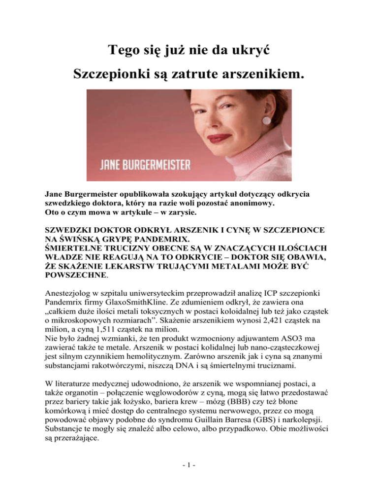Tego się juŜ nie da ukryć Szczepionki są zatrute arszenikiem. Jane Burgermeister opublikowała szokujący artykuł dotyczący odkrycia szwedzkiego doktora, który na razie woli pozostać anonimowy. Oto o czym mowa w artykule – w zarysie. SZWEDZKI DOKTOR ODKRYŁ ARSZENIK I CYNĘ W SZCZEPIONCE NA ŚWIŃSKĄ GRYPĘ PANDEMRIX. ŚMIERTELNE TRUCIZNY OBECNE SĄ W ZNACZĄCYCH ILOŚCIACH WŁADZE NIE REAGUJĄ NA TO ODKRYCIE – DOKTOR SIĘ OBAWIA, śE SKAśENIE LEKARSTW TRUJĄCYMI METALAMI MOśE BYĆ POWSZECHNE. Anestezjolog w szpitalu uniwersyteckim przeprowadził analizę ICP szczepionki Pandemrix firmy GlaxoSmithKline. Ze zdumieniem odkrył, Ŝe zawiera ona „całkiem duŜe ilości metali toksycznych w postaci koloidalnej lub teŜ jako cząstek o mikroskopowych rozmiarach”. SkaŜenie arszenikiem wynosi 2,421 cząstek na milion, a cyną 1,511 cząstek na milion. Nie było Ŝadnej wzmianki, Ŝe ten produkt wzmocniony adjuwantem ASO3 ma zawierać takŜe te metale. Arszenik w postaci kolidalnej lub nano-cząsteczkowej jest silnym czynnikiem hemolitycznym. Zarówno arszenik jak i cyna są znanymi substancjami rakotwórczymi, niszczą DNA i są śmiertelnymi truciznami. W literaturze medycznej udowodniono, Ŝe arszenik we wspomnianej postaci, a takŜe organotin – połączenie węglowodorów z cyną, mogą się łatwo przedostawać przez bariery takie jak łoŜysko, bariera krew – mózg (BBB) czy teŜ błone komórkową i mieć dostęp do centralnego systemu nerwowego, przez co mogą powodować objawy podobne do syndromu Guillain Barresa (GBS) i narkolepsji. Substancje te mogły się znaleźć albo celowo, albo przypadkowo. Obie moŜliwości są przeraŜające. -1- Doktor, który chce pozostać anonimowy, poinformował władze Szwecji, ale reakcja była niewielka. Obawia się, Ŝe skaŜenie szczepionek i innych lekarstw toksycznymi metalami moŜe być rozpowszechnione na całym świecie. Dlatego teŜ wyszedł z tą informacją do dziennikarzy alternatywnych jak Jane Burgermeister. To, Ŝe lekarstwa mogą być zabójcze nie jest nowością, niedawno we Francji wyszło, Ŝe lek o nazwie Mediator zabił 500 – 2000 osób mimo, Ŝe zawierał ostrzeŜenie o skutkach ubocznych ( http://www.bbc.co.uk/news/world-europe-12155639 ). Pod koniec 2010 roku, Unia Europejska zaostrzyła przepisy odnośnie bezpieczeństwa leków, ale jak wynika z badań szwedzkiego doktora, nie są zbyt efektywne. Dodatkowo, twierdzi on, Ŝe znalazł toksyczne metale nie tylko w szczepionkach, ale i innych lekarstwach. http://www.epha.org/a/4372 Doktor został sprowokowany do zbadania szczepionek po tym jak jedna z pacjentek Ŝaliła się na ból w miejscu ukłucia. Bóle dotyczyły takŜe jej męŜa i trójki dzieci, którzy zaszczepili się w 2009 roku Pandemrixem. Musi być ona zmieszana z adjuwantem przed zaszczepieniem. Doktor obawiał się, Ŝe plastikowe czy teŜ gumowe części ampułek mogły skazić ich zawartość, ale jak się okazało przyczyna była inna. Na koniec artykułu Jane Burgermeister przypomina, Ŝe w lutym 2009 roku 72 kilogramów materiału szczepionkowego firmy Baxter na grypę sezonową zostało skaŜonych wirusem ptasiej grypy i to zostało wysłane do laboratoriów w 4 róŜnych krajach, w celu rozpowszechnienia. Wywołałoby to pandemię ptasiej grypy o zasięgu globalnym, gdyby nie przytomność laboranta w czeskim laboratorium, który sprawdził materiał na fretkach. Okazało się, Ŝe fretki zdechły – to samo by się stało z ludźmi. PoniewaŜ laboratoria Baxtera mają 3 poziom bezpieczeństwa, to niemoŜliwe byłoby przypadkowe skaŜenie materiału szczepionkowego. Musiał być to więc celowy akt bioterroryzmu zrealizowany przez pracowników firmy Baxter. Burgermeister załoŜyła więc w kwietniu sprawę karną przeciwko Baxterowi, którą policja austriacka umorzyła we wrześniu, zaraz po rozpoczęciu kampanii szczepionkowej. Szczepionka Baxtera otrzymała ostatecznie licencję, lecz pozbawiona była adjuwantów w postaci thiomersalu zawierającego rtęć, która jest prawdopodobnie przyczyną autyzmu. 30 milionów europejczyków zaszczepiło się na świńską grypę, Pandemrix podejrzewa się o wywołanie narkolepsji wśród zaszczepionych mieszkańców Finlandii, Szwecji, Norwegii i Francji. -2- komentarz monitorpolski: JeŜeli nie jest to prowokacja wobec Jane Burgermeister, to moŜemy mieć do czynienia z niepodwaŜalnymi dowodami na ludobójstwo za pomocą leków. Wyniki badań szwedzkiego doktora moŜna potwierdzić lub obalić, trudno jednak załoŜyć, Ŝe wszędzie są skaŜone szczepionki. Tak więc moŜna się spodziewać duŜego ataku na osoby to badające, szczególnie na doktora, który to ujawnił. UwaŜam, Ŝe ten człowiek nie powinien pozostawać anonimowy, bowiem jego Ŝycie wisi na włosku. Miejmy nadzieję, Ŝe wkrótce się ujawni. Org: http://birdflu666.wordpress.com/2011/08/19/toxic-metals-found-in-pandemrix-swineflu-vaccine-by-swedish-doctor/ Źródło: http://monitorpolski.wordpress.com/ Video z konferencji - Jane Burgermeister Wake Up Call http://www.youtube.com/watch?v=2tWDi1-ETHI Video Project Camelot - wywiad z Jane Burgermeister PL http://www.youtube.com/watch?v=zzg98Swjz98 -3-