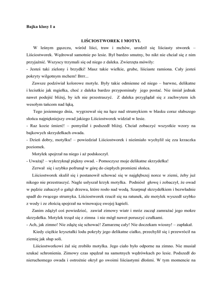 Bajka klasy I a LIŚCIOSTWOREK I MOTYL W leśnym gąszczu, wśród liści, traw i mchów, urodził się liściasty stworek – Liściostworek. Wędrował samotnie po lesie. Był bardzo smutny, bo nikt nie chciał się z nim przyjaźnić. Wszyscy trzymali się od niego z daleka. Zwierzęta mówiły: - Jesteś taki zielony i brzydki! Masz takie wielkie, grube, liściaste ramiona. Cały jesteś pokryty wilgotnym mchem! Brrr... Zawsze podziwiał kolorowe motyle. Były takie odmienne od niego – barwne, delikatne i leciutkie jak mgiełka, choć z daleka bardzo przypominały jego postać. Nie śmiał jednak nawet podejść bliżej, by ich nie przestraszyć. Z daleka przyglądał się z zachwytem ich wesołym tańcom nad łąką. Tego jesiennego dnia, wygrzewał się na łące nad strumykiem w blasku coraz słabszego słońca najpiękniejszy owad jakiego Liściostworek widział w lesie. - Raz kozie śmierć! – pomyślał i podszedł bliżej. Chciał zobaczyć wszystkie wzory na bajkowych skrzydełkach owada. - Dzień dobry, motylku! – powiedział Liściostworek i nieśmiało wychylił się zza krzaczka poziomek. Motylek spojrzał na niego i aż podskoczył. - Uważaj! – wykrzyknął piękny owad. - Pomoczysz moje delikatne skrzydełka! Zerwał się i szybko pofrunął w górę do ciepłych promieni słońca. Liściostworek skulił się i postanowił schować się w najgłębszej norce w ziemi, żeby już nikogo nie przestraszyć. Nagle usłyszał krzyk motylka. Podniósł głowę i zobaczył, że owad w pędzie zahaczył o gałąź drzewa, które rosło nad wodą. Szarpnął skrzydełkiem i bezwładnie spadł do rwącego strumyka. Liściostworek rzucił się na ratunek, ale motylek wyszedł szybko z wody i ze złością spojrzał na winowajcę swojej kąpieli. Zanim zdążył coś powiedzieć, zawiał zimowy wiatr i mróz zaczął zamrażać jego mokre skrzydełka. Motylek trząsł się z zimna i nie mógł nawet poruszyć czułkami. - Ach, jak zimno! Nie zdążę się schować! Zamarznę cały! Nie doczekam wiosny! – zapłakał. Kiedy ciężkie kryształki lodu pokryły jego delikatne ciałko, przechylił się i przewrócił na ziemię jak słup soli. Liściostworkowi żal się zrobiło motylka. Jego ciało było odporne na zimno. Nie musiał szukać schronienia. Zimowy czas spędzał na samotnych wędrówkach po lesie. Podszedł do nieruchomego owada i ostrożnie okrył go swoimi liściastymi dłońmi. W tym momencie na ziemię spadły pierwsze płatki śniegu. Jego szerokie ramiona szybko pokryła gruba warstwa puchu bielutką, ciepłą kołderką. Szczęśliwy Liściostworek zasnął głębokim, zimowym snem. Wiosną Liściostworka obudziły ciepłe promienie słońca, które roztopiły śnieg. Rozejrzał się dookoła i przypomniał sobie powoli, co wydarzyło się zanim zasnął. Spojrzał na motylka, który przespał zimę okryty jego miękkimi dłońmi. Miał on mokre skrzydełka i bladą buzię. Słoneczko ciepłymi promykami szybko wysuszyło skrzydełka owada, ale motylek nie poruszył się wcale. Liściostworek przestraszył się, bo pomyślał, że piękny owad nie żyje. - Ojej... Co ja narobiłem! – załkał. - Pewnie zgniotłem jego delikatne skrzydełka. Jestem taki ciężki i niezgrabny! Jak mogłem sądzić, że mogę zaprzyjaźnić się z motylkiem... Łzy napłynęły mu do oczu. Zapłakał głośno nad losem motylka, którego chciał ochronić. Poczuł się jeszcze bardziej nieszczęśliwy, gdy pomyślał, że znów będzie samotnie wędrował po świecie. Otarł łzy liściastymi dłońmi i zobaczył, że na jego paluszkach zebrało się kilka wielkich kropel. Zwinął dłoń w lejek i kropelki popłynęły do ust motylka. Owad powoli otworzył oczy, rozprostował skrzydełka i pofrunął do słońca. Wrócił zaraz uradowany, ukłonił się zielonemu stworkowi i powiedział: - Dziękuję ci! Uratowałeś mi życie! Wybacz, że byłem dla ciebie taki niemiły. Chciałbyś zostać moim przyjacielem? - Nie przeszkadza ci, że jestem taki szary i brzydki? – zdziwił się Liściostworek. – Mógłbym pomoczyć twoje delikatne skrzydełka ... – dodał, chowając za sobą liściaste ręce. - Jesteś najpiękniejszym stworkiem z liści jakiego poznałem! – wykrzyknął radośnie. - Jeśli zaś osuszymy twoje listki, na pewno pofruniesz nad łąką, tak jak ja. Najważniejsze jest twoje dobre, ciepłe serduszko, które jak słońce potrafi ochronić przed zimnem i dodać skrzydeł. Ilustracje do bajki „Liściostworek i motyl”