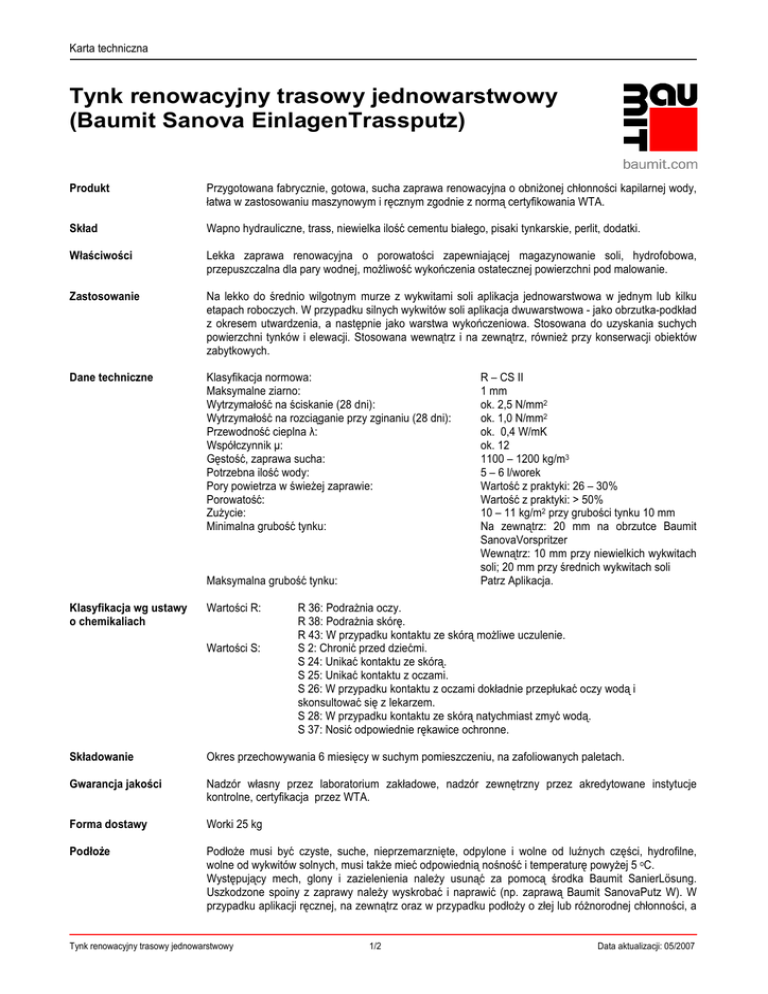 Karta techniczna Tynk renowacyjny trasowy jednowarstwowy (Baumit Sanova EinlagenTrassputz) Produkt Przygotowana fabrycznie, gotowa, sucha zaprawa renowacyjna o obniŜonej chłonności kapilarnej wody, łatwa w zastosowaniu maszynowym i ręcznym zgodnie z normą certyfikowania WTA. Skład Wapno hydrauliczne, trass, niewielka ilość cementu białego, pisaki tynkarskie, perlit, dodatki. Właściwości Lekka zaprawa renowacyjna o porowatości zapewniającej magazynowanie soli, hydrofobowa, przepuszczalna dla pary wodnej, moŜliwość wykończenia ostatecznej powierzchni pod malowanie. Zastosowanie Na lekko do średnio wilgotnym murze z wykwitami soli aplikacja jednowarstwowa w jednym lub kilku etapach roboczych. W przypadku silnych wykwitów soli aplikacja dwuwarstwowa - jako obrzutka-podkład z okresem utwardzenia, a następnie jako warstwa wykończeniowa. Stosowana do uzyskania suchych powierzchni tynków i elewacji. Stosowana wewnątrz i na zewnątrz, równieŜ przy konserwacji obiektów zabytkowych. Dane techniczne Klasyfikacja normowa: Maksymalne ziarno: Wytrzymałość na ściskanie (28 dni): Wytrzymałość na rozciąganie przy zginaniu (28 dni): Przewodność cieplna λ: Współczynnik µ: Gęstość, zaprawa sucha: Potrzebna ilość wody: Pory powietrza w świeŜej zaprawie: Porowatość: ZuŜycie: Minimalna grubość tynku: Maksymalna grubość tynku: Klasyfikacja wg ustawy o chemikaliach Wartości R: Wartości S: R – CS II 1 mm ok. 2,5 N/mm2 ok. 1,0 N/mm2 ok. 0,4 W/mK ok. 12 1100 – 1200 kg/m3 5 – 6 l/worek Wartość z praktyki: 26 – 30% Wartość z praktyki: > 50% 10 – 11 kg/m2 przy grubości tynku 10 mm Na zewnątrz: 20 mm na obrzutce Baumit SanovaVorspritzer Wewnątrz: 10 mm przy niewielkich wykwitach soli; 20 mm przy średnich wykwitach soli Patrz Aplikacja. R 36: PodraŜnia oczy. R 38: PodraŜnia skórę. R 43: W przypadku kontaktu ze skórą moŜliwe uczulenie. S 2: Chronić przed dziećmi. S 24: Unikać kontaktu ze skórą. S 25: Unikać kontaktu z oczami. S 26: W przypadku kontaktu z oczami dokładnie przepłukać oczy wodą i skonsultować się z lekarzem. S 28: W przypadku kontaktu ze skórą natychmiast zmyć wodą. S 37: Nosić odpowiednie rękawice ochronne. Składowanie Okres przechowywania 6 miesięcy w suchym pomieszczeniu, na zafoliowanych paletach. Gwarancja jakości Nadzór własny przez laboratorium zakładowe, nadzór zewnętrzny przez akredytowane instytucje kontrolne, certyfikacja przez WTA. Forma dostawy Worki 25 kg PodłoŜe PodłoŜe musi być czyste, suche, nieprzemarznięte, odpylone i wolne od luźnych części, hydrofilne, wolne od wykwitów solnych, musi takŜe mieć odpowiednią nośność i temperaturę powyŜej 5 oC. Występujący mech, glony i zazielenienia naleŜy usunąć za pomocą środka Baumit SanierLösung. Uszkodzone spoiny z zaprawy naleŜy wyskrobać i naprawić (np. zaprawą Baumit SanovaPutz W). W przypadku aplikacji ręcznej, na zewnątrz oraz w przypadku podłoŜy o złej lub róŜnorodnej chłonności, a Tynk renowacyjny trasowy jednowarstwowy 1/2 Data aktualizacji: 05/2007 Karta techniczna takŜe w przypadku murów zabytkowych o wymaganej róŜnej grubości tynku naleŜy zawsze uŜywać środka Baumit SanovaVorspritzer. Aplikacja Zaprawę Baumit Sanova EinlagenTrassputz miesza się z czystą wodą. Czas mieszania mieszadłem 3 – 5 minut. Zaprawę Baumit Sanova EinlagenTrassputz moŜna równieŜ nakładać z pomocą agregatów tynkarskich. Wewnątrz: Znormalizowany, równy mur, grubości tynku 10 do 20 mm (jednowarstwowo), niewielka wilgotność, niewielkie wykwity soli: obrzutka niekonieczna, zaprawa Baumit Sanova EinlagenTrassputz nakładać maszynowo, zatrzeć packą filcową. Wewnątrz i na zewnątrz: Mur z cegły i z kamienia (nieregularny) lub podobny, grubość tynku do 20 mm (jednowarstwowo), niewielkie lub średnie wykwity soli: obrzutka z Baumit SanovaVorspritzer, krycie do 50% (mieć na uwadze czas twardnienia), zaprawa Baumit Sanova EinlagenTrassputz nakładana maszynowo, zatrzeć packą filcową. Mur (nieregularny), grubości tynku do 30 mm (jedno- lub dwuwarstwowo), niewielka wilgotność, niewielkie wykwity soli: obrzutka z Baumit SanovaVorspritzer, krycie do 50% (mieć na uwadze czas twardnienia), zaprawa Baumit Sanova EinlagenTrassputz nakładana maszynowo: 1-sza warstwa do 25 mm, powierzchnię zatrzeć na szorstko grzebieniem do tynku (czas twardnienia ok. 24 godziny); 2-ga warstwa zaprawy Baumit Sanova EinlagenTrassputz 5 – 7 mm, zatrzeć packą filcową. Mur z cegły lub z kamienia (nieregularny), grubości tynku od 30 do maks. 80 mm (jedno- lub dwuwarstwowo), średnia wilgotność, średnie do większych wykwity soli: obrzutka z Baumit SanovaVorspritzer, krycie w 100% (mieć na uwadze czas twardnienia), zaprawa Baumit Sanova EinlagenTrassputz nakładana maszynowo: 1-sza warstwa (obrzutka wyrównująca), powierzchnię zatrzeć na szorstko siatką do zacierania tynku (czas twardnienia ok. 7 dni w zaleŜności od grubości tynku, zwilŜać i wietrzyć przez 2 – 3 dni); 2-ga warstwa zaprawy Baumit Sanova EinlagenTrassputz o równomiernej grubości 15 mm, zatrzeć packą filcową. Wskazówki i informacje ogólne W trakcie aplikacji i procesu twardnienia temperatura otoczenia, materiału i podłoŜa musi wynosić powyŜej +5o C. Przed kaŜdym kolejnym nałoŜeniem warstwy zachowywać okres twardnienia min. 7 dni na kaŜdy cm grubości tynku. Wykończenie na zewnątrz: Baumit SilikatFarbe i Baumit UniversalGrund Baumit SilikonFarbe Baumit SilikatPutz i Baumit UniversalGrund Baumit SilikonPutz i Baumit UniversalGrund Wykończenie wewnątrz: Baumit SilikatFarbe i Baumit UniversalGrund Baumit SilikonFarbe Okres wytrzymałości systemu renowacyjnego zaleŜy głównie od zawilgocenia i stopnia zasolenia podłoŜa. Dlatego teŜ przed wykonaniem właściwego tynku wskazane jest wyeliminowanie lub znaczne ograniczenie dostępu wilgoci np. poprzez wykonanie izolacji, opaski drenarskiej itp. Nasze zalecenia w za