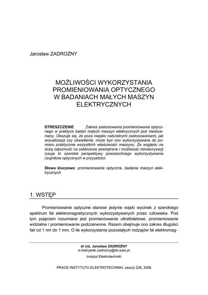 Jarosław ZADROŻNY MOŻLIWOŚCI WYKORZYSTANIA PROMIENIOWANIA OPTYCZNEGO W BADANIACH MAŁYCH MASZYN ELEKTRYCZNYCH STRESZCZENIE Zakres zastosowania promieniowania optycznego w praktyce badań małych maszyn elektrycznych jest niedoceniany. Okazuje się, że poza niejako naturalnymi zastosowaniami, jak wizualizacja czy oświetlenie, może być ono wykorzystywane do pomiaru praktycznie wszystkich właściwości maszyny. Ze względu na dużą odporność na zakłócenia zewnętrzne i możliwość miniaturyzacji rysuje to szerokie perspektywy powszechnego wykorzystywania czujników optycznych w przyszłości. Słowa kluczowe: promieniowanie optyczne, badania maszyn elektrycznych 1. WSTĘP Promieniowanie optyczne stanowi jedynie wąski wycinek z szerokiego spektrum fal elektromagnetycznych wykorzystywanych przez człowieka. Pod tym pojęciem rozumiane jest promieniowanie ultrafioletowe, promieniowanie widzialne i promieniowanie podczerwone. Razem obejmuje ono zakres długości fali od 1 nm do 1 mm. O ile wykorzystanie pozostałych rodzajów fal elektromag- dr inż. Jarosław ZADROŻNY e-mail:[email protected] Instytut Elektrotechniki PRACE INSTYTUTU ELEKTROTECHNIKI, zeszyt 228, 2006 350 J. Zadrożny netycznych w elektrotechnice, w tym w maszyna elektrycznych, nie budzi żadnych wątpliwości, to zastosowanie promieniowania optycznego najczęściej kojarzone jest jedynie z badaniami materiałowymi. Tymczasem w praktyce zakres zastosowania promieniowania optycznego w badaniach małych maszyn elektrycznych jest już bardzo szeroki, począwszy od badań podczas procesu produkcji, a na badaniach właściwości i badaniach diagnostycznych kończąc. Poza oczywistymi zastosowaniami do oględzin i oświetlenia – tu ciekawymi rozwiązaniami są mini- i mikro-kamery oraz endoskopy – powszechnie wykorzystuje się promieniowanie optyczne do pomiaru drgań, hałasu, temperatury, prędkości i momentu obrotowego, a także indukcji magnetycznej oraz do identyfikacji materiałów. W diagnostyce rozpowszechniona jest analiza drgań i hałasu oraz badania endoskopowe i defektoskopia. 2. WIZUALIZACJA I OŚWIETLENIE Zastosowaniami najbardziej naturalnymi są wizualizacja i oświetlenie. O ile bezpośrednie wykorzystanie oka sprowadza się jedynie do oględzin, to wsparcie za pomocą mini- i mikro-kamer lub endoskopów pozwala obserwować niedstępne normalnie elementy maszyny, także podczas jej pracy. Postęp w technologii wykonania kamer elektronicznych spowodował taką ich miniaturyzację, że możliwe jest umieszczenie kamery w tak małych obszarach jak szczelina między wirnikiem a stojanem maszyny. Rys. 1. Przykład mikrokamer Możliwości wykorzystania promieniowania optycznego w badaniach ... 351 3. POMIAR HAŁASU I DRGAŃ Przy pomiarach drgań i hałasów przede wszystkim wykorzystuje się promień lasera. Skoligowany promień lasera emitowany w kierunku badanego obiektu odbija się od drgającej powierzchni, co powoduje modulowanie powracającej fali. Rys. 2. Zasada działania mikrofonu laserowego Na tej zasadzie działają zarówno mikrofony optyczne jak i czujniki drgań. Jako czujniki drgań są też często stosowane mikro–lustra, zaliczane do mikroukładów mechatronicznych (MEMS). 352 J. Zadrożny 4. POMIAR TEMPERATURY W pomiarach temperatury przede wszystkim są wykorzystywane pirometry. Optyczny pomiar temperatury pozwala mierzyć temperaturę elementów trudno dostępnych, skrytych pod wszelkimi osłonami, a także temperaturę elementów wirujących podczas ich normalnej pracy. Rys.3. Przykład pirometrycznego miernika temperatury 5. POMIAR PRĘDKOŚCI I MOMENTU OBROTOWEGO W pomiarach prędkości obrotowej przede wszystkim są wykorzystywane wszelkiego rodzaju tarcze z naniesioną podziałką lub wałki z elementami odbijającymi. Pomiar prędkości może być przy tym wykonywany na zasadzie pomiaru liczby impulsów w zadanym czasie (częstotliwości) lub pomiaru czasu pomiędzy kolejnymi impulsami (okresu). Ciekawym i oryginalnym pomysłem jest fotooptyczny pomiar kata skręcenia wałka skrętnego wykorzystywanego do pomiaru momentu obrotowego. Możliwości wykorzystania promieniowania optycznego w badaniach ... 353 b) a) c) Rys. 4. Zasada działania fotooptycznego miernika momentu [1] Ciekawym, jeszcze nie wykorzystywanym powszechnie zjawiskiem, jest zjawisko piezooptyczne występujące w światłowodach. Wpływ siły ściskającej lub skręcającej światłowód na jego właściwości optyczne daje szerokie możliwości zastosowań. a) a) b) b) Rys. 5. Rodzaje występowania efektu piezooptycznego: a) przy ściskaniu, b) przy skręcaniu 6. POMIAR INDUKCJI MAGNETYCZNEJ W pomiarach indukcji jest wykorzystywane zjawisko magnetooptyczne Faraday’a. Polega ono na skręceniu płaszczyzny polaryzacji spolaryzowanego światła pod wpływem pola magnetycznego. Zależność kąta skręcenie jest wprost proporcjonalna do wartości indukcji. 354 J. Zadrożny ϕ l Rys. 6. Efekt Faraday’a wykorzystywany do pomiaru wartości indukcji magnetycznej 7. PERSPEKTYWY Postęp technologii mikrooptyki, zwłaszcza światłowodów i przetworników MEMS skłania do stwierdzenia, że w najbliższych latach nastąpi gwałtowny rozwój specjalistycznych przyrządów pomiarowych pozwalających na lepsze poznanie zjawisk wewnątrz małych maszyn elektrycznych oraz dających możliwości bieżącej, bezinwazyjnej diagnostyki podczas pracy. Odzwierciedleniem tego SA zarówno pojawiające się prace o charakterze naukowo-badawczym, jak i pojawiające się w ofertach firma opracowania nowych przyrządów pomiarowych. LITERATURA 1. Bodnicki M., Sakowicz P.: Rozwój konstrukcji momentomierzy obrotowych typu OPM przeznaczonych do badania układów napędowych techniki precyzyjnej. IX Sympozjum „Mikromaszyny i Serwonapędy MiS’94”, Kraków - Przegorzały, 5-9.09.1994, s. 139-148 2. http://www.polytec.com/ 3. http://www.sennheiser.de/ Rękopis dostarczono, dnia 13.09.2006 r. Możliwości wykorzystania promieniowania
