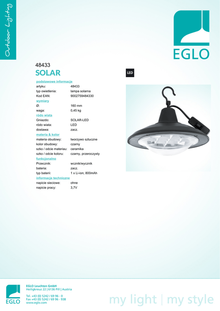 48433 SOLAR podstawowe informacje artyku: 48433 typ owietlenia: lampa solarna Kod EAN: 9002759484330 wymiary Ø: 160 mm waga: 0,45 kg ródo wiata Gniazdo: SOLAR-LED ródo wiata: LED dostawa: zacz. materia & kolor materia obudowy: tworzywo sztuczne kolor obudowy: czarny szko / odcie materiau: ceramika szko / odcie koloru: czarny, przeroczysty funkcjonalno Przecznik: wcznik/wycznik bateria: zacz. typ baterii: 1 x Li-ion; 800mAh informacje techniczne napicie sieciowe: ohne napicie pracy: 3,7V