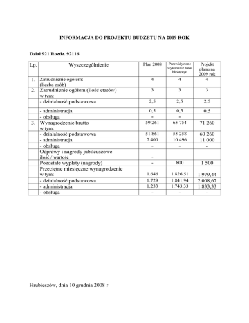 INFORMACJA DO PROJEKTU BUDśETU NA 2009 ROK Dział 921 Rozdz. 92116 Lp. Wyszczególnienie 1. Zatrudnienie ogółem: Plan 2008 Przewidywane wykonanie roku bieŜącego Projekt planu na 2009 rok 4 4 4 3 3 3 2,5 2,5 2,5 0,5 59.261 0,5 65 754 0,5 71 260 51.861 7.400 - 55 258 10 496 - 60 260 11 000 - - 800 1 500 1.646 1.729 1.233 1.826,51 1.841,94 1.743,33 - - 1.979,44 2.008,67 1.833,33 - (liczba osób) 2. Zatrudnienie ogółem (ilość etatów) w tym: - działalność podstawowa - administracja - obsługa 3. Wynagrodzenie brutto w tym: - działalność podstawowa - administracja - obsługa Odprawy i nagrody jubileuszowe ilość / wartość Pozostałe wypłaty (nagrody) Przeciętne miesięczne wynagrodzenie w tym: - działalność podstawowa - administracja - obsługa Hrubieszów, dnia 10 grudnia 2008 r