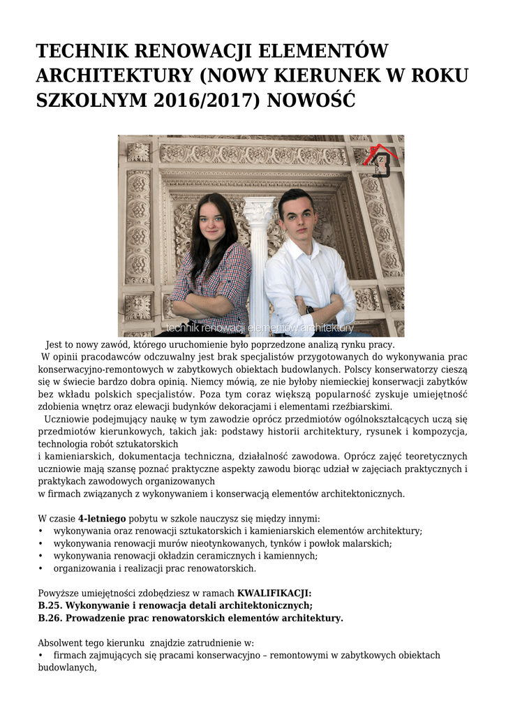 TECHNIK RENOWACJI ELEMENTÓW ARCHITEKTURY (NOWY KIERUNEK W ROKU SZKOLNYM 2016/2017) NOWOŚĆ Jest to nowy zawód, którego uruchomienie było poprzedzone analizą rynku pracy. W opinii pracodawców odczuwalny jest brak specjalistów przygotowanych do wykonywania prac konserwacyjno-remontowych w zabytkowych obiektach budowlanych. Polscy konserwatorzy cieszą się w świecie bardzo dobra opinią. Niemcy mówią, ze nie byłoby niemieckiej konserwacji zabytków bez wkładu polskich specjalistów. Poza tym coraz większą popularność zyskuje umiejętność zdobienia wnętrz oraz elewacji budynków dekoracjami i elementami rzeźbiarskimi. Uczniowie podejmujący naukę w tym zawodzie oprócz przedmiotów ogólnokształcących uczą się przedmiotów kierunkowych, takich jak: podstawy historii architektury, rysunek i kompozycja, technologia robót sztukatorskich i kamieniarskich, dokumentacja techniczna, działalność zawodowa. Oprócz zajęć teoretycznych uczniowie mają szansę poznać praktyczne aspekty zawodu biorąc udział w zajęciach praktycznych i praktykach zawodowych organizowanych w firmach związanych z wykonywaniem i konserwacją elementów architektonicznych. W czasie 4-letniego pobytu w szkole nauczysz się między innymi: • wykonywania oraz renowacji sztukatorskich i kamieniarskich elementów architektury; • wykonywania renowacji murów nieotynkowanych, tynków i powłok malarskich; • wykonywania renowacji okładzin ceramicznych i kamiennych; • organizowania i realizacji prac renowatorskich. Powyższe umiejętności zdobędziesz w ramach KWALIFIKACJI: B.25. Wykonywanie i renowacja detali architektonicznych; B.26. Prowadzenie prac renowatorskich elementów architektury. Absolwent tego kierunku znajdzie zatrudnienie w: • firmach zajmujących się pracami konserwacyjno – remontowymi w zabytkowych obiektach budowlanych, • firmach wykonujących dekoracje sztukatorskie i kamieniarskie we współczesnych budynkach • firmach związanych z wykonywaniem obiektów małej architektury (rzeźby, pomniki, nagrobki itp.). • może także prowadzić własną firmę usługową. Po ukończeniu nauki w technikum uczniowie mogą zdawać maturę, która jest przepustką na studia Absolwent technikum wyposażony jest w wiedzę i umiejętności niezbędne do dalszego kształcenia, przede wszystkim na wydziałach architektury, konserwacji zabytków, architektury wnętrz, ale również innych, zgodnych z indywidualnymi zainteresowaniami.