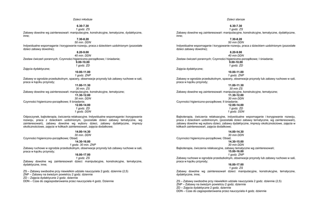 Dzieci młodsze Dzieci starsze 6.30-7.30 1 godz. ZS Zabawy dowolne wg zainteresowań: manipulacyjne, konstrukcyjne, tematyczne, dydaktyczne, inne; 7.30-8.20 50 min. DDN Indywidualne wspomaganie i korygowanie rozwoju, praca z dzieckiem uzdolnionym (pozostałe dzieci zabawy dowolne); 8.20-9.00 40 min. DDN Zestaw ćwiczeń porannych; Czynności higieniczno-porządkowe; I śniadanie; 9.00-10.00 1 godz. ZD Zajęcia dydaktyczne; 10.00-11.00 1 godz. ZNP Zabawy w ogrodzie przedszkolnym, spacery, obserwacje przyrody lub zabawy ruchowe w sali, praca w kąciku przyrody; 11.00-11.30 30 min. ZS Zabawy dowolne wg zainteresowań: manipulacyjne, konstrukcyjne, tematyczne; 11.30-12.00 30 min. DDN Czynności higieniczno-porządkowe; II śniadanie; 12.00-14.00 1 godz. ZD 1 godz. DDN 6.30-7.30 1 godz. ZS Zabawy dowolne wg zainteresowań: manipulacyjne, konstrukcyjne, tematyczne, dydaktyczne, inne; 7.30-8.20 50 min DDN Indywidualne wspomaganie i korygowanie rozwoju, praca z dzieckiem uzdolnionym (pozostałe dzieci zabawy dowolne); 8.20-9.00 40 min DDN Zestaw ćwiczeń porannych; Czynności higieniczno-porządkowe; I śniadanie; 9.00-10.00 1 godz. ZD Zajęcia dydaktyczne; 10.00-11.00 1 godz. ZNP Zabawy w ogrodzie przedszkolnym, spacery, obserwacje przyrody lub zabawy ruchowe w sali, praca w kąciku przyrody; 11.00-11.30 30 min ZS Zabawy dowolne wg zainteresowań: manipulacyjne, konstrukcyjne, tematyczne; 11.30-12.00 30 min DDN Czynności higieniczno-porządkowe; II śniadanie; 12.00-14.00 1 godz. ZD 1 godz. DDN Odpoczynek, bajkoterapia, ćwiczenia relaksacyjne. Indywidualne wspomaganie i korygowanie rozwoju, praca z dzieckiem uzdolnionym, (pozostałe dzieci zabawy tematyczne, wg zainteresowań), zabawy dowolne wg wyboru dzieci, zabawy dydaktyczne, imprezy okolicznościowe, zajęcia w kółkach zainteresowań, zajęcia dodatkowe; Bajkoterapia, ćwiczenia relaksacyjne, indywidualne wspomaganie i korygowanie rozwoju, praca z dzieckiem uzdolnionym, (pozostałe dzieci zabawy tematyczne, wg zainteresowań), zabawy dowolne wg wyboru dzieci, zabawy dydaktyczne, imprezy okolicznościowe, zajęcia w kółkach zainteresowań, zajęcia dodatkowe; 14.00-14.30 30 min. DDN Czynności higieniczno-porządkowe; Obiad; 14.30-16.00 1 godz. 30 min. ZNP Zabawy ruchowe w ogrodzie przedszkolnym, obserwacje przyrody lub zabawy ruchowe w sali, praca w kąciku przyrody; 16.00-17.00 1 godz. ZS Zabawy dowolne wg zainteresowań dzieci: manipulacyjne, konstrukcyjne, tematyczne, dydaktyczne, inne; 14.00-14.30 30 min DDN Czynności higieniczno-porządkowe; Obiad; 14.30-15.00 30 min DDN Bajkoterapia, ćwiczenia relaksacyjne, zabawy tematyczne wg zainteresowań; 15.00-16.00 1 godz. ZNP Zabawy ruchowe w ogrodzie przedszkolnym, obserwacje przyrody lub zabawy ruchowe w sali, praca w kąciku przyrody; 16.00-17.00 1 godz. ZS Zabawy dowolne wg zainteresowań dzieci: manipulacyjne, konstrukcyjne, tematyczne, dydaktyczne, inne; ZS – Zabawy swobodne przy niewielkim udziale nauczyciela 2 godz. dziennie (2,5) ZNP – Zabawy na świeżym powietrzu 2 godz. dziennie ZD – Zajęcia dydaktyczne 2 godz. dziennie DDN – Czas do zagospodarowania przez nauczyciela 4 godz. Dziennie ZS – Zabawy swobodne przy niewielkim udziale nauczyciela 2 godz. dziennie (2,5) ZNP – Zabawy na świeżym powietrzu 2 godz. dziennie ZD – Zajęcia dydaktyczne 2 godz. dziennie DDN – Czas do zagospodarowania przez nauczyciela 4 godz. dziennie