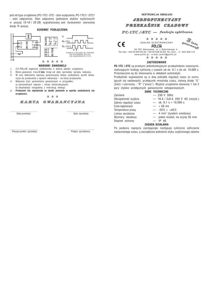 16 15 18 26 25 28 PC-2TC 16 15 18 PC-1TCB JEDNOFUNKCYJNY PRZEKAŹNIK PC-1TC /-2TC _ CZASOWY funkcja cykliczna U R(-1TC) ZAKŁAD ELEKTRONICZNY R(-1TC1) A1 B1 A2 PC-1TC INSTRUKCJA OBSŁUGI T T FUNKCJA CYKLICZNA ZE STARTEM OD WYŁĄCZENIA (PC-1TC) LUB ZAŁĄCZENIA (PC-1TC1) 3 la gw a ra ta n cj i 02-793 Warszawa, ul. J. Żabińskiego 4 Tel./fax: +48 22 649 94 90; +48 22 648 55 58; Tel. kom.: 0 - 502 208 115 www.pollin.pl, e-mail: [email protected] L N A1 A2 ODB. jest od typu urządzenia (PC-1TC/ -2TC - stan wyłączenia; PC-1TC1/ -2TC1 - stan załączenia). Stan załączenia (położenie styków wyjściowych w pozycji 15-18 i 25-28) sygnalizowany jest świeceniem czerwonej diody R - praca). SCHEMAT PODŁĄCZENIA WARUNKI GWARANCJI 1. 2. 3. 4. 5. Z.E. POLLIN zapewnia użytkownika o dobrej jakości urządzenia. Okres gwarancji trwa 3 lata licząc od daty sprzedaży sprzętu nabywcy. W celu dokonania naprawy gwarancyjnej należy uszkodzony wyrób dostarczyć do producenta z opisem reklamacji – na koszt producenta. Nabywca traci uprawnienia gwarancyjne w przypadku : a) samowolnych napraw i zmian konstrukcyjnych, b) eksploatacji niezgodnej z instrukcją obsługi. Producent nie odpowiada za skutki powstałe w wyniku uszkodzenia się urządzenia. K A R TA G WA R A N C Y J N A ............................................ Data produkcji ............................................ Data sprzedaży ............................................. Pieczęć punktu sprzedaży ............................................ Podpis sprzedawcy ZASTOSOWANIE PC-1TC /-2TC są prostymi jednofunkcyjnymi przekaźnikami czasowymi, realizującymi funkcję cykliczną z czasem od ok. 0,1 s do ok. 10.000 s. Przeznaczone są do stosowania w układach automatyki. Przekaźniki wyposażone są w dwa pokrętła regulacji czasu (o sumujących się nastawach), przełącznik mnożnika czasu, zieloną diodę “U” (sieć) i czerwoną - “R” (“praca”). Wyjście urządzenia stanowią 1 lub 2 pary styków przełącznych galwanicznie odseparowanych. DANE TECHNICZNE –– 230 V 50Hz Zasilanie –– 16 A / 2x8 A 250 V AC (rezyst.) Obciążalność wyjścia –– ok. 0,1 s ÷ 10.000 s Zakres regulacji czasu –– < 50 ms Czas regeneracji –– -20°C ÷ +45°C Temperatura pracy –– 4 mm2 (system windowy) Listwa zaciskowa –– jeden moduł, na szynę 35 mm Wymiary obudowy –– IP 40 Stopień ochrony ZASADA DZIAŁANIA Po podaniu napięcia zasilającego następuje cykliczne odliczanie nastawionego czasu, a początkowe położenie styku wyjściowego zależne