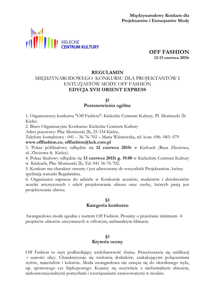 Międzynarodowy Konkurs dla Projektantów i Entuzjastów Mody OFF FASHION 12-13 czerwca 2015r REGULAMIN MIĘDZYNARODOWEGO KONKURSU DLA PROJEKTANTÓW I ENTUZJASTÓW MODY OFF FASHION EDYCJA XVII ORIENT EXPRESS §1 Postanowienia ogólne 1. Organizatorzy konkursu "Off Fashion": Kieleckie Centrum Kultury, Pl. Moniuszki 2b Kielce. 2. Biuro Organizacyjne Konkursu: Kieleckie Centrum Kultury Adres pocztowy: Plac Moniuszki 2b, 25-334 Kielce, Telefony kontaktowe : 041 – 36-76-702 – Maria Wiśniewska, tel. kom. 696- 083- 079 www.offfashion.eu, [email protected] 3. Pokaz półfinałowy odbędzie się 12 czerwca 2015r w Kielcach (Baza Zbożowa, ul. Zbożowa 4; Kielce). 4. Pokaz finałowy odbędzie się 13 czerwca 2015r g. 19.00 w Kieleckim Centrum Kultury w Kielcach, Plac Moniuszki 2b, Tel. 041 36-76-702. 5. Konkurs ma charakter otwarty i jest adresowany do wszystkich Projektantów, którzy spełniają warunki Regulaminu. 6. Organizator zaprasza do udziału w Konkursie uczniów, studentów i absolwentów uczelni artystycznych i szkół projektowania ubioru oraz osoby, których pasją jest projektowanie ubioru. §2 Kategoria konkursu Awangardowa moda zgodna z nurtem Off Fashion. Prosimy o przesłanie minimum 4 projektów ubiorów utrzymanych w offowym, niebanalnym klimacie. §3 Kryteria oceny Off Fashion to nurt podkreślający wielobarwność tłumu. Przeciwstawia się unifikacji i szarości ulicy. Charakteryzuje się wielością dodatków, zaskakującymi połączeniami stylów, materiałów i kolorów. Moda awangardowa nie zawęża się do określonego stylu, np. sportowego czy hiphopowego. Kojarzy się oczywiście z nieformalnym ubiorem, niekonwencjonalnymi pomysłami i rozwiązaniami zastosowanymi w modzie. Zgodnie z tymi założeniami przyjęto następujące kryteria oceny: 1. staranność wykonania projektów 2. dobór kolorów i dodatków 3. oryginalność kompozycji i formy ubioru 4. poszukiwanie nowych rozwiązań w ubiorze 5. widowiskowość prezentacji §4 Etapy Konkursu i warunki przystąpienia do Konkursu 1. Przesłanie do dnia 25 maja 2015r zgłoszenia wraz ze zdjęciami lub szkicami projektów konkursowych w ilości min. 4 modeli własnych realizacji na adres: Kieleckie Centrum Kultury Plac Moniuszki 2b, 25-334 Kielce, z dopiskiem Biuro Konkursu OFF Fashion lub pocztą elektroniczną na adres: [email protected] 2. Do dnia 29 maja 2015r Komisja Selekcyjna z nadesłanych zdjęć lub rysunków przedstawiających projekty wybiera max 120 najlepszych i informuje autorów o zakwalifikowaniu się do półfinału, który odbywa się w Kielcach. 3.W dniu 12 czerwca 2015r w godz. 8.00 - 14.00 w Kielcach (Baza Zbożowa, ul. Zbożowa 4, Kielce) odbywa się rejestracja uczestników półfinałów. 4. W dniu 12 czerwca 2015r w godz. 18.00 – 21.00 w Kielcach (Baza Zbożowa; ul. Zbożowa 4 Kielce) odbywa się półfinał Konkursu wyłaniający 20 finalistów (każdy uczestnik półfinału prezentuje max. 4 projekty). 5. W dniu 13 czerwca 2015r g. 19.00 – w Kieleckim Centrum Kultury odbywa się uroczysta Gala Finałowa Konkursu. 6. Uczestnicy wcześniejszych edycji Konkursu z kolekcjami pokazywanymi wcześniej w ramach OFF FASHION nie mogą startować w Konkursie. 7. W konkursie mogą brać udział duety. §5 Jury Konkursu 1. Organizator Konkursu powołuje jury składające się z osób zajmujących się modą i mających doświadczenie w dziedzinie mody i projektowania. 2. Jury pracuje w trzech etapach: wyboru prac zakwalifikowanych, eliminacji półfinałowych oraz finału konkursu. 3. Zespół oceniający pracuje niejawnie i jego decyzje są ostateczne i nie podlegają odwołaniom. §6 Informacje dodatkowe dla uczestników Konkursu OFF FASHION 1. Organizator Konkursu zapewnia projektantom, którzy zakwalifikowali się do pokazu półfinałowego, 1 nocleg z 12 czerwca/13 czerwca 2015r. oraz nocleg dla 20 projektantów zakwalifikowanych do finału z 13/14 czerwca 2015r . 2. Uczestnicy Konkursu przyjeżdżają do Kielc na koszt własny. 3. Uczestnicy Konkursu podczas półfinałów mogą prezentować swoje projekty osobiście lub poprzez własnych modeli lub skorzystać z modeli zapewnionych przez Organizatora. Podczas finału projekty 20 finalistów będą prezentowane wyłącznie poprzez modelki lub modeli zapewnionych przez Organizatora. 4. Uczestnicy pokazów półfinałowych w piątek tj. 12 czerwca 2015r zobowiązani są do zaprezentowania swoich projektów do własnego podkładu muzycznego na płycie CD trwającego max 3 min. (format płyty – CD audio). 5. Uczestnicy pokazu półfinałowego i finałowego we wszystkich sprawach związanych z prezentacją swojej kolekcji powinni kontaktować się z koordynatorem pokazów. 6. Organizator Konkursu zastrzega sobie prawo do bezpłatnej reprodukcji zdjęć dostarczonych przez Uczestników w Katalogu pokonkursowym oraz zdjęć z Konkursu w prasie, telewizji oraz innych publikacjach pokonkursowych, łącznie z wydawnictwami komercyjnymi. 7. Organizatorzy nie odsyłają nadesłanych prac. §7 Nagrody i wyróżnienia 1. Jury Konkursu przyznaje nagrody za: I miejsce : tytuł najlepszego projektanta offowego i statuetka Prezydenta Kielc, wykonana w brązie przez artystę rzeźbiarza S. Micka : nagroda pieniężna – 15. 000 PLN II miejsce : nagroda pieniężna – 6. 000 PLN III miejsce : nagroda pieniężna - 3 000 PLN - ufundowana przez Prezesa Targów Kielce 2. Oprócz nagród regulaminowych swoje wyróżnienia mogą przyznać: sponsorzy i media patronujące konkursowi wg zasad jednolitych dla wszystkich. ORGANIZATOR/BIURO KONKURSU Kieleckie Centrum Kultury Plac Moniuszki 2b 25-334 Kielce 41-36-76-702 OSOBA KONTAKTOWA: Wiśniewska Maria [email protected] 41 36-76-702; 696-08-30-79