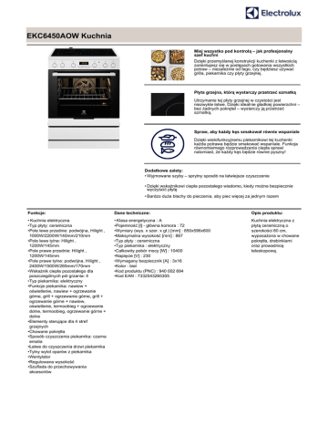 EKC6450AOW Kuchnia Miej wszystko pod kontrolą – jak profesjonalny szef kuchni Dzięki przemyślanej konstrukcji kuchenki z łatwością zorientujesz się w postępach gotowania wszystkich potraw – niezależnie od tego, czy będziesz używać grilla, piekarnika czy płyty grzejnej. Płyta grzejna, którą wystarczy przetrzeć szmatką Utrzymanie tej płyty grzejnej w czystości jest niezwykle łatwe. Dzięki idealnie gładkiej powierzchni – bez żadnych pokręteł – wystarczy ją przetrzeć szmatką. Spraw, aby każdy kęs smakował równie wspaniale Dzięki wielofunkcyjnemu piekarnikowi tej kuchenki każda potrawa będzie smakować wspaniale. Funkcja równomiernego rozprowadzania ciepła sprawi natomiast, że każdy kęs będzie równie pyszny! Dodatkowe zalety: • Wyjmowane szyby – sprytny sposób na łatwiejsze czyszczenie • Dzięki wskażnikowi ciepła pozostałego wiadomo, kiedy można bezpiecznie wyczyścić płytę • Bardzo duże blachy do pieczenia, aby piec więcej za jednym razem Funkcje: Dane techniczne: Opis produktu: • Kuchnia elektryczna •Typ płyty: ceramiczna •Pole lewe przednie: podwójna, Hilight , 1000W/2200W/140mm/210mm •Pole lewe tylne: Hilight , 1200W/145mm •Pole prawe przednie: Hilight , 1200W/145mm •Pole prawe tylne: podwójna, Hilight , 2400W/1500W/265mm/170mm •Wskaźnik ciepła pozostałego dla poszczególnych pól grzania: 4 •Typ piekarnika: elektryczny •Funkcje piekarnika: nawiew + oświetlenie, nawiew + ogrzewanie górne, grill + ogrzewanie górne, grill + ogrzewanie górne + nawiew, oświetlenie, termoobieg + ogrzewanie dolne, termoobieg, ogrzewanie górne + dolne •Elementy sterujące dla 4 stref grzejnych •Chowane pokrętła •Sposób czyszczenia piekarnika: czarna emalia •Łatwe do czyszczenia drzwi piekarnika •Tylny wylot oparów z piekarnika •Wentylator •Regulowana wysokość •Szuflada do przechowywania akcesoriów • Klasa energetyczna : A •Pojemność [l] - główna komora : 72 •Wymiary (wys. x szer. x gł.) [mm] : 850x596x600 •Maksymalna wysokość [mm] : 867 •Typ płyty : ceramiczna •Typ piekarnika : elektryczny •Całkowity pobór mocy [W] : 10400 •Napięcie [V] : 230 •Wymagany bezpiecznik [A] : 3x16 •Kolor : biel •Kod produktu (PNC) : 940 002 694 •Kod EAN : 7332543265305 Kuchnia elektryczna z płytą ceramiczną o szerokości 60 cm, wyposażona w chowane pokrętła, drabinkiami oraz prowadnicę teleskopową.