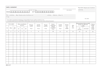 KARTA ZASI¸KOWA* Poprzednie ubezpieczenie chorobowe ................................................................................................. ....................... Nazwisko i imi´ ubezp. data urodzenia PESEL usta∏o dnia . . . . . . . . . . . . . . . . . . . . . ............................... NIP** Wym. zatrudniony – obj´ty ubezpieczeniem chorobowym od . . . . . . . . . . . . . . . . . . . . . . . zwolniony – wy∏àczony z ubezp. dn . . . . . . . . . . . . . . . . . . . . . . . Uwagi . . . . . . . . . . . . . . . . . . . . . . . . . . . . . . . . . . . . . . . . . . . . . . . . . . . . . . . . . . . . . . . . . . . . . . . . . . . . . . . . . . . . . . . . . . . . . . . . . . . . . . . . . . . . . . . . . . . . . . . . .............................................................................................................................. data, podpis ** Przy wyp∏acie wynagrodzenia przys∏ugujàcego z tytu∏u niezdolnoÊci do pracy wype∏nia si´ rubryki 4-6, 13-16. ** W razie gdy ubezpieczonemu nie nadano PESEL i NIP albo jednego z nich, nale˝y wpisaç seri´ i numer dowodu osobistego lub paszportu. Lista wyp∏at Okres niezdolnoÊci do pracy Dzienny zasi∏ek Zasi∏ek (brutto) Przypis podatku Nr Data Nr poz. od do dni z∏, gr z∏, gr z∏, gr 1 2 3 4 5 6 7 8 9 ZUS Z-17 Kwota potràconej zaliczki na podatek z∏, gr 10 Zasi∏ek (netto) z∏, gr Rodzaj i procent zasi∏ku Kod literowy 11 12 13 Wynagrodzenie lub przychód przyj´ty do obliczenia zasi∏ku za miesiàce przeci´tny Z okresu zasi∏kowego wyp∏ac. za dni 14 15 16 Lista wyp∏at Okres niezdolnoÊci do pracy Dzienny zasi∏ek Zasi∏ek (brutto) Przypis podatku Nr Data Nr poz. od do dni z∏, gr z∏, gr z∏, gr 1 2 3 4 5 6 7 8 9 ZUS Z-17 Kwota potràconej zaliczki na podatek z∏, gr 10 Zasi∏ek (netto) z∏, gr Rodzaj i procent zasi∏ku Kod literowy 11 12 13 Wynagrodzenie lub przychód przyj´ty do obliczenia zasi∏ku za miesiàce przeci´tny Z okresu zasi∏kowego wyp∏ac. za dni 14 15 16