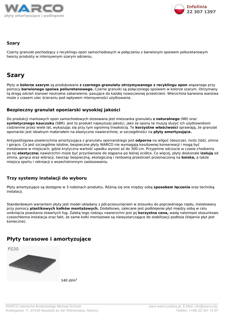 Szary Czarny granulat pochodzący z recyklingu opon samochodowych w połączeniu z barwionym spoiwem poliuretanowym tworzy produkty w intensywnym szarym odcieniu. Szary Płyty w kolorze szarym są produkowane z czarnego granulatu otrzymywanego z recyklingu opon wiązanego przy pomocy barwionego spoiwa poliuretanowego. Czarne granulki są połączonego spoiwem w kolorze szarym. Otrzymany tą drogą odcień stanowi neutralne zabarwienie, pasujące do każdej nowoczesnej przestrzeni. Wierzchnia barwiona warstwa może z czasem ulec ścieraniu pod wpływem intensywności użytkowania. Bezpieczny granulat oponiarski wysokiej jakości Do produkcji markowych opon samochodowych stosowana jest mieszanka granulatu z naturalnego (NR) oraz syntetycznego kauczuku (SBR). Jest to produkt najwyższej jakości, jako że opony te muszą służyć ich użytkownikom codziennie przez wiele lat, wykazując się przy tym ogromną trwałością. Te korzystne właściwości sprawiają, że granulat oponiarski jest idealnym materiałem na elastyczne nawierzchnie, w szczególności na płyty amortyzujące. Antypoślizgowa powierzchnia amortyzująca z granulatu oponiarskiego jest odporna na wilgoć (deszcze), mróz (lód), zimno i gorąco. Co jest szczególnie istotne, bezpieczne płyty WARCO nie wymagają kosztownej konserwacji i mogą być instalowane w miejscach, gdzie krytyczna wartość upadku wynosi aż do 300 cm. Przyjemne odczucie w czasie chodzenia po tej elastycznej nawierzchni może być przyrównane do stąpania po leśnej ściółce. Co więcej, płyty doskonale izolują od zimna, gorąca oraz wibracji, tworząc bezpieczną, ekologiczną i rentowną przestrzeń przeznaczoną na boiska, a także miejsca sportu i rekreacji o wszechstronnym zastosowaniu. Trzy systemy instalacji do wyboru Płyty amortyzujące są dostępne w 3 rodzinach produktu. Różnią się one między sobą sposobem łączenia oraz techniką instalacji. Standardowym wariantem płyty jest model układany z pół-przesunięciem w stosunku do poprzedniego rzędu, instalowany przy pomocy plastikowych kołków montażowych. Dodatkowo, zalecane jest podklejenie płyt między sobą w celu uniknięcia powstania otwartych fug. Zaletą tego rodzaju nawierzchni jest jej korzystna cena, wadą natomiast stosunkowo czasochłonna instalacja oraz fakt, że same kołki montażowe są niewystarczające do stabilizacji podłoża (klejenie płyt jest konieczne). Płyty tarasowe i amortyzujące 140 zł/m2 WARCO elastische Bodenbeläge Michael Schladt Andergasse 17, 67434 Neustadt an der Weinstrasse, Niemcy www.warco-polska.pl, E-Mail: [email protected], Telefon: (+48) 22 307 13 97 160 zł/m2 210 zł/m2 314 zł/m2 340 zł/m2 Wybierz produkt i przejdź do sklepu! System pióro-wpust stanowi trwałe, połączenie kształtowe, nie wymagające dodatkowego wsparcia np. w postaci klejenia. Na bokach płyt wyprofilowane są elementy (tzw. listwy przylgowe), które nakładają się na siebie krawędziami w procesie instalacji - wystające pióro łączy się z pasującym do niego wpustem tworząc stabilne połączenie między płytami. Zaletą tego systemu jest tradycyjny wygląd, trwałe łączenie oraz niski koszt montażu. Płyty tarasowe i amortyzujące 164 zł/m2 188 zł/m2 WARCO elastische Bodenbeläge Michael Schladt Andergasse 17, 67434 Neustadt an der Weinstrasse, Niemcy www.warco-polska.pl, E-Mail: [email protected], Telefon: (+48) 22 307 13 97 Wybierz produkt i przejdź do sklepu! System łączenia na zamek stanowi najbezpieczniejszym sposobem montażu, bez konieczności klejenia i ryzyka uszkodzenia w momencie instalacji lub reinstalacji. W tym przypadku, wystarczy dopasować ze sobą płyty przy pomocy wyprofilowanych na ich bokach trójwymiarowych zębów. System ten jest na tyle trwały, że zabezpiecza on przed potencjalnymi aktami wandalizmu, a także stanowi wyjątkowo stabilne połączenie. Zaletami systemu na zamek są jego niezwykła wytrzymałość, prostota obsługi oraz niskie koszty instalacji. Płyty tarasowe i amortyzujące 116 zł/m2 165 zł/m2 zł/m2 193 Wybierz produkt i przejdź do sklepu! WARCO elastische Bodenbeläge Michael Schladt Andergasse 17, 67434 Neustadt an der Weinstrasse, Niemcy Powered by TCPDF (www.tcpdf.org) www.warco-polska.pl, E-Mail: [email protected], Telefon: (+48) 22 307 13 97