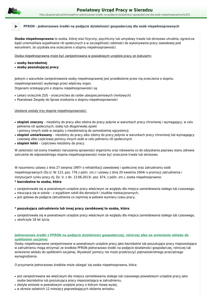Powiatowy Urząd Pracy w Sieradzu http://pupsieradz.pl/strona/pfron-jednorazowe-srodki-na-podjecie-dzialalnosci-gospodarczej-dla-osob-niepelnosprawnych/203 PFRON - jednorazowe środki na podjęcie działalności gospodarczej dla osób niepełnosprawnych Osoba niepełnosprawna to osoba, której stan fizyczny, psychiczny lub umysłowy trwale lub okresowo utrudnia, ogranicza bądź uniemożliwia wypełnianie ról społecznych a w szczególności zdolności do wykonywania pracy zawodowej pod warunkiem, że uzyskała ona orzeczenie o stopniu niepełnosprawności. Osoba niepełnosprawna może być zarejestrowana w powiatowym urzędzie pracy ze statusem: ● ● osoby bezrobotnej osoby poszukującej pracy Jednym z warunków zarejestrowania osoby niepełnosprawnej jest przedłożenie przez nią orzeczenia o stopniu niepełnosprawności wydanego przez właściwy organ. Organami orzekającymi o stopniu niepełnosprawności są: ● ● Lekarz orzecznik ZUS – orzecznictwo do celów ubezpieczeniowych (rentowych) Powiatowe Zespoły do Spraw orzekania o stopniu niepełnosprawności Ustalone zostały trzy stopnie niepełnosprawności: ● ● ● stopień znaczny – niezdolny do pracy albo zdolna do pracy jedynie w warunkach pracy chronionej i wymagający, w celu pełnienia ról społecznych, stałej lub długotrwałej opieki i pomocy innych osób w związku z niezdolnością do samodzielnej egzystencji. stopień umiarkowany – niezdolny do pracy albo zdolny do pracy jedynie w warunkach pracy chronionej lub wymagający czasowej albo częściowej pomocy innych osób w celu pełnieniu ról społecznych. stopień lekki – częściowo niezdolny do pracy. W zależności od oceny trwałości naruszenia sprawności organizmu oraz rokowania co do odzyskania poprawy stanu zdrowia zaliczenie do odpowiedniego stopnia niepełnosprawności może być orzeczone trwale lub okresowo. W rozumieniu ustawy z dnia 27 sierpnia 1997r o rehabilitacji zawodowej i społecznej oraz zatrudnianiu osób niepełnosprawnych (Dz.U. Nr 123, poz. 776 z późn. zm.) i ustawy z dnia 20 kwietnia 2004r o promocji zatrudnienia i instytucjach rynku pracy (tj. Dz. U. z dn. 13.06.2013r. poz. 674, z późn. zm.), osoba niepełnosprawna: * bezrobotna to osoba, która: ● ● ● zarejestrowała się w powiatowym urzędzie pracy właściwym ze względu dla miejsca zameldowania stałego lub czasowego, nieucząca się w szkole – z wyjątkiem szkół dla dorosłych i studiów niestacjonarnych, jest gotowa do podjęcia zatrudnienia co najmniej w połowie wymiaru czasu pracy, * poszukująca zatrudnienia lub innej pracy zarobkowej to osoba, która: ● ● zarejestrowała się w powiatowym urzędzie pracy właściwym ze względu dla miejsca zameldowania stałego lub czasowego, ukończyła 18 lat życia, Jednorazowe środki z PFRON na podjęcie działalności gospodarczej, rolniczej albo na wniesienie wkładu do spółdzielni socjalnej Osoby niepełnosprawne zarejestrowane w powiatowym urzędzie pracy jako bezrobotne lub poszukujące pracy niepozostające w zatrudnieniu mogą otrzymać ze środków PFRON jednorazowo środki na podjęcie działalności gospodarczej, rolniczej lub wniesienie wkładu do spółdzielni socjalnej. Wysokość pomocy nie może przekroczyć piętnastokrotnego przeciętnego wynagrodzenia. O przyznanie jednorazowo środków może ubiegać się osoba niepełnosprawna, która: ● ● ● jest zarejestrowana we właściwym dla miejsca zameldowania stałego lub czasowego powiatowym urzędzie pracy jako osoba bezrobotna lub poszukująca pracy niepozostająca w zatrudnieniu, złożyła wniosek w powiatowym urzędzie pracy o którym mowa wyżej, w okresie ostatnich 12 miesięcy poprzedzających złożenie wniosku: ❍ ❍ ● nie prowadziła działalności gospodarczej albo rolniczej wymienionej we wniosku, nie była członkiem spółdzielni socjalnej do której zamierza przystąpić, nie otrzymała wcześniej środków publicznych na podjęcie działalności gospodarczej, rolniczej albo wniesienie wkładu do spółdzielni socjalnej. Osoba niepełnosprawna zobowiązana jest prowadzić działalność gospodarczą, rolniczą lub być członkiem spółdzielni socjalnej przez okres co najmniej 24 miesięcy z uwzględnieniem okresów choroby, powołania do odbycia zasadniczej lub zastępczej służby wojskowej lub korzystania ze świadczenia rehabilitacyjnego. Wnioskodawca zobowiązany jest do pobrania odpowiedniego formularza wniosku wraz z załącznikami - „Wn-O” tj. wniosek osoby niepełnosprawnej o przyznanie środków na podjęcie działalności gospodarczej, rolniczej albo na wniesienie wkładu do spółdzielni socjalnej, wraz z wymaganymi załącznikami) ze strony internetowej Urzędu (www.pupsieradz.pl) i złożenia go w urzędzie w sposób prawidłowo wypełniony. UPRAWNIENIA PRACOWNIKA NIEPEŁNOSPRAWNEGO Czas pracy osoby niepełnosprawnej uzależniony jest od orzeczenia stopnia niepełnosprawności: ● ● przy lekkim stopniu niepełnosprawności, czas pracy nie może przekraczać 8 godzin na dobę i 40 godzin tygodniowo, przy znacznym stopniu niepełnosprawności, czas pracy nie może przekraczać 7 godzin na dobę i 35 godzin tygodniowo. Osoba niepełnosprawna nie może być zatrudniona w porze nocnej i w godzinach nadliczbowych. Zakazu tego nie stosuje się w dwóch przypadkach: ● ● w stosunku do osób zatrudnionych przy pilnowaniu, w przypadku gdy na wniosek osoby zatrudnionej lekarz przeprowadzający badanie profilaktyczne lub lekarz sprawujący opiekę nad daną osobą wyrazi na to zgodę. Koszt tych badań ponosi pracodawca. Osoba niepełnosprawna ma prawo do dodatkowej przerwy w pracy na gimnastykę usprawniającą lub wypoczynek (15 minut). Osobom mającym znaczny i umiarkowany stopień niepełnosprawności przysługuje dodatkowy urlop wypoczynkowy wynoszący 10 dni roboczych. Podstawa prawna: 1. Ustawa z dnia 27 sierpnia 1997r o rehabilitacji zawodowej i społecznej oraz zatrudnianiu osób niepełnosprawn